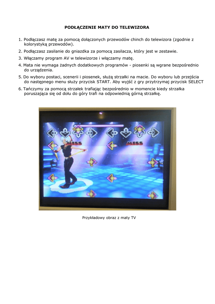 PODŁĄCZENIE MATY DO TELEWIZORA 1. Podłączasz matę za pomocą dołączonych przewodów chinch do telewizora (zgodnie z kolorystyką przewodów). 2. Podłączasz zasilanie do gniazdka za pomocą zasilacza, który jest w zestawie. 3. Włączamy program AV w telewizorze i włączamy matę. 4. Mata nie wymaga żadnych dodatkowych programów - piosenki są wgrane bezpośrednio do urządzenia. 5. Do wyboru postaci, scenerii i piosenek, służą strzałki na macie. Do wyboru lub przejścia do następnego menu służy przycisk START. Aby wyjść z gry przytrzymaj przycisk SELECT 6. Tańczymy za pomocą strzałek trafiając bezpośrednio w momencie kiedy strzałka poruszająca się od dołu do góry trafi na odpowiednią górną strzałkę. Przykładowy obraz z maty TV