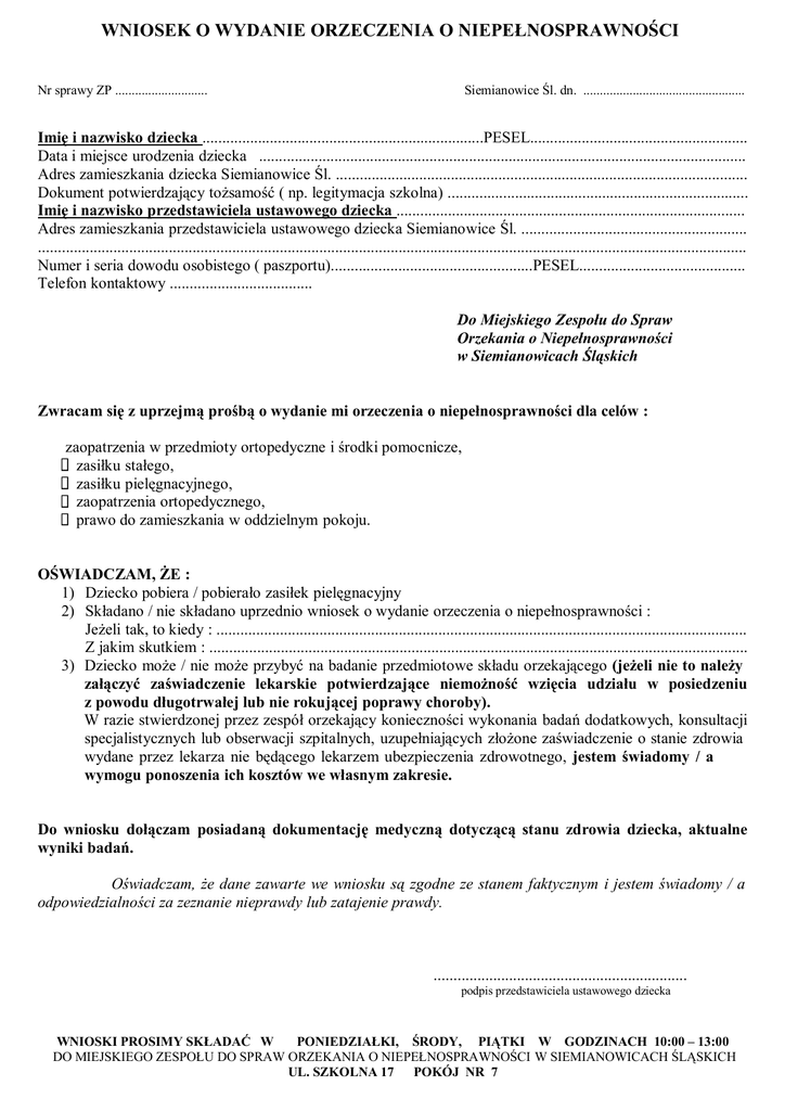 WNIOSEK O WYDANIE ORZECZENIA O NIEPEŁNOSPRAWNOŚCI Nr sprawy ZP ............................ Siemianowice Śl. dn. ................................................. Imię i nazwisko dziecka .......................................................................PESEL....................................................... Data i miejsce urodzenia dziecka ........................................................................................................................... Adres zamieszkania dziecka Siemianowice Śl. ........................................................................................................ Dokument potwierdzający tożsamość ( np. legitymacja szkolna) ............................................................................ Imię i nazwisko przedstawiciela ustawowego dziecka ........................................................................................ Adres zamieszkania przedstawiciela ustawowego dziecka Siemianowice Śl. ......................................................... ................................................................................................................................................................................... Numer i seria dowodu osobistego ( paszportu)...................................................PESEL.......................................... Telefon kontaktowy .................................... Do Miejskiego Zespołu do Spraw Orzekania o Niepełnosprawności w Siemianowicach Śląskich Zwracam się z uprzejmą prośbą o wydanie mi orzeczenia o niepełnosprawności dla celów : zaopatrzenia w przedmioty ortopedyczne i środki pomocnicze, zasiłku stałego, zasiłku pielęgnacyjnego, zaopatrzenia ortopedycznego, prawo do zamieszkania w oddzielnym pokoju. OŚWIADCZAM, ŻE : 1) Dziecko pobiera / pobierało zasiłek pielęgnacyjny 2) Składano / nie składano uprzednio wniosek o wydanie orzeczenia o niepełnosprawności : Jeżeli tak, to kiedy : ...................................................................................................................................... Z jakim skutkiem : ........................................................................................................................................ 3) Dziecko może / nie może przybyć na badanie przedmiotowe składu orzekającego (jeżeli nie to należy załączyć zaświadczenie lekarskie potwierdzające niemożność wzięcia udziału w posiedzeniu z powodu długotrwałej lub nie rokującej poprawy choroby). W razie stwierdzonej przez zespół orzekający konieczności wykonania badań dodatkowych, konsultacji specjalistycznych lub obserwacji szpitalnych, uzupełniających złożone zaświadczenie o stanie zdrowia wydane przez lekarza nie będącego lekarzem ubezpieczenia zdrowotnego, jestem świadomy / a wymogu ponoszenia ich kosztów we własnym zakresie. Do wniosku dołączam posiadaną dokumentację medyczną dotyczącą stanu zdrowia dziecka, aktualne wyniki badań. Oświadczam, że dane zawarte we wniosku są zgodne ze stanem faktycznym i jestem świadomy / a odpowiedzialności za zeznanie nieprawdy lub zatajenie prawdy. ................................................................ podpis przedstawiciela ustawowego dziecka WNIOSKI PROSIMY SKŁADAĆ W PONIEDZIAŁKI, ŚRODY, PIĄTKI W GODZINACH 10:00 – 13:00 DO MIEJSKIEGO ZESPOŁU DO SPRAW ORZEKANIA O NIEPEŁNOSPRAWNOŚCI W SIEMIANOWICACH ŚLĄSKICH UL. SZKOLNA 17 POKÓJ NR 7