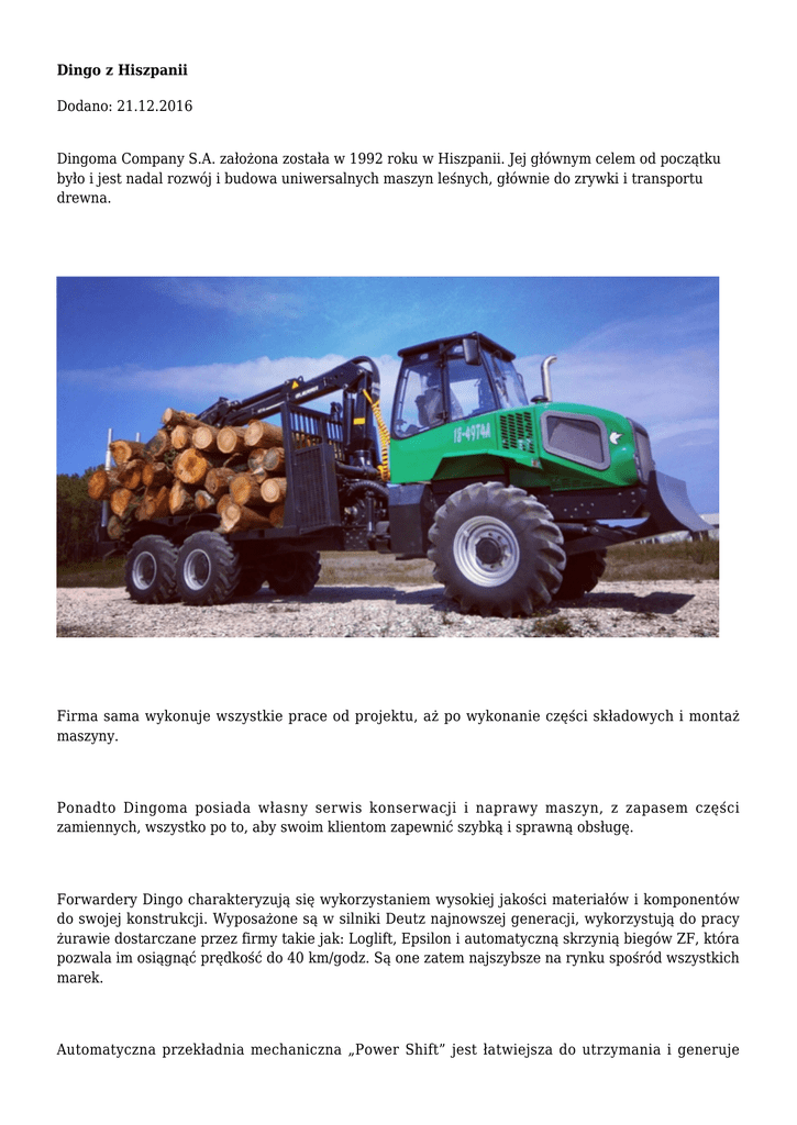 Dingo z Hiszpanii Dodano: 21.12.2016 Dingoma Company S.A. założona została w 1992 roku w Hiszpanii. Jej głównym celem od początku było i jest nadal rozwój i budowa uniwersalnych maszyn leśnych, głównie do zrywki i transportu drewna. Firma sama wykonuje wszystkie prace od projektu, aż po wykonanie części składowych i montaż maszyny. Ponadto Dingoma posiada własny serwis konserwacji i naprawy maszyn, z zapasem części zamiennych, wszystko po to, aby swoim klientom zapewnić szybką i sprawną obsługę. Forwardery Dingo charakteryzują się wykorzystaniem wysokiej jakości materiałów i komponentów do swojej konstrukcji. Wyposażone są w silniki Deutz najnowszej generacji, wykorzystują do pracy żurawie dostarczane przez firmy takie jak: Loglift, Epsilon i automatyczną skrzynią biegów ZF, która pozwala im osiągnąć prędkość do 40 km/godz. Są one zatem najszybsze na rynku spośród wszystkich marek. Automatyczna przekładnia mechaniczna „Power Shift” jest łatwiejsza do utrzymania i generuje niższe koszty zakupu. Nie przegrzewa się, ma wyższy moment obrotowy i prędkość prawie dwukrotnie wyższą w porównaniu do standardowych układów hydraulicznych montowanych w innych forwarderach. W ofercie znajdują się dwa modele. AD18 to mniejsza i bardziej kompaktowa maszyna, posiadająca czterocylindrowy silnik z turbodoładowaniem o mocy 154 KM. AD24 to forwarder większy, bardziej wydajny, z sześciocylindrowym silnikiem, osiągającym moc 215 KM. Dodatkowy osprzęt, zabudowa, żuraw do każdego z nich jest montowany na indywidualne żądanie klienta. Oba modele oferowane są dodatkowo jeszcze w dwóch wariantach – sześcio- oraz ośmiokołowej. JH Komentarze (0) Nie dodano jeszcze żadnego komentarza.