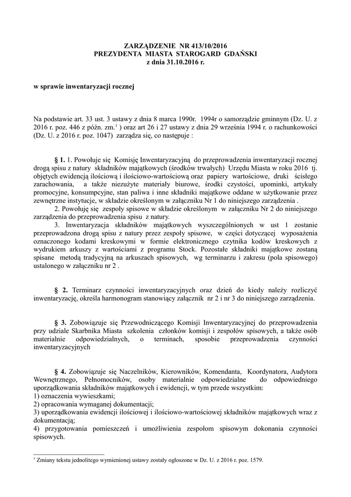 ZARZĄDZENIE NR 413/10/2016 PREZYDENTA MIASTA STAROGARD GDAŃSKI z dnia 31.10.2016 r. w sprawie inwentaryzacji rocznej Na podstawie art. 33 ust. 3 ustawy z dnia 8 marca 1990r. 1994r o samorządzie gminnym (Dz. U. z 2016 r. poz. 446 z późn. zm. 1 ) oraz art 26 i 27 ustawy z dnia 29 września 1994 r. o rachunkowości (Dz. U. z 2016 r. poz. 1047) zarządza się, co następuje : § 1. 1. Powołuje się Komisję Inwentaryzacyjną do przeprowadzenia inwentaryzacji rocznej drogą spisu z natury składników majątkowych (środków trwałych) Urzędu Miasta w roku 2016 tj. objętych ewidencją ilościową i ilościowo-wartościową oraz papiery wartościowe, druki ścisłego zarachowania, a także niezużyte materiały biurowe, środki czystości, upominki, artykuły promocyjne, konsumpcyjne, stan paliwa i inne składniki majątkowe oddane w użytkowanie przez zewnętrzne instytucje, w składzie określonym w załączniku Nr 1 do niniejszego zarządzenia . 2. Powołuję się zespoły spisowe w składzie określonym w załączniku Nr 2 do niniejszego zarządzenia do przeprowadzenia spisu z natury. 3. Inwentaryzacja składników majątkowych wyszczególnionych w ust 1 zostanie przeprowadzona drogą spisu z natury przez zespoły spisowe, w części dotyczącej wyposażenia oznaczonego kodami kreskowymi w formie elektronicznego czytnika kodów kreskowych z wydrukiem arkuszy z wartościami z programu Stock. Pozostałe składniki majątkowe zostaną spisane metodą tradycyjną na arkuszach spisowych, wg terminarzu i zakresu (pola spisowego) ustalonego w załączniku nr 2 . § 2. Terminarz czynności inwentaryzacyjnych oraz dzień do kiedy należy rozliczyć inwentaryzację, określa harmonogram stanowiący załącznik nr 2 i nr 3 do niniejszego zarządzenia. § 3. Zobowiązuje się Przewodniczącego Komisji Inwentaryzacyjnej do przeprowadzenia przy udziale Skarbnika Miasta szkolenia członków komisji i zespołów spisowych, a także osób materialnie odpowiedzialnych, o terminach, sposobie przeprowadzenia czynności inwentaryzacyjnych § 4. Zobowiązuje się Naczelników, Kierowników, Komendanta, Koordynatora, Audytora Wewnętrznego, Pełnomocników, osoby materialnie odpowiedzialne do odpowiedniego uporządkowania składników majątkowych i ewidencji, w tym przede wszystkim: 1) oznaczenia wywieszkami; 2) opracowania wymaganej dokumentacji; 3) uporządkowania ewidencji ilościowej i ilościowo-wartościowej składników majątkowych wraz z dokumentacją; 4) przygotowania pomieszczeń i umożliwienia zespołom spisowym dokonania czynności spisowych. 1 Zmiany tekstu jednolitego wymienionej ustawy zostały ogłoszone w Dz. U. z 2016 r. poz. 1579. § 5. Zobowiązuje się wszystkich pracowników materialnie odpowiedzialnych, członków Komisji Inwentaryzacyjnej i zespołów spisowych do ewentualnego przesunięcia zaplanowanych urlopów na inny termin tj. do czasu zakończenia czynności inwentaryzacyjnych. § 6. 1. Dokumenty ze spisu (arkusze spisowe) wydawane będą przez Przewodniczącego Komisji Inwentaryzacyjnej dla pól spisowych spisywanych w tradycyjny sposób w formie papierowej oraz generowane przez program STOCK wraz z wyceną. Odpowiednie arkusze przekazywane będą do sprawdzenia z dokumentacją źródłową u Skarbnika Miasta lub Sekretarza Miasta w celu wyceny lub ustalenia różnic inwentaryzacyjnych. 2. W wyniku inwentaryzacji rozpatrzone oraz rozliczone nadwyżki i niedobory zatwierdzone przez Prezydenta Miasta powinny być ujęte w księgach rachunkowych okresu sprawozdawczego. § 7. Przewodniczący Komisji Inwentaryzacyjnej lub wyznaczona przez niego osoba z komisji inwentaryzacyjnej zamyka w programie STOCK proces inwentaryzacji z natury pozostałych środków trwałych (ilościowo-wartościowe) oraz drukuje ewentualne różnice inwentaryzacyjne. § 8. Za sprawny, terminowy i prawidłowy przebieg czynności inwentaryzacyjnych odpowiedzialny jest Przewodniczący Komisji Inwentaryzacyjnej. § 9. Pozostałe zadania dotyczące inwentaryzacji unormowane zostały w Zarządzeniu Prezydenta Miasta Starogard Gdański nr 29/01/2014 z dnia 16.01.2014r. w sprawie: dokumentacji, przygotowania, przeprowadzenia i rozliczenia inwentaryzacji. § 10. Po zakończeniu czynności inwentaryzacyjnych Przewodniczący Komisji Inwentaryzacyjnej złoży niezwłocznie sprawozdanie końcowe z przebiegu inwentaryzacji. § 11. Zarządzenie obowiązuje od dnia podjęcia do dnia zatwierdzenia inwentaryzacji przez Prezydenta Miasta Starogard Gdański. Załącznik nr 1 do Zarządzenia nr 413/10/2016 Prezydenta Miasta Starogard Gdański z dnia 31.10.2016r Wykaz członków Komisji Inwentaryzacyjnej powołanych na okres od 31.10.2016 roku do odwołania Lp. 1. 2. 3. Imię i nazwisko Marcin Szamocki Rafał Mroczkowski Marcin Prądziński Stanowisko Specjalista WTI Główny Specjalista WTI Starszy Informatyk WO Funkcja w komisji Przewodniczący z-ca przewodniczącego Członek Załącznik nr 2 do Zarządzenia nr 413/10/2016 Prezydenta Miasta Starogard Gdański z dnia 31.10.2016r. Wykaz członków zespołów spisowych Lp Pole spisowe Spis na dzień Terminy Skład zespołu spisowego Zespół I. II. III. IV. V. Urząd Miasta: środki czystości, materiały biurowe i konsumpcyjne) materiały promocyjne, upominki -(metoda tradycyjna pisemna na arkuszach ) Urząd Miasta: 1. Papiery wartościowe, druki ścisłego zarachowania, Paliwo w autach (metoda tradycyjna -pisemna na arkuszach ) 2. sprzęt oddany w użyczenie przez zewnętrzne. (metoda tradycyjna -pisemna na arkuszach ) Urząd Miasta: (pomieszczenia) ul. Gdańska 6, SM ul. Mickiewicza 1, ul. Zblewska 18 referat GOKiŚ „wyposażenie oznaczone kodami kreskowymi” - za pomocą czytnika Urząd Miasta: (pomieszczenia) Parter, I piętro, Straż Miejska, piwnica, klatka schodowa pok. 129,130 i korytarz (metoda tradycyjna -pisemna na arkuszach ) składniki ilościowe Urząd Miasta (pomieszczenia) II piętro + poddasze korytarz, łącznik UM (parter i piętro), ul. Zblewska 18 r