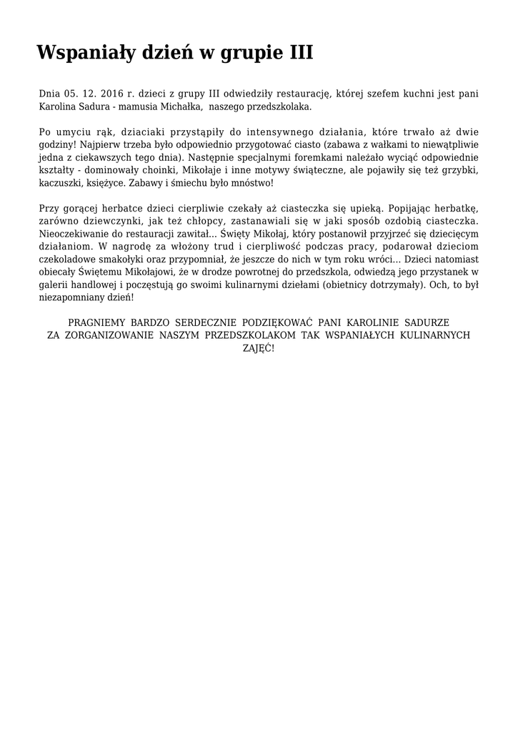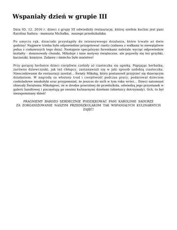 Wspaniały dzień w grupie III Dnia 05. 12. 2016 r. dzieci z grupy III odwiedziły restaurację, której szefem kuchni jest pani Karolina Sadura - mamusia Michałka, naszego przedszkolaka. Po umyciu rąk, dziaciaki przystąpiły do intensywnego działania, które trwało aż dwie godziny! Najpierw trzeba było odpowiednio przygotować ciasto (zabawa z wałkami to niewątpliwie jedna z ciekawszych tego dnia). Następnie specjalnymi foremkami należało wyciąć odpowiednie kształty - dominowały choinki, Mikołaje i inne motywy świąteczne, ale pojawiły się też grzybki, kaczuszki, księżyce. Zabawy i śmiechu było mnóstwo! Przy gorącej herbatce dzieci cierpliwie czekały aż ciasteczka się upieką. Popijając herbatkę, zarówno dziewczynki, jak też chłopcy, zastanawiali się w jaki sposób ozdobią ciasteczka. Nieoczekiwanie do restauracji zawitał... Święty Mikołaj, który postanowił przyjrzeć się dziecięcym działaniom. W nagrodę za włożony trud i cierpliwość podczas pracy, podarował dzieciom czekoladowe smakołyki oraz przypomniał, że jeszcze do nich w tym roku wróci... Dzieci natomiast obiecały Świętemu Mikołajowi, że w drodze powrotnej do przedszkola, odwiedzą jego przystanek w galerii handlowej i poczęstują go swoimi kulinarnymi dziełami (obietnicy dotrzymały). Och, to był niezapomniany dzień! PRAGNIEMY BARDZO SERDECZNIE PODZIĘKOWAĆ PANI KAROLINIE SADURZE ZA ZORGANIZOWANIE NASZYM PRZEDSZKOLAKOM TAK WSPANIAŁYCH KULINARNYCH ZAJĘĆ!