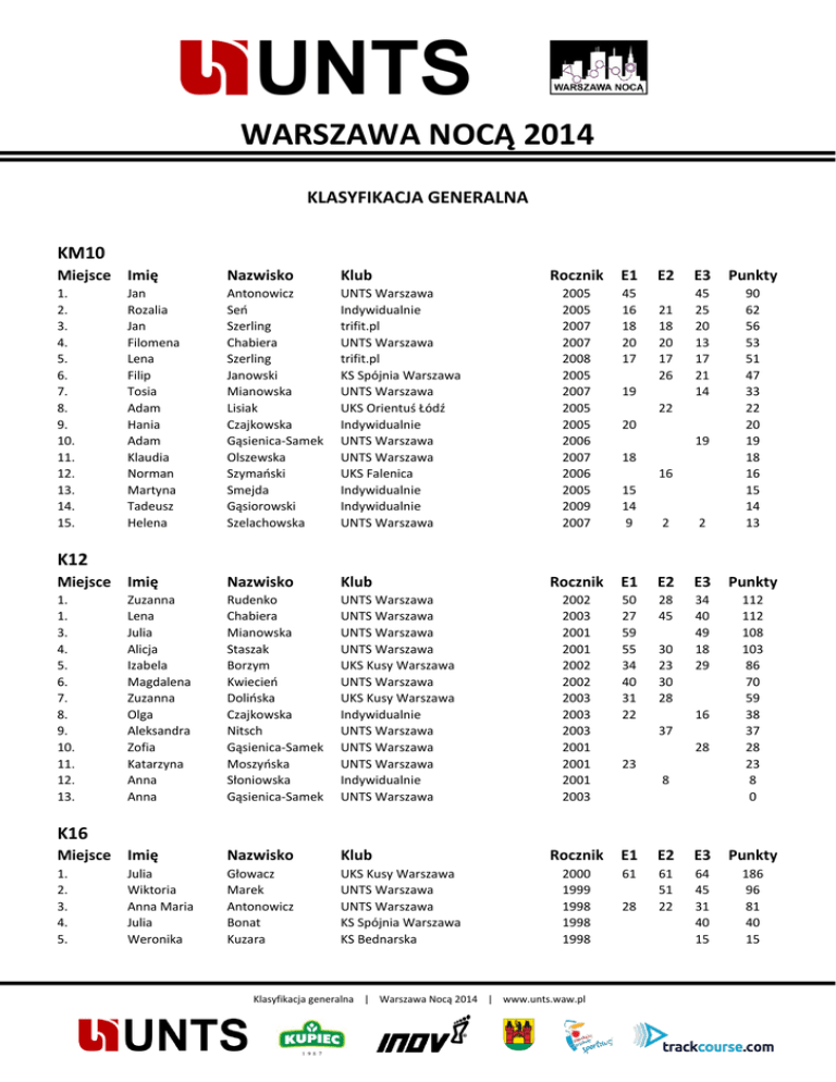 WARSZAWA NOCĄ 2014 KLASYFIKACJA GENERALNA KM10 Miejsce Imię Nazwisko Klub 1. 2. 3. 4. 5. 6. 7. 8. 9. 10. 11. 12. 13. 14. 15. Antonowicz Seo Szerling Chabiera Szerling Janowski Mianowska Lisiak Czajkowska Gąsienica-Samek Olszewska Szymaoski Smejda Gąsiorowski Szelachowska UNTS Warszawa Indywidualnie trifit.pl UNTS Warszawa trifit.pl KS Spójnia Warszawa UNTS Warszawa UKS Orientuś Łódź Indywidualnie UNTS Warszawa UNTS Warszawa UKS Falenica Indywidualnie Indywidualnie UNTS Warszawa Miejsce Imię Nazwisko Klub 1. 1. 3. 4. 5. 6. 7. 8. 9. 10. 11. 12. 13. Rudenko Chabiera Mianowska Staszak Borzym Kwiecieo Dolioska Czajkowska Nitsch Gąsienica-Samek Moszyoska Słoniowska Gąsienica-Samek UNTS Warszawa UNTS Warszawa UNTS Warszawa UNTS Warszawa UKS Kusy Warszawa UNTS Warszawa UKS Kusy Warszawa Indywidualnie UNTS Warszawa UNTS Warszawa UNTS Warszawa Indywidualnie UNTS Warszawa Miejsce Imię Nazwisko Klub 1. 2. 3. 4. 5. Głowacz Marek Antonowicz Bonat Kuzara UKS Kusy Warszawa UNTS Warszawa UNTS Warszawa KS Spójnia Warszawa KS Bednarska Jan Rozalia Jan Filomena Lena Filip Tosia Adam Hania Adam Klaudia Norman Martyna Tadeusz Helena Rocznik E1 2005 2005 2007 2007 2008 2005 2007 2005 2005 2006 2007 2006 2005 2009 2007 45 16 18 20 17 E2 E3 Punkty 21 18 20 17 26 45 25 20 13 17 21 14 2 90 62 56 53 51 47 33 22 20 19 18 16 15 14 13 15 14 9 2 Rocznik E1 2002 2003 2001 2001 2002 2002 2003 2003 2003 2001 2001 2001 2003 50 27 59 55 34 40 31 22 E2 E3 Punkty 28 45 34 40 49 18 29 112 112 108 103 86 70 59 38 37 28 23 8 0 Rocznik E1 E2 E3 Punkty 2000 1999 1998 1998 1998 61 61 51 22 64 45 31 40 15 186 96 81 40 15 19 22 20 19 18 16 K12 Zuzanna Lena Julia Alicja Izabela Magdalena Zuzanna Olga Aleksandra Zofia Katarzyna Anna Anna 30 23 30 28 16 37 28 23 8 K16 Julia Wiktoria Anna Maria Julia Weronika Klasyfikacja generalna | Warszawa Nocą 2014 | www.unts.waw.pl 28 6. 7. 7. Agnieszka Paulina Sophia Łapioska Mroczek Kraev Indywidualnie Tech. Architektonicz Tech. Architektonicz Miejsce Imię Nazwisko Klub 1. 2. 3. 4. 5. 6. 7. 8. 9. 10. 11. 12. 13. 14. 15. 16. 17. 17. 19. 19. Kubicka Żebrowska Kocioska Piatrouskaya Pacek Najman Olszewska Szmyt Wisniewska Gordon Górska Miśkiewicz Marchlik Gładysz Szafirowska Radzikowska Natusiewicz Kwiatoo Szerling Barczewska UNTS Warszawa UNTS Warszawa Orkan Ostróda UNTS Warszawa Team 360 OK! Sport Warszawa Indywidualnie Klub InO STOWARZYSZE Mikrus YOLO Kenji Running Team AZS WAT Warszawa Orkan Ostróda OK! Sport Warszawa KS Spójnia Warszawa weTeam Indywidualnie Indywidualnie Klub InO STOWARZYSZE Indywidualnie trifit.pl GMP Lasy Miejsce Imię Nazwisko Klub 1. 2. 3. 4. 5. 6. 7. 8. 9. 10. 11. 12. 13. 14. 15. 15. 16. 17. 17. 17. Deck Kajzer Biolik Szymaoska Sejbuk Wysocka Gąsiorowska Gruziel Trojecka Karpa Jankowska Gąsowska Szerling Płuciennik Wołczak Lewicka Borkowska Garbacz Kowalska Kaczmarek Sulejówek Indywidualnie UNTS Warszawa Team 360 Indywidualnie OK! Sport Warszawa Indywidualnie Team 360 AZS WAT Warszawa Indywidualnie Indywidualnie Indywidualnie trifit.pl Indywidualnie Indywidualnie Indywidualnie Indywidualnie Indywidualnie Indywidualnie Indywidualnie 1998 1998 1998 4 4 0 0 Rocznik E1 E2 E3 Punkty 1993 1995 1987 1991 1988 1988 1994 1986 1993 1990 1989 1989 1988 1989 1992 1992 1986 1989 1993 1988 74 71 55 69 51 65 15 36 30 33 62 65 50 69 45 52 36 24 19 16 65 59 47 201 195 152 138 130 117 99 82 76 67 58 57 35 24 20 19 7 7 0 0 Rocznik E1 E2 E3 Punkty 1985 1976 1977 1977 1985 1985 1981 1976 1983 1982 1984 1978 1978 1985 1981 1983 1981 1981 1982 1985 52 52 44 49 39 26 55 17 38 36 40 34 37 30 128 108 99 91 89 82 70 59 47 37 22 21 12 11 10 10 9 0 0 0 K20 Zuzanna Barbara Agnieszka Viola Karolina Natalia Zuzanna Barbara Marta Diana Kinga Martyna Małgorzata Monika Anna Monika Anna Agata Maria Agnieszka 37 34 48 22 27 18 58 20 35 24 20 19 7 7 K30 Anna Maja Agnieszka Zuzanna Anna Malwina Maria Magdalena Marta Katarzyna Katarzyna Renata Anna Aleksandra Sylwia Dominika Olga Kamila Adrianna Katarzyna Klasyfikacja generalna | Warszawa Nocą 2014 | www.unts.waw.pl 27 25 47 1 9 12 2 1 25 51 46 3 37 9 10 11 11 10 10 9 K40 Miejsce Imię Nazwisko Klub 1. 2. 3. 4. 5. 6. 6. 8. 9. 10. 11. Misiaczek Kulicka Trykozko Karewicz Daniluk Staszak Mianowska Marek Muzyka Adach Buczak Indywidualnie Indywidualnie Team 360 weTeam UKS Kusy Warszawa UNTS Warszawa UNTS Warszawa UNTS Warszawa Kopytko Indywidualnie Indywidualnie Miejsce Imię Nazwisko Klub 1. 2. 3. 4. Krochmal Bargiel Olbrycht Bartnik AZS WAT Warszawa OK! Sport Warszawa OLBnO AZS WAT Warszawa Miejsce Imię Nazwisko Klub 1. 2. 3. 4. Glioska Galicz Zielczyoska Deck UNTS Warszawa UKS Kusy Warszawa A-To-My Sulejówek Miejsce Imię Nazwisko Klub 1. 2. 3. 4. 5. 6. 6. 8. 8. 10. 11. 12. 13. 14. 15. 16. 17. 18. 18. 20. 21. 21. Pierzchała Olszewski Niebielski Seo Czernicki Drągowski Gawryś Nowakowski Kajzer Major Major Smejda Jach-Bartha Kubisiak Juzaszek Wójtowicz Gawlikowski Jakoniuk Lubczyoski Michalak Kołcun Jabłonowski UNTS Warszawa UNTS Warszawa UKS Falenica Indywidualnie UKS Kusy Warszawa Ok! Sport Warszawa UKS Kusy Warszawa UKS Kusy Warszawa Indywidualnie Indywidualnie Indywidualnie Indywidualnie UNTS Warszawa Indywidualnie UNTS Warszawa UNTS Warszawa UNTS Warszawa UNTS Warszawa UNTS Warszawa KS Spójnia Warszaa UNTS Warszawa Fundacja Ojcostwo Mistrzostwo Ewa Agata Urszula Agnieszka Karina Anna Dorota Agnieszka Basia Ania Monika Rocznik E1 E2 E3 Punkty 1968 1975 1969 1971 1972 1970 1974 1973 1970 1970 1968 39 50 30 27 23 31 38 29 33 49 18 8 15 7 33 1 105 99 60 46 43 38 38 37 35 14 1 Rocznik E1 E2 E3 Punkty 1958 1965 1956 1958 22 18 16 11 4 15 9 1 4 48 22 17 13 Rocznik E1 E2 E3 Punkty 1949 1951 1927 1950 12 8 3 Rocznik E1 E2 E3 Punkty 2001 2002 2001 2002 2003 2001 2003 2002 2001 2001 2003 2002 2004 2002 2002 2004 2001 2002 2004 2001 2001 2003 80 50 80 50 60 34 40 27 29 31 35 27 26 12 30 19 80 50 60 37 30 21 29 24 240 150 120 108 98 88 88 79 79 76 72 67 62 58 56 54 45 31 31 30 26 26 19 12 11 5 8 16 14 K50 Małgorzata Beata Anna Bożen