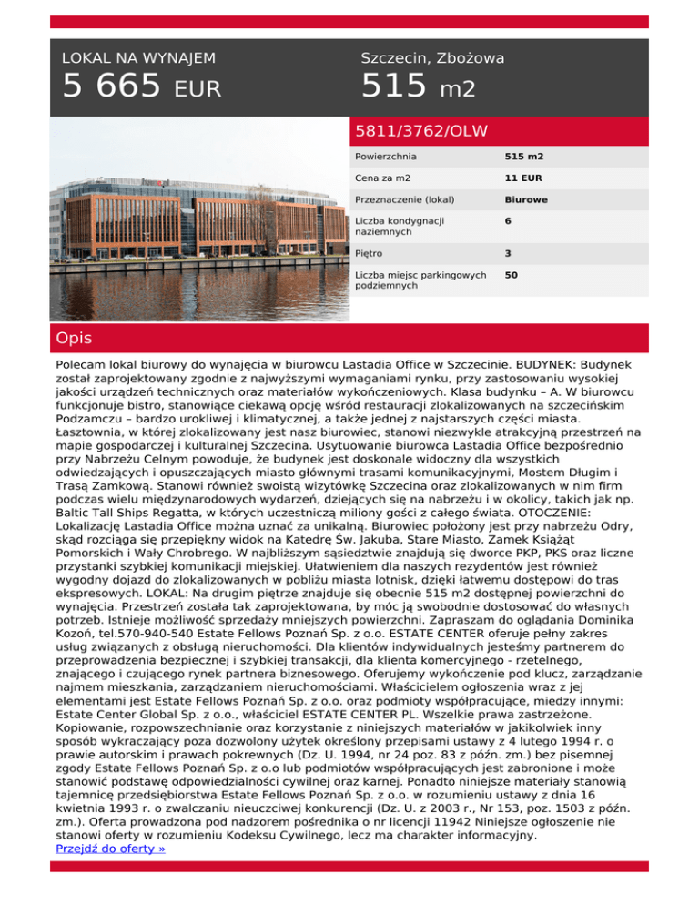LOKAL NA WYNAJEM Szczecin, Zbożowa 5 665 515 EUR m2 5811/3762/OLW Powierzchnia 515 m2 Cena za m2 11 EUR Przeznaczenie (lokal) Biurowe Liczba kondygnacji naziemnych 6 Piętro 3 Liczba miejsc parkingowych podziemnych 50 Opis Polecam lokal biurowy do wynajęcia w biurowcu Lastadia Office w Szczecinie. BUDYNEK: Budynek został zaprojektowany zgodnie z najwyższymi wymaganiami rynku, przy zastosowaniu wysokiej jakości urządzeń technicznych oraz materiałów wykończeniowych. Klasa budynku – A. W biurowcu funkcjonuje bistro, stanowiące ciekawą opcję wśród restauracji zlokalizowanych na szczecińskim Podzamczu – bardzo urokliwej i klimatycznej, a także jednej z najstarszych części miasta. Łasztownia, w której zlokalizowany jest nasz biurowiec, stanowi niezwykle atrakcyjną przestrzeń na mapie gospodarczej i kulturalnej Szczecina. Usytuowanie biurowca Lastadia Office bezpośrednio przy Nabrzeżu Celnym powoduje, że budynek jest doskonale widoczny dla wszystkich odwiedzających i opuszczających miasto głównymi trasami komunikacyjnymi, Mostem Długim i Trasą Zamkową. Stanowi również swoistą wizytówkę Szczecina oraz zlokalizowanych w nim firm podczas wielu międzynarodowych wydarzeń, dziejących się na nabrzeżu i w okolicy, takich jak np. Baltic Tall Ships Regatta, w których uczestniczą miliony gości z całego świata. OTOCZENIE: Lokalizację Lastadia Office można uznać za unikalną. Biurowiec położony jest przy nabrzeżu Odry, skąd rozciąga się przepiękny widok na Katedrę Św. Jakuba, Stare Miasto, Zamek Książąt Pomorskich i Wały Chrobrego. W najbliższym sąsiedztwie znajdują się dworce PKP, PKS oraz liczne przystanki szybkiej komunikacji miejskiej. Ułatwieniem dla naszych rezydentów jest również wygodny dojazd do zlokalizowanych w pobliżu miasta lotnisk, dzięki łatwemu dostępowi do tras ekspresowych. LOKAL: Na drugim piętrze znajduje się obecnie 515 m2 dostępnej powierzchni do wynajęcia. Przestrzeń została tak zaprojektowana, by móc ją swobodnie dostosować do własnych potrzeb. Istnieje możliwość sprzedaży mniejszych powierzchni. Zapraszam do oglądania Dominika Kozoń, tel.570-940-540 Estate Fellows Poznań Sp. z o.o. ESTATE CENTER oferuje pełny zakres usług związanych z obsługą nieruchomości. Dla klientów indywidualnych jesteśmy partnerem do przeprowadzenia bezpiecznej i szybkiej transakcji, dla klienta komercyjnego - rzetelnego, znającego i czującego rynek partnera biznesowego. Oferujemy wykończenie pod klucz, zarządzanie najmem mieszkania, zarządzaniem nieruchomościami. Właścicielem ogłoszenia wraz z jej elementami jest Estate Fellows Poznań Sp. z o.o. oraz podmioty współpracujące, miedzy innymi: Estate Center Global Sp. z o.o., właściciel ESTATE CENTER PL. Wszelkie prawa zastrzeżone. Kopiowanie, rozpowszechnianie oraz korzystanie z niniejszych materiałów w jakikolwiek inny sposób wykraczający poza dozwolony użytek określony przepisami ustawy z 4 lutego 1994 r. o prawie autorskim i prawach pokrewnych (Dz. U. 1994, nr 24 poz. 83 z późn. zm.) bez pisemnej zgody Estate Fellows Poznań Sp. z o.o lub podmiotów współpracujących jest zabronione i może stanowić podstawę odpowiedzialności cywilnej oraz karnej. Ponadto niniejsze materiały stanowią tajemnicę przedsiębiorstwa Estate Fellows Poznań Sp. z o.o. w rozumieniu ustawy z dnia 16 kwietnia 1993 r. o zwalczaniu nieuczciwej konkurencji (Dz. U. z 2003 r., Nr 153, poz. 1503 z późn. zm.). Oferta prowadzona pod nadzorem pośrednika o nr licencji 11942 Niniejsze ogłoszenie nie stanowi oferty w rozumieniu Kodeksu Cywilnego, lecz ma charakter informacyjny. Przejdź do oferty » Dominika Kozoń tel. 570 940 540 email: [email protected] NINIEJSZE WARUNKI MAJĄ CHARAKTER INFORMACYJNY ORAZ NIE STANOWIĄ OFERTY ZAWARCIA JAKIEJKOLWIEK UMOWY W ROZUMIENIU PRZEPISÓW USTAW Z DNIA 23 KWIETNIA 1964 ROKU KODEKS CYWILNY (DZ.U. Z 1964 ROKU, NR 16, POZ. 93 Z PÓŹNIEJSZYMI ZMIANAMI. Powered by TCPDF (www.tcpdf.org)
