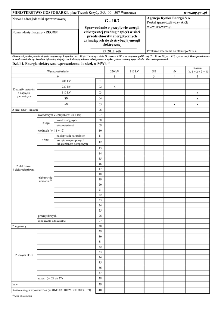 MINISTERSTWO GOSPODARKI, plac Trzech KrzyŜy 3/5, 00 - 507 Warszawa Nazwa i adres jednostki sprawozdawczej G - 10.7 Sprawozdanie o przepływie energii elektrycznej (według napięć) w sieci przedsiębiorstw energetycznych zajmujących się dystrybucją energii elektrycznej Numer identyfikacyjny - REGON za 2011 rok www.mg.gov.pl Agencja Rynku Energii S.A. Portal sprawozdawczy ARE www.are.waw.pl Przekazać w terminie do 20 lutego 2012 r. Obowiązek przekazywania danych statystycznych wynika z art. 30 pkt 3 ustawy z dnia 29 czerwca 1995 r. o statystyce publicznej (Dz. U. Nr 88, poz. 439, z późn. zm.). Dane pozyskiwane w drodze badania są chronione tajemnicą statystyczną i nie będą nikomu udostępniane, a wykorzystane zostaną wyłącznie do zbiorczych opracowań. Dział 1. Energia elektryczna wprowadzona do sieci, w MWh 1) Wyszczególnienie 0 Z transformatorów o napięciu pierwotnym Razem (k. 1 + 2 + 3 + 4) 1 2 3 4 5 02 110 kV 03 x SN 04 x nN 05 07 kondensacyjnych 08 elektrociepłowni 09 wodnych (w. 11 + 12) 10 na dopływie naturalnym 11 szczytowo-pompowych lub z członem pompowym 12 13 14 15 16 Z elektrowni i elektrociepłowni 17 18 elektrownie imiennie 1) 19 20 21 22 23 24 25 przemysłowych inne źródła odnawialne Z zagranicy 26 27 28 29 30 31 32 33 Z innych OSD 34 35 36 37 razem (w. 29 do 37) 38 Inne 39 Razem energia wprowadzona (w. 01do 07+10+26+27+28+38+39) 40 Patrz objaśnienia. nN 220 kV zawodowych cieplnych (w. 08 + 09) 1) SN 01 06 z tego 110 kV 400 kV Z sieci OSP – liniami z tego 220 kV x x x Dział 2. Energia elektryczna oddana z sieci, w MWh Wyszczególnienie 220 kV 110 kV SN nN Razem (k. 1 + 2 + 3 + 4) 0 1 2 3 4 5 Transformacja do sieci 400 kV 01 220 kV 02 110 kV 03 SN 04 nN 05 Do sieci OSP – liniami 06 Dostawy do odbiorców końcowych 07 w tym: dostawy drobnym dystrybutorom lokalnym – energia do odsprzedania x x x x x x 08 Nielegalny pobór energii elektrycznej 09 Potrzeby własne ogółem 10 w tym potrzeby własne sieci x 11 Potrzeby ogólne elektrowni 12 Potrzeby blokowe elektrowni 13 Pompowanie wody w elektrowniach wodnych 14 Za granicę 15 16 17 18 19 Do sieci innych OSD 20 21 22 23 razem (w. 16 do 23) Inne 24 25 Razem oddano (w. 01 do w. 07 + 09 + 10 + 12 + 13 + 14 + 15 +24 + 25) RóŜnica bilansowa (Dz.1 w. 40 - Dz. 2 w. 26) Wskaźnik róŜnic bilansowych (w %) (Dz.2 w. 27/Dz. 1 w. 40 *100) 26 27 28 Uwaga : Dane naleŜy wykazywać w liczbach całkowitych (bez znaku po przecinku). Przed wypełnieniem naleŜy przeczytać objaśnienia. ..…………………..………… ..………..…………...........… (imię, nazwisko i telefon osoby sporządzającej sprawozdanie) (imię, nazwisko i telefon osoby zatwierdzającej sprawozdanie)