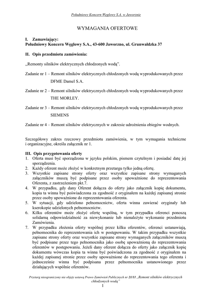 Południowy Koncern Węglowy S.A. w Jaworznie WYMAGANIA OFERTOWE I. Zamawiający: Południowy Koncern Węglowy S.A., 43-600 Jaworzno, ul. Grunwaldzka 37 II. Opis przedmiotu zamówienia: ,,Remonty silników elektrycznych chłodzonych wodą”. Zadanie nr 1 – Remont silników elektrycznych chłodzonych wodą wyprodukowanych przez DFME Damel S.A. Zadanie nr 2 – Remont silników elektrycznych chłodzonych wodą wyprodukowanych przez THE MORLEY. Zadanie nr 3 – Remont silników elektrycznych chłodzonych wodą wyprodukowanych przez SIEMENS Zadanie nr 4 – Remont silników elektrycznych w zakresie udroŜnienia obiegów wodnych. Szczegółowy zakres rzeczowy przedmiotu zamówienia, w tym wymagania techniczne i organizacyjne, określa załącznik nr 1. III. Opis przygotowania oferty 1. Oferta musi być sporządzona w języku polskim, pismem czytelnym i posiadać datę jej sporządzenia. 2. KaŜdy oferent moŜe złoŜyć w konkretnym przetargu tylko jedną ofertę. 3. Wszystkie zapisane strony oferty oraz wszystkie zapisane strony wymaganych załączników muszą być podpisane przez osoby upowaŜnione do reprezentowania Oferenta, z zastrzeŜeniem pkt.7. 4. W przypadku, gdy dany Oferent dołącza do oferty jako załącznik kopię dokumentu, kopia ta winna być poświadczona za zgodność z oryginałem na kaŜdej zapisanej stronie przez osoby upowaŜnione do reprezentowania oferenta. 5. W sytuacji, gdy udzielono pełnomocnictw, oferta winna zawierać oryginały lub kserokopie udzielonych pełnomocnictw. 6. Kilku oferentów moŜe złoŜyć ofertę wspólną, w tym przypadku oferenci ponoszą solidarną odpowiedzialność za niewykonanie lub nienaleŜyte wykonanie przedmiotu Zamówienia. 7. W przypadku złoŜenia oferty wspólnej przez kilku oferentów, oferenci ustanawiają, pełnomocnika do reprezentowania ich w postępowaniu. W takim przypadku wszystkie zapisane strony oferty oraz wszystkie zapisane strony wymaganych załączników muszą być podpisane przez tego pełnomocnika jako osobę upowaŜnioną do reprezentowania oferentów w postępowaniu. JeŜeli dany oferent dołącza do oferty jako załącznik kopię dokumentu wówczas kopia ta winna być poświadczona za zgodność z oryginałem na kaŜdej zapisanej stronie przez osoby upowaŜnione do reprezentowania tego oferenta i jednocześnie winna być podpisana przez pełnomocnika ustanowionego przez działających wspólnie oferentów. Przetarg nieograniczony nie objęty ustawą Prawo Zamówień Publicznych nr 21/11 ,,Remont silników elektrycznych chłodzonych wodą” 1 Południowy Koncern Węglowy S.A. w Jaworznie 8. Wszystkie korekty i poprawki treści oferty mogą być nanoszone jedynie przez przekreślenie błędnego zapisu i wstawienie obok poprawnego czytelnego zapisu. Wymaga się aby wszelkie korekty i poprawki były opatrzone data ich dokonania oraz z podpisami osób, które podpisały ofertę. 9. Ofertę naleŜy sporządzić w dwóch odrębnych częściach: technicznej i handlowej i złoŜyć w jednym, nieprzejrzystym, zaklejonym opakowaniu (kopercie), opisanym w sposób określony w wymaganiach ofertowych. 10. KaŜda z części oferty wraz z odpowiednimi dla niej załącznikami ułoŜona w kolejności zgodnie z wzorem odpowiedniego formularza oferty powinna być trwale spięta lub zszyta w sposób uniemoŜliwiający dekompletację zawartości danej części oferty. 11. KaŜda z części oferty musi zawierać spis treści. 12. Wszystkie strony kaŜdej z części oferty, zawierające jakiekolwiek teksty, znaki czy rysunki, muszą być oddzielnie ponumerowane kolejnymi numerami stron. 13. Część techniczna oferty musi zawierać: a) nazwę i siedzibę Oferenta; b) datę sporządzenia oferty; c) przedmiot oferty; - w przypadku ofert częściowych naleŜy podać numer i nazwę części przedmiotu zamówienia, d) termin wykonania przedmiotu zamówienia; (ilość dni od daty otrzymania zlecenia faksem) wymagany termin: do 50dni e) warunki transportu: (do i po remoncie - transport własny oferenta i na jego koszt) f) okres gwarancji: wymagana gwarancja minimalna 12 m -cy, g) oświadczenia oferenta, Ŝe oferowana usługa jest wolna od wad prawnych, h) oświadczenie: − w przypadku gdy Oferent jest producentem urządzeń wymienionych w ofercie przedstawi oświadczenie zgodne z wzorem wg załącznika nr 2a do wymagań ofertowych; − w przypadku gdy Oferent jest autoryzowanym przedstawicielem producenta urządzeń wymienionych w ofercie przedstawi oświadczenie producenta o udzieleniu autoryzacji zgodnie z wzorem wg załącznika nr 2b do wymagań ofertowych; − w przypadku gdy Oferent nie jest producentem i nie posiada autoryzacji producenta przedstawi oświadczenie zgodne z wzorem wg załącznika 2c do wymagań ofertowych oraz kserokopię dokumentu (w załączeniu) potwierdzającego ocenę zdolności Oferenta do wykonywania remontów urządzeń wymienionych w ofercie, która jest wydana przez akredytowaną jednostkę certyfikującą wyroby lub jednostkę notyfikowaną − w przypadku remontu silników w zakresie udroŜnienia obiegów wodnych, oświadczenie o zastosowanie technologii udroŜnienia bezpiecznego dla ludzi, środowiska naturalnego oraz samego urządzenia, zgodnie ze wzorem w załączniku 2h, i) deklarację, Ŝe remont będzie wykonany w sposób gwarantujący bezpieczną eksploatację wyremontowanych urządzeń, Ŝe remont nie spowoduje wytworzenia nowego urządzenia, Ŝe nie będzie wymagane dokonanie ponownego wprowadzenia do obrotu, oraz Ŝe wyremontowany przedmiot zamówienia będzie odpowiadał DTR/instrukcji uŜytkowania urządzenia, na podstawie którego było eksploatowane przed remontem. Deklaracja powinna być sporządzona zgodnie z wzorem przedstawionym w załączniku nr: − 2d (dla Oferenta będącego producentem, upowaŜnionym przedstawicielem producenta, autoryzowanym wykonawcą) lub, Przetarg nieograniczony nie objęty ustawą Prawo Zamówień Publicznych nr 21/11 ,,Remont silników elektrycznych chłodzo