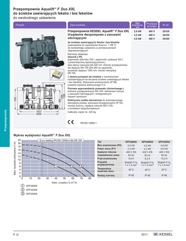 Przepompownie Aqualift ® F Duo XXL do ścieków zawierających fekalia i bez fekaliów do swobodnego ustawienia Produkt Opis produktu Moc znamionowa Przyłącze do prądu Nr art. 2,6 kW 400 V 28 638 3,5 kW 400 V 28 639 4,8 kW 400 V 28 640 Przepompownie 1055 985 1296 1385 Przepompownia KESSEL Aqualift ® F Duo XXL Urządzenie dwupompowe z zasuwami odcinającymi 1837 2000 do ścieków zawierających fekalia i bez fekaliów (odpowiednie do separatorów tłuszczu > NS 7) do swobodnego ustawienia w pomieszczeniach nieprzemarzających Elementy składowe: zbiornik z PE, pojemność zbiornika 750 l, pojemność użytkowa 300 l, z pneumatyczną rejestracją poziomu, dwa otwory rewizyjne DA 420 mm. Króciec przyłączeniowy dla dopływu DN 150 (DN 200 na zapytanie), wysokość dopływu 1055 mm, króciec wentylacji DN 100. Z dwoma pompami do ścieków z mechanizmem rozdrabniającym do tłoczenia ścieków zawierających fekalia i bez fekaliów. Wykonanie wodoszczelne (IP 68), przewód zasilania elektrycznego 5 m. Pionowe wyprowadzenie przewodu ciśnieniowego z króćcem przyłączeniowym DN 100 i kołnierzem luźnym, z zasuwami odcinającymi i zintegrowanymi klapami zwrotnymi. Elektryczna szafka sterownicza do automatycznego sterowania pompą, wykonanie bryzgoszczelne (IP 54), montaż ścienny, napięcie robocze 400 V DS, z kontaktem bezpotencjałowym. Całkowity ciężar ok. 220 kg. PN EN 12050-1 Maks. wysokość podnoszenia H (m) Wykres wydajności Aqualift ® F Duo XXL 22 20 18 16 14 12 10 8 6 4 2 0 Q min według PN EN 12056-4 dla DN 100 0 10 20 30 40 50 60 70 80 Typ SPF260KE SPF400KE SPF550KE Moc znamionowa (P2) Pobór mocy (P1) Napięcie robocze Częstotliwość znam. Prąd znamionowy Przewód przyłączeniowy 2,6 kW 3,3 kW 400 V DS 50 Hz 5,6 A 3,5 kW 4,2 kW 400 V DS 50 Hz 8,2 A 4,8 kW 5,6 kW 400 V DS 50 Hz 10,2 A długość 5 m, 2 7 x 1,5 mm długość 5 m, 2 7 x 1,5 mm długość 5 m, 2 7 x 1,5 mm Temperatura materiału tłocz. 40°C 40°C 40°C Rodzaj ochrony IP 68 IP 68 IP 68 90 100 3 Maks. przepływ Q (m /h) SPF260KE SPF400KE SPF550KE P 12 2011