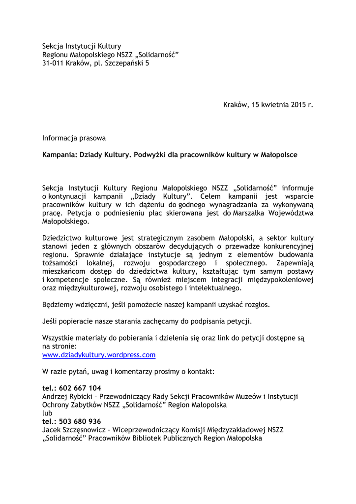 Sekcja Instytucji Kultury Regionu Małopolskiego NSZZ „Solidarność” 31-011 Kraków, pl. Szczepański 5 Kraków, 15 kwietnia 2015 r. Informacja prasowa Kampania: Dziady Kultury. PodwyŜki dla pracowników kultury w Małopolsce Sekcja Instytucji Kultury Regionu Małopolskiego NSZZ „Solidarność” informuje o kontynuacji kampanii „Dziady Kultury”. Celem kampanii jest wsparcie pracowników kultury w ich dąŜeniu do godnego wynagradzania za wykonywaną pracę. Petycja o podniesieniu płac skierowana jest do Marszałka Województwa Małopolskiego. Dziedzictwo kulturowe jest strategicznym zasobem Małopolski, a sektor kultury stanowi jeden z głównych obszarów decydujących o przewadze konkurencyjnej regionu. Sprawnie działające instytucje są jednym z elementów budowania toŜsamości lokalnej, rozwoju gospodarczego i społecznego. Zapewniają mieszkańcom dostęp do dziedzictwa kultury, kształtując tym samym postawy i kompetencje społeczne. Są równieŜ miejscem integracji międzypokoleniowej oraz międzykulturowej, rozwoju osobistego i intelektualnego. Będziemy wdzięczni, jeśli pomoŜecie naszej kampanii uzyskać rozgłos. Jeśli popieracie nasze starania zachęcamy do podpisania petycji. Wszystkie materiały do pobierania i dzielenia się oraz link do petycji dostępne są na stronie: www.dziadykultury.wordpress.com W razie pytań, uwag i komentarzy prosimy o kontakt: tel.: 602 667 104 Andrzej Rybicki – Przewodniczący Rady Sekcji Pracowników Muzeów i Instytucji Ochrony Zabytków NSZZ „Solidarność” Region Małopolska lub tel.: 503 680 936 Jacek Szczęsnowicz – Wiceprzewodniczący Komisji Międzyzakładowej NSZZ „Solidarność” Pracowników Bibliotek Publicznych Region Małopolska