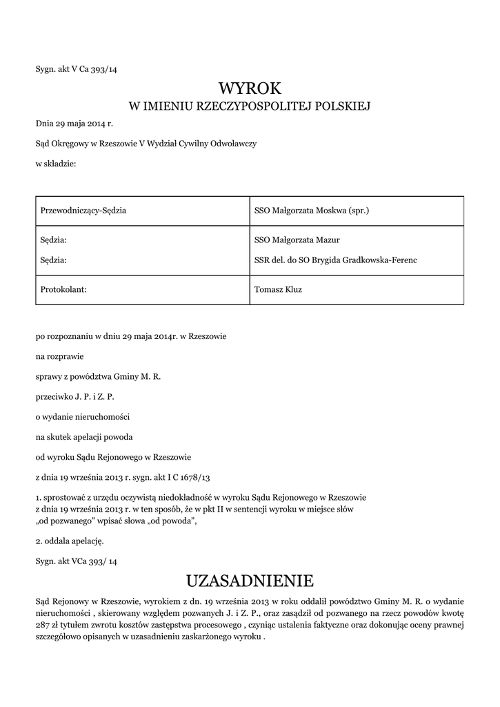 Sygn. akt V Ca 393/14 WYROK W IMIENIU RZECZYPOSPOLITEJ POLSKIEJ Dnia 29 maja 2014 r. Sąd Okręgowy w Rzeszowie V Wydział Cywilny Odwoławczy w składzie: Przewodniczący-Sędzia SSO Małgorzata Moskwa (spr.) Sędzia: SSO Małgorzata Mazur Sędzia: SSR del. do SO Brygida Gradkowska-Ferenc Protokolant: Tomasz Kluz po rozpoznaniu w dniu 29 maja 2014r. w Rzeszowie na rozprawie sprawy z powództwa Gminy M. R. przeciwko J. P. i Z. P. o wydanie nieruchomości na skutek apelacji powoda od wyroku Sądu Rejonowego w Rzeszowie z dnia 19 września 2013 r. sygn. akt I C 1678/13 1. sprostować z urzędu oczywistą niedokładność w wyroku Sądu Rejonowego w Rzeszowie z dnia 19 września 2013 r. w ten sposób, że w pkt II w sentencji wyroku w miejsce słów „od pozwanego” wpisać słowa „od powoda”, 2. oddala apelację. Sygn. akt VCa 393/ 14 UZASADNIENIE Sąd Rejonowy w Rzeszowie, wyrokiem z dn. 19 września 2013 w roku oddalił powództwo Gminy M. R. o wydanie nieruchomości , skierowany względem pozwanych J. i Z. P., oraz zasądził od pozwanego na rzecz powodów kwotę 287 zł tytułem zwrotu kosztów zastępstwa procesowego , czyniąc ustalenia faktyczne oraz dokonując oceny prawnej szczegółowo opisanych w uzasadnieniu zaskarżonego wyroku . Dodać należy , że rozstrzygnięcie powyższe zapadło po wcześniejszym uchyleniu wyroku Sądu Rejonowego w Rzeszowie z dn. 17 maja 2012 roku przez Sąd Okręgowy w Rzeszowie wyrokiem z dn. 16 kwietnia 2013 roku i przekazania Sądowi Rejonowemu w Rzeszowie sprawy do ponownego rozpoznania z pozostawieniem temu sądowi rozstrzygnięcia o kosztach postępowania apelacyjnego, ż zaleceniem rozstrzygnięcia podniesionego przez pozwanych zarzutu zasiedzenia przedmiotowej nieruchomości . Zaskarżony wyrok zapadł przy poczynieniu następujących ustaleń faktycznych : Budynek, wpisany do rejestru zabytków , zajmowany przez pozwanych znajduje się na nieruchomości oznaczonej jako działka nr (...) , położonej w R. – (...), dla której Sąd Rejonowy w Rzeszowie prowadzi księgę wieczystą nr (...). Budynek jest w bardzo złym stanie technicznym i stanowi grożenie dla życia, w związku z czym powód zaproponował pozwanym przekwaterowanie do innych lokali , propozycji tej jednak pozwani przyjęli. Pozwany objął w posiadanie przedmiotowy lokal w roku 1945, zajmując część budynku tj. 2 pokoje z kuchnią oraz użytkując działkę od południa . Już w tym okresie w 2 części budynku znajdował się sklep . Począwszy od 1965 roku, kiedy to pozwany otrzymał informację od ówczesnego sekretarza partii o przejęciu przez państwo zajmowanej części budynku poczynił z nim uzgodnienia o dalszym zamieszkiwaniu części budynku wraz z przyległym ogrodem. Zaprzestał płacenia podatków i ubezpieczenie domu. W tym samym czasie do drugiej części budynku , użytkowanej dotychczas jako sklep, dokwaterowano rodzinę Państwa K., którzy wyprowadzili się stamtąd w 2011 roku, pozostawiając klucze do tego mieszkania pozwanym. W latach osiemdziesiątych pozwany J. P. przeprowadził remont części budynku , którą zajmował. Pozwana gmina nie wykonywała żadnych napraw w przedmiotowym budynku . Pozwani nie opłacali nigdy czynszu na rzecz gminy. Przed 1980 rokiem rodzina K. zwracała się do pozwanego J. P. o wyrażenie zgody na adaptację zajmowanych przez nich pomieszczenia na strychu. Pozwany zgodził się na tą adaptację, ale dopiero po wykonaniu ekspertyzy budowlanej. Pozwani uprawiali całą działkę wokół budynku, uprawiając tam pomidory, ogórki, maliny i porzeczki. Opłacali podatki i należności za media od całości nieruchomości. Byli w przedmiotowym lokalu zameldowani wraz z dziećmi. Zdaniem Sądu Rejonowego pozwani nabyli własność przedmiotowej nieruchomości z dniem 2 października 2005 roku tj. upływem ostatniego dnia 15 letniego biegu terminu przedawnienia, który rozpoczął się dniu 1 października 1990 roku w wyniku objęcia w posiadanie samoistnie całej nieruchomości wraz z jej częścią składową tj. budynkiem mieszkalnym w 1965 roku. Pomimo tego, że korzystali z części budynku, to pozwanego J. P. uważano za właściciela całego budynku. Od powyższego wyroku apelację wniosła powódka Gmina M. R., domagając się zmiany zaskarżonego wyroku poprzez orzeczenie zgodnie z żądaniem i zasądzenie na swoją rzecz kosztów postępowania. Apelującą zarzuciła naruszenie art. 233 § 1 k.p.c. poprzez brak wszechstronnej oceny materiału dowodowego, oraz art. 328 § 2 k.p.c. poprzez uzasadnienie wyroku w sposób nienadający się do kontroli instancyjnej, albowiem sąd nie określił początku biegu terminu zasiedzenia. W uzasadnieniu apelacji, powódka wskazała, że pozwany nie był uważany za właściciela całej nieruchomości, jak również on sam i jego dzieci nie się za właścicieli całej nieruchomości. Wskazała, że takimi wyłącznymi właścicielami czuli się natomiast Państwo K. w odniesieniu do posiadanego przez nich lokalu. W oparciu o zeznania świadka M. K. (1) i A. P. powódka podniosła, że za właściciela tej nieruchomości uważana była Gmina. Zdaniem apelującej Sąd nie rozwiązał sprzeczności i oparł się na stwierdzeniu że mieszkająca w części domu rodzina K. uzależniała adaptację strychu od zgody pozwanego J. P.. Pytanie o zgodę na adaptację strychu, kierowane do pozwanego J. P. należało traktować jako wyraz dbałości o dobre stosunki sąsiedzkie, a nie wyraz uznania, że to pozwany był właścicielem całego budynku. Sąd Okręgowy rozważył, co następuje: Sąd II Instancji przyjął za własne ustalenia faktyczne Sądu Rejonowego odnoszące się do zaskarżonego wyroku tj. co do okresu posiadania, jego samoistności i złej wiary po stronie pozwanych, które zadecydowały o stwierdzeniu zasiedzenia przedmiotowej nieruchomości w obszarze, objętym żądaniem pozwu. Odnosząc się w pierwszej kolejności do podstawy materialno-prawnej roszczenia, n