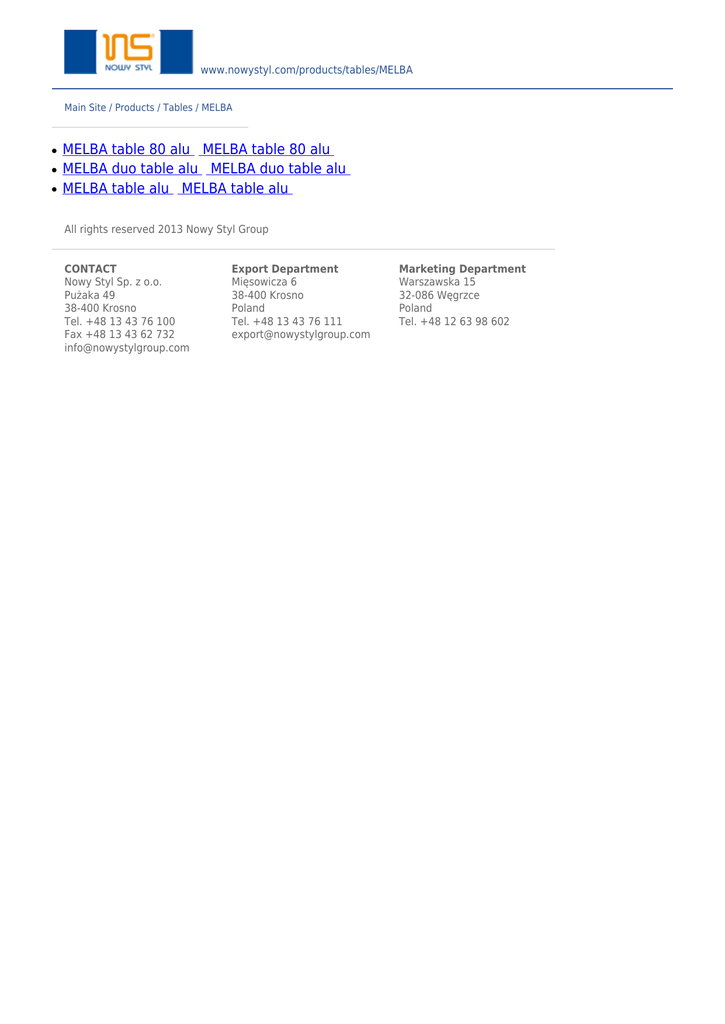 www.nowystyl.com/products/tables/MELBA Main Site / Products / Tables / MELBA ● ● ● MELBA table 80 alu MELBA table 80 alu MELBA duo table alu MELBA duo table alu MELBA table alu MELBA table alu All rights reserved 2013 Nowy Styl Group CONTACT Nowy Styl Sp. z o.o. Pużaka 49 38-400 Krosno Tel. +48 13 43 76 100 Fax +48 13 43 62 732 [email protected] Export Department Mięsowicza 6 38-400 Krosno Poland Tel. +48 13 43 76 111 [email protected] Marketing Department Warszawska 15 32-086 Węgrzce Poland Tel. +48 12 63 98 602