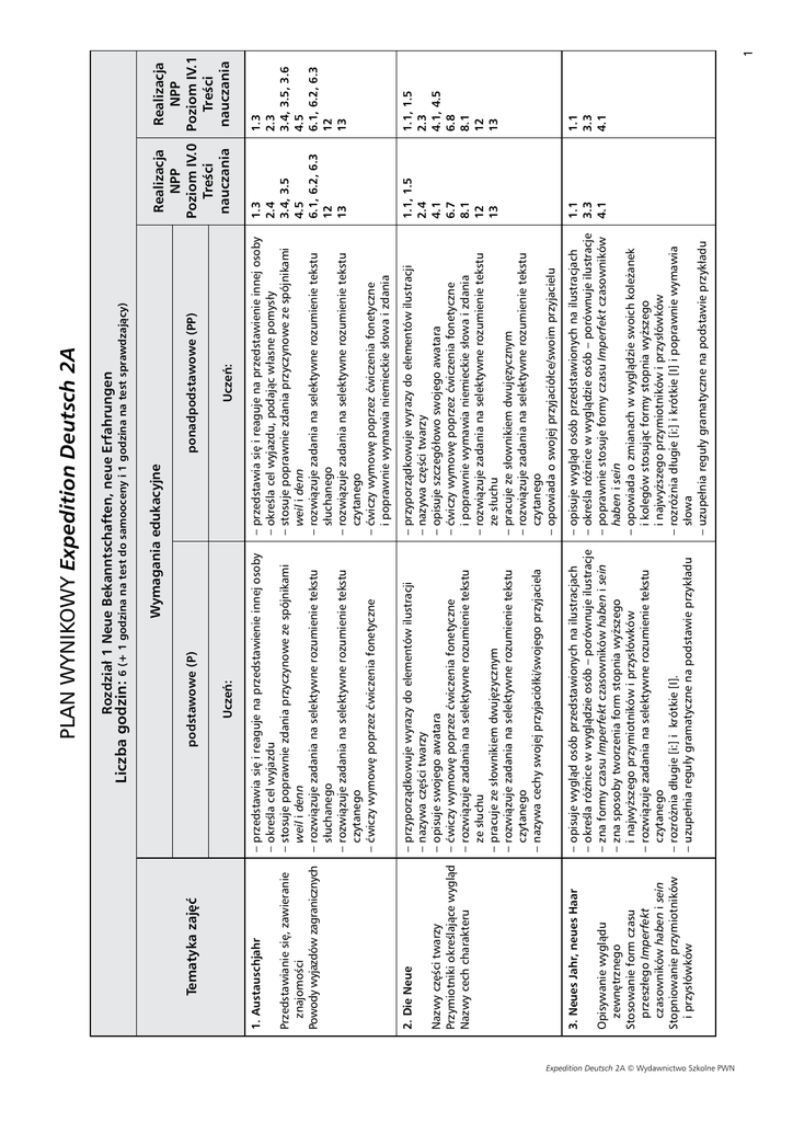 Expedition Deutsch 2A © Wydawnictwo Szkolne PWN Opisywanie wyglàdu zewn´trznego Stosowanie form czasu przeszłego Imperfekt czasowników haben i sein Stopniowanie przymiotników i przysłówków 3. Neues Jahr, neues Haar Nazwy cz´Êci twarzy Przymiotniki okreÊlajàce wyglàd Nazwy cech charakteru 2. Die Neue Przedstawianie si´, zawieranie znajomoÊci Powody wyjazdów zagranicznych 1. Austauschjahr Tematyka zaj´ç – opisuje wyglàd osób przedstawionych na ilustracjach – okreÊla ró˝nice w wyglàdzie osób – porównuje ilustracje – zna formy czasu Imperfekt czasowników haben i sein – zna sposoby tworzenia form stopnia wy˝szego i najwy˝szego przymiotników i przysłówków – rozwiàzuje zadania na selektywne rozumienie tekstu czytanego – rozró˝nia długie [i:] i krótkie [I]. – uzupełnia reguły gramatyczne na podstawie przykładu – przyporzàdkowuje wyrazy do elementów ilustracji – nazywa cz´Êci twarzy – opisuje swojego awatara – çwiczy wymow´ poprzez çwiczenia fonetyczne – rozwiàzuje zadania na selektywne rozumienie tekstu ze słuchu – pracuje ze słownikiem dwuj´zycznym – rozwiàzuje zadania na selektywne rozumienie tekstu czytanego – nazywa cechy swojej przyjaciółki/swojego przyjaciela – opisuje wyglàd osób przedstawionych na ilustracjach –o kreÊla ró˝nice w wyglàdzie osób – porównuje ilustracje –p oprawnie stosuje formy czasu Imperfekt czasowników haben i sein –o powiada o zmianach w wyglàdzie swoich kole˝anek i kolegów stosujàc formy stopnia wy˝szego i najwy˝szego przymiotników i przysłówków – r ozró˝nia długie [i:] i krótkie [I] i poprawnie wymawia słowa – uzupełnia reguły gramatyczne na podstawie przykładu – przyporzàdkowuje wyrazy do elementów ilustracji – nazywa cz´Êci twarzy – opisuje szczegółowo swojego awatara – ç wiczy wymow´ poprzez çwiczenia fonetyczne i poprawnie wymawia niemieckie słowa i zdania – r ozwiàzuje zadania na selektywne rozumienie tekstu ze słuchu – pracuje ze słownikiem dwuj´zycznym – r ozwiàzuje zadania na selektywne rozumienie tekstu czytanego – opowiada o swojej przyjaciółce/swoim przyjacielu – przedstawia si´ i reaguje na przedstawienie innej osoby – okreÊla cel wyjazdu, podajàc własne pomysły – s tosuje poprawnie zdania przyczynowe ze spójnikami weil i denn – r ozwiàzuje zadania na selektywne rozumienie tekstu słuchanego – r ozwiàzuje zadania na selektywne rozumienie tekstu czytanego – ç wiczy wymow´ poprzez çwiczenia fonetyczne i poprawnie wymawia niemieckie słowa i zdania Uczeƒ: Uczeƒ: – przedstawia si´ i reaguje na przedstawienie innej osoby – okreÊla cel wyjazdu – stosuje poprawnie zdania przyczynowe ze spójnikami weil i denn – rozwiàzuje zadania na selektywne rozumienie tekstu słuchanego – rozwiàzuje zadania na selektywne rozumienie tekstu czytanego – çwiczy wymow´ poprzez çwiczenia fonetyczne ponadpodstawowe (PP) podstawowe (P) Wymagania edukacyjne Liczba godzin: 6 (+ 1 godzina na test do samooceny i 1 godzina na test sprawdzajàcy) Rozdział 1 Neue Bekanntschaften, neue Erfahrungen Plan wynikowy Expedition Deutsch 2A 1.1 3.3 4.1 1.1, 1.5 2.3 4.1, 4.5 6.8 8.1 12 13 1.1, 1.5 2.4 4.1 6.7 8.1 12 13 1.1 3.3 4.1 1.3 2.3 3.4, 3.5, 3.6 4.5 6.1, 6.2, 6.3 12 13 1.3 2.4 3.4, 3.5 4.5 6.1, 6.2, 6.3 12 13 1 Realizacja Realizacja NPP NPP Poziom IV.0 Poziom IV.1 TreÊci TreÊci nauczania nauczania Expedition Deutsch 2A © Wydawnictwo Szkolne PWN Atrakcje turystyczne w niektórych krajach europejskich Imprezy kulturalne 6. Volles Programm Opowiadanie o pechowych sytuacjach podczas podró˝y Tworzenie czasu przeszłego Perfekt z czasownikami posiłkowymi haben lub sein 5. Urlaubshorror Opowiadanie o wakacyjnych przygodach Tworzenie form Partizip II czasowników regularnych i nieregularnych Tworzenie form Partizip II czasowników nierozdzielnie zło˝onych 4. Abenteuer-Reise Tematyka zaj´ç Rozdział 1 Neue Bekanntschaften, neue Erfahrungen – rozwiàzuje zadania na szczegółowe rozumienie tekstu czytanego – rozwiàzuje zadania na selektywne rozumienie tekstu słuchanego – przedstawia swoje plany na przyszłoÊç – zna strategi´ uczenia si´ – rozwiàzuje zadania na selektywne rozumienie tekstu słuchanego – rozwiàzuje zadania na szczegółowe rozumienie tekstu czytanego – opowiada o wydarzeniach z przeszłoÊci na podstawie ilustracji – układa dialogi według schematu i prezentuje je – zna strategi´ uczenia si´ –w ymienia atrakcje turystyczne w niektórych krajach europejskich – wymienia nazwy imprez kulturalnych –p rzedstawia swoje plany na przyszłoÊç, wykorzystujàc ró˝norodne zwroty j´zykowe – formułuje wypowiedê na portalu społecznoÊciowym – stosuje strategi´ uczenia si´ –o powiada o wydarzeniach z pobytu na wakacjach, wzbogacajàc je o własne prze˝ycia – r ozwiàzuje zadania na selektywne rozumienie tekstu słuchanego – r ozwiàzuje zadania na szczegółowe rozumienie tekstu czytanego –o powiada o wydarzeniach z przeszłoÊci na podstawie ilustracji – układa dialogi i prezentuje je – stosuje strategie uczenia si´ – r ozwiàzuje zadania na selektywne rozumienie tekstu czytanego – r ozwiàzuje zadania na selektywne rozumienie tekstu słuchanego – zna zasady tworzenia czasu Perfekt – zna zasady tworzenia Partizip Perfekt – z na zasady tworzenia Partizip Perfekt dla czasowników nierozdzielnie zło˝onych –n a podstawie ilustracji opowiada o aktywnoÊciach ró˝nych osób w czasie przeszłym –u zupełnia reguły gramatyczne na podstawie przykładów –o powiada o ciekawych wydarzeniach podczas wakacji/ferii – bierze aktywny udział w grze Uczeƒ: Uczeƒ: – rozwiàzuje zadania na selektywne rozumienie tekstu czytanego – rozwiàzuje zadania na selektywne rozumienie tekstu słuchanego – zna zasady tworzenia czasu Perfekt – zna zasady tworzenia Partizip Perfekt – zna zasady tworzenia Partizip Perfekt dla c