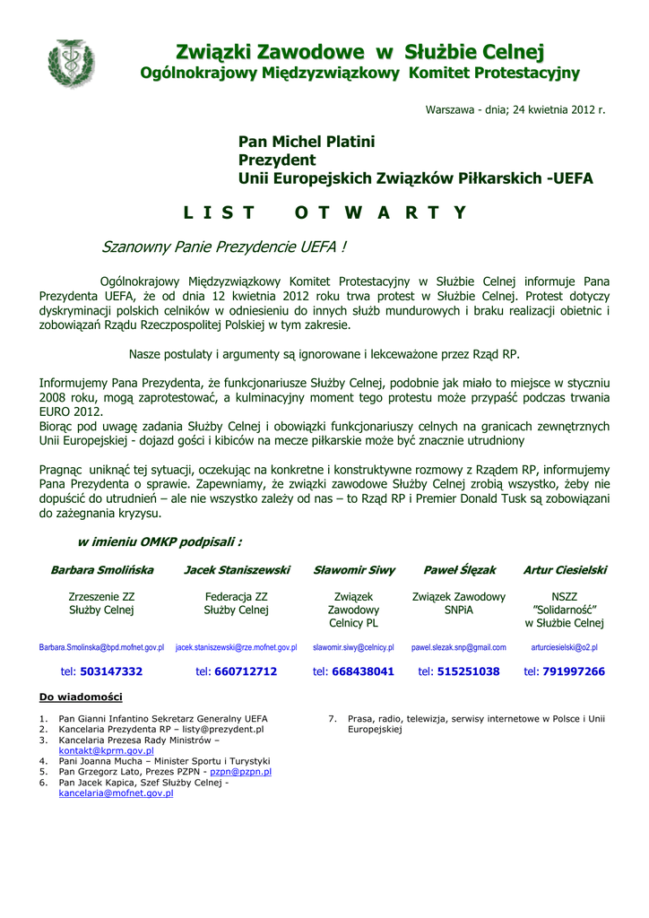 Związki Zawodowe w Służbie Celnej Ogólnokrajowy Międzyzwiązkowy Komitet Protestacyjny Warszawa - dnia; 24 kwietnia 2012 r. Pan Michel Platini Prezydent Unii Europejskich Związków Piłkarskich -UEFA L I S T O T W A R T Y Szanowny Panie Prezydencie UEFA ! Ogólnokrajowy Międzyzwiązkowy Komitet Protestacyjny w Służbie Celnej informuje Pana Prezydenta UEFA, że od dnia 12 kwietnia 2012 roku trwa protest w Służbie Celnej. Protest dotyczy dyskryminacji polskich celników w odniesieniu do innych służb mundurowych i braku realizacji obietnic i zobowiązań Rządu Rzeczpospolitej Polskiej w tym zakresie. Nasze postulaty i argumenty są ignorowane i lekceważone przez Rząd RP. Informujemy Pana Prezydenta, że funkcjonariusze Służby Celnej, podobnie jak miało to miejsce w styczniu 2008 roku, mogą zaprotestować, a kulminacyjny moment tego protestu może przypaść podczas trwania EURO 2012. Biorąc pod uwagę zadania Służby Celnej i obowiązki funkcjonariuszy celnych na granicach zewnętrznych Unii Europejskiej - dojazd gości i kibiców na mecze piłkarskie może być znacznie utrudniony Pragnąc uniknąć tej sytuacji, oczekując na konkretne i konstruktywne rozmowy z Rządem RP, informujemy Pana Prezydenta o sprawie. Zapewniamy, że związki zawodowe Służby Celnej zrobią wszystko, żeby nie dopuścić do utrudnień – ale nie wszystko zależy od nas – to Rząd RP i Premier Donald Tusk są zobowiązani do zażegnania kryzysu. w imieniu OMKP podpisali : Barbara Smolińska Jacek Staniszewski Sławomir Siwy Paweł Ślęzak Artur Ciesielski Zrzeszenie ZZ Służby Celnej Federacja ZZ Służby Celnej Związek Zawodowy Celnicy PL Związek Zawodowy SNPiA NSZZ ”Solidarność” w Służbie Celnej [email protected] [email protected] [email protected] [email protected] [email protected] tel: 503147332 tel: 660712712 tel: 668438041 tel: 515251038 tel: 791997266 Do wiadomości 1. 2. 3. 4. 5. 6. Pan Gianni Infantino Sekretarz Generalny UEFA Kancelaria Prezydenta RP – [email protected] Kancelaria Prezesa Rady Ministrów – [email protected] Pani Joanna Mucha – Minister Sportu i Turystyki Pan Grzegorz Lato, Prezes PZPN - [email protected] Pan Jacek Kapica, Szef Służby Celnej [email protected] 7. Prasa, radio, telewizja, serwisy internetowe w Polsce i Unii Europejskiej