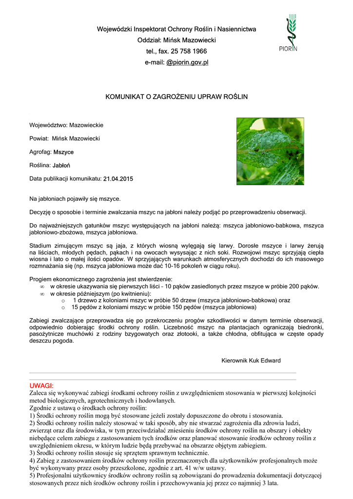 Wojewódzki Inspektorat Ochrony Roślin i Nasiennictwa Oddział: Mińsk Mazowiecki tel., fax. 25 758 1966 e-mail: @piorin.gov.pl KOMUNIKAT O ZAGROŻENIU UPRAW ROŚLIN Województwo: Mazowieckie Powiat: Mińsk Mazowiecki Agrofag: Mszyce Roślina: Jabłoń Data publikacji komunikatu: 21.04.2015 Na jabłoniach pojawiły się mszyce. Decyzję o sposobie i terminie zwalczania mszyc na jabłoni należy podjąć po przeprowadzeniu obserwacji. Do najważniejszych gatunków mszyc występujących na jabłoni należą: mszyca jabłoniowo-babkowa, mszyca jabłoniowo-zbożowa, mszyca jabłoniowa. Stadium zimującym mszyc są jaja, z których wiosną wylęgają się larwy. Dorosłe mszyce i larwy żerują na liściach, młodych pędach, pąkach i na owocach wysysając z nich soki. Rozwojowi mszyc sprzyjają ciepła wiosna i lato o małej ilości opadów. W sprzyjających warunkach atmosferycznych dochodzi do ich masowego rozmnażania się (np. mszyca jabłoniowa może dać 10-16 pokoleń w ciągu roku). Progiem ekonomicznego zagrożenia jest stwierdzenie: • w okresie ukazywania się pierwszych liści – 10 pąków zasiedlonych przez mszyce w próbie 200 pąków. • w okresie późniejszym (po kwitnieniu): o 1 drzewo z koloniami mszyc w próbie 50 drzew (mszyca jabłoniowo-babkowa) oraz o 15 pędów z koloniami mszyc w próbie 150 pędów (mszyca jabłoniowa) Zabiegi zwalczające przeprowadza się po przekroczeniu progów szkodliwości w danym terminie obserwacji, odpowiednio dobierając środki ochrony roślin. Liczebność mszyc na plantacjach ograniczają biedronki, pasożytnicze muchówki z rodziny bzygowatych oraz złotooki, a także chłodna, obfitująca w częste opady deszczu pogoda. Kierownik Kuk Edward UWAGI: Zaleca się wykonywać zabiegi środkami ochrony roślin z uwzględnieniem stosowania w pierwszej kolejności metod biologicznych, agrotechnicznych i hodowlanych. Zgodnie z ustawą o środkach ochrony roślin: 1) Środki ochrony roślin mogą być stosowane jeżeli zostały dopuszczone do obrotu i stosowania. 2) Środki ochrony roślin należy stosować w taki sposób, aby nie stwarzać zagrożenia dla zdrowia ludzi, zwierząt oraz dla środowiska, w tym przeciwdziałać zniesieniu środków ochrony roślin na obszary i obiekty niebędące celem zabiegu z zastosowaniem tych środków oraz planować stosowanie środków ochrony roślin z uwzględnieniem okresu, w którym ludzie będą przebywać na obszarze objętym zabiegiem. 3) Środki ochrony roślin stosuje się sprzętem sprawnym technicznie. 4) Zabieg z zastosowaniem środków ochrony roślin przeznaczonych dla użytkowników profesjonalnych może być wykonywany przez osoby przeszkolone, zgodnie z art. 41 w/w ustawy. 5) Profesjonalni użytkownicy środków ochrony roślin są zobowiązani do prowadzenia dokumentacji dotyczącej stosowanych przez nich środków ochrony roślin i przechowywania jej przez co najmniej 3 lata.