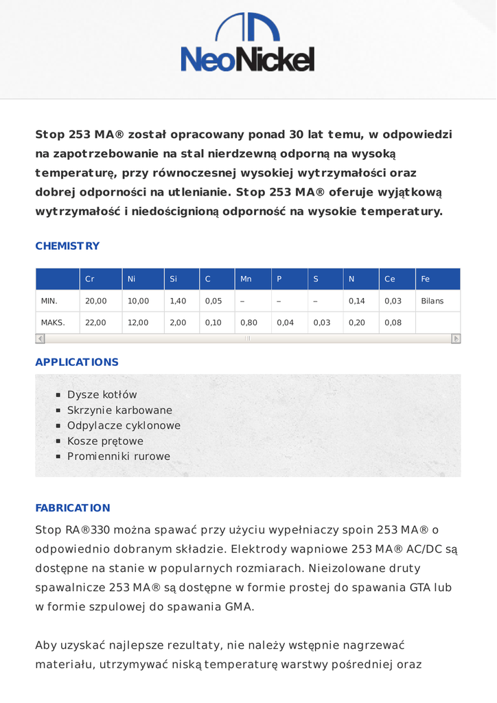 St op 253 MA® zost ał opracowany ponad 30 lat t emu, w odpowiedzi na zapot rzebowanie na st al nierdzewną odporną na wysoką t emperat urę, przy równoczesnej wysokiej wyt rzymałości oraz dobrej odporności na ut lenianie. St op 253 MA® oferuje wyjąt kową wyt rzymałość i niedoścignioną odporność na wysokie t emperat ury. CHEMIST RY Cr Ni Si C Mn P S N Ce Fe MIN. 20,00 10,00 1,40 0,05 – – – 0,14 0,03 Bilans MAKS. 22,00 12,00 2,00 0,10 0,80 0,04 0,03 0,20 0,08 APPLICAT IONS Dysze kotłów Skrzynie karbowane Odpylacze cyklonowe Kosze prętowe Promienniki rurowe FABRICAT ION Stop RA®330 można spawać przy użyciu wypełniaczy spoin 253 MA® o odpowiednio dobranym składzie. Elektrody wapniowe 253 MA® AC/DC są dostępne na stanie w popularnych rozmiarach. Nieizolowane druty spawalnicze 253 MA® są dostępne w formie prostej do spawania GTA lub w formie szpulowej do spawania GMA. Aby uzyskać najlepsze rezultaty, nie należy wstępnie nagrzewać materiału, utrzymywać niską temperaturę warstwy pośredniej oraz stosować wzmocnione spawy obrysowe. Stop 253 MA® powstaje w taki sam sposób co konwencjonalne gatunki stali nierdzewnej austenitycznej. Stop 253 MA® oraz inne gatunki stali austenitycznej są dość plastyczne w stanie wyżarzonym. Jednak podczas obróbki te stopy chromowoniklowe szybko się umacniają i ich cięcie wymaga więcej mocy niż zwykła stal węglowa. Opiłki są ciągliwe, materiał obrabiany na zimno odznacza się względnie wysoką plastycznością. OXIDAT ION 253 MA odznacza się wyjątkowo wysoką odpornością na utlenianie do około 1093°C (2000°F). Powyżej tej temperatury jego odporność na utlenianie spada. Połączenie pierwiastków ziem rzadkich i krzemu zapewnia doskonałą odporność na utlenianie tego stopu zawierającego 21% Cr. Pierwiastki ziem rzadkich zwiększają szybkość dyfuzji krzemu do powierzchni międzyfazowej zgorzeliny i metalu. Sprzyja to wytworzeniu ciągłej strefy wewnętrznego utleniania SiO2, co z kolei spowalnia rozwój tlenku. Pierwiastki ziem rzadkich poprawiają też przyleganie i elastyczność zendry, nawet w cyklicznych warunkach. Te pierwiastki ziem rzadkich (głównie cer) zwiększają liczbę miejsc nukleacji dla tlenku. Umożliwia to uzyskanie drobnoziarnistej warstwy chromu i krzemu. PROFIL WŁAŚCIWOŚCI Stop 253 MA® mimo niewielkiej zawartości niklu oferuje wyjątkową kombinację wytrzymałości na pełzanie oraz wysokiej odporności na utlenianie, siarczkowanie oraz erozję w bardzo wysokich temperaturach. Swoją wytrzymałość na wysokie temperatury zawdzięcza on ścisłej kontroli mikrododatków stopowych, natomiast czasowa wytrzymałość na pełzanie jest wynikiem kombinacji azotu, węgla oraz ceru, a doskonałą odporność na utlenianie (do 1093°C (2000°F)) to zasługa połączenia ceru i krzemu. Wszystkie te cechy sprawiają, iż jest to wysokiej jakości stop, bardziej opłacalny od większości innych stopów odpornych na wysoką temperaturę. Cechy: Odporność na utlenianie do 1093°C (2000°F) Doskonała odporność na siarczkowanie Doskonała wytrzymałość w podwyższonych temperaturach Dobra odporność na ścieranie w wysokich temperaturach Wysoka opłacalność Przy szerokiej gamie zastosowań, które obejmują wiele sektorów przemysłowych stop 253 MA firmy NeoNickel jest bardzo popularnym materiałem, który oferuje doskonałą wytrzymałość oraz wysoki poziom odporności na utlenianie i wysokie temperatury, w przystępniejszej cenie. Będąc jednym z wiodących europejskich dostawców stopów specjalistycznych, zaopatrujemy klientów w najwyższej klasy materiały, które dobrze sprawdzają się nawet w najbardziej ekstremalnych środowiskach. Stop RA253 Ma z pewnością należy do takich materiałów. Skont akt uj się z nami, aby uzyskać więcej informacji na t emat st opu 253 MA®! ZWYCZAJOWE NAZWY HANDLOWE UNS S30815