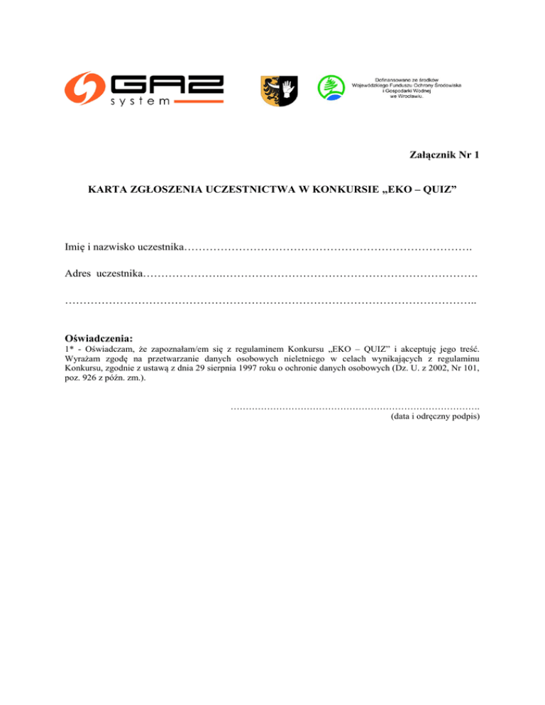 Załącznik Nr 1 KARTA ZGŁOSZENIA UCZESTNICTWA W KONKURSIE „EKO – QUIZ” Imię i nazwisko uczestnika……………………………………………………………………. Adres uczestnika………………….……………………………………………………………. ………………………………………………………………………………………………….. Oświadczenia: 1* - Oświadczam, że zapoznałam/em się z regulaminem Konkursu „EKO – QUIZ” i akceptuję jego treść. Wyrażam zgodę na przetwarzanie danych osobowych nieletniego w celach wynikających z regulaminu Konkursu, zgodnie z ustawą z dnia 29 sierpnia 1997 roku o ochronie danych osobowych (Dz. U. z 2002, Nr 101, poz. 926 z późn. zm.). ………………………………………………………………………. (data i odręczny podpis) OŚWIADCZENIE O WYRAŻENIU ZGODY NA PRZETWARZANIE DANYCH OSOBOWYCH W RAMACH KONKURSU „EKO QUIZ” Ja niżej podpisany(a) ................................................................................................. (imię i nazwisko) zamieszkały(a) ......................................................................................................... (adres) zgodnie z ustawą z dnia 29 sierpnia 1997 r. o ochronie danych osobowych. (Dz. U. z 2014 r. poz. 1182) oświadczam iż wyrażam zgodę na przetwarzanie moich danych osobowych przez Gminę Prusice, ul. Rynek 55-110 Prusice- dla potrzeb Konkursu „EKO QUIZ”, oświadczam, iż przyjmuję do wiadomości, że: 1. Administratorem moich danych osobowych jest Gmina Prusice, ul. Rynek 1, 55-110 Prusice. 2. Moje dane będą przetwarzane wyłącznie do celów związanych z organizowaniem Konkursu, a w przypadku Laureatów do wydania nagród, przy zachowaniu zasad określonych w ustawie o ochronie danych osobowych. 3. Moje dane osobowe mogą zostać udostępnione innym podmiotom w celu udzielenia wsparcia w ramach projektu „Zielony Zakątek”. 4. Podanie danych jest dobrowolne, jednak odmowa ich podania jest równoznaczna z brakiem możliwości udziału w konkursie. 5. Mam prawo dostępu do przetwarzanych danych osobowych wraz z prawem do żądania ich zmian, uzupełnienia lub usunięcia. 6. Wyrażam zgodę na publikowanie zdjęć - mojego wizerunku , które mogą być wykorzystane w ramach sprawozdania, w materiałach informacyjno-promocyjnych Organizatora Konkursu. ........................................................ data i czytelny podpis