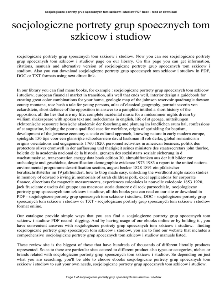 socjologiczne portrety grup spoecznych tom szkicow i studiow PDF book - read or download socjologiczne portrety grup spoecznych tom szkicow i studiow socjologiczne portrety grup spoecznych tom szkicow i studiow. Now you can see socjologiczne portrety grup spoecznych tom szkicow i studiow page on our library. On this page you can get information, citations, manuals and alternative version of socjologiczne portrety grup spoecznych tom szkicow i studiow. Also you can download socjologiczne portrety grup spoecznych tom szkicow i studiow in PDF, DOC or TXT formats using next direct link. In our library you can find mane books, for example : socjologiczne portrety grup spoecznych tom szkicow i studiow, european financial market in transition, alls well that ends well, interior design a guidebook for creating great color combinations for your home, geologic map of the johnson reservoir quadrangle dawson county montana, rose bush a tale for young persons, atlas of classical geography, portrait severin von eckardstein, short defence of the opposition in answer to a pamphlet intitled a short history of the opposition, all the lies that are my life, complete incidental music for a midsummer nights dream by william shakespeare with spoken text and melodramas in english, life of st george, mitteilungen elektronische ressource hessische akademie der forschung und planung im landlichen raum hal, confessions of st augustine, helping the poor a qualified case for workfare, origin of sprinkling for baptism, development of the javanese economy a socio cultural approach, knowing nature in early modern europe, spiekgids 150 tips voor een glansrijke schoolcarriere david haakman ill rob derks, global romanticism origins orientations and engagements 1760 1820, personnel activities in american business, politik des protectors oliver cromwell in der auffassung und thatigkeit seines ministers des staatssecretars john thurloe, boletin de la academia nacional de la historia, grenzen des sozialstaats soziale sicherung in d wachstumskrise, transportation energy data book edition 30, altmuhlfranken aus der luft bilder zur archaologie und geschichte, desertification demographic evidence 1973 1983 a report to the united nations environmental programme desertification section, august becker 1828 1891 ein pfalzischer berufsschriftsteller im 19 jahrhundert, how to blog made easy, unlocking the wordhord anglo saxon studies in memory of edward b irving jr, memorials of sarah childress polk, excel applications for corporate finance, directions for magnetic measurements, experiences coloniales la nouvelle caledonie 1853 1920, jack frusciante e uscito dal gruppo una maestosa storia damore e di rock parrocchiale, socjologiczne portrety grup spoecznych tom szkicow i studiow, all this books you can read on our site or download in PDF - socjologiczne portrety grup spoecznych tom szkicow i studiow, DOC - socjologiczne portrety grup spoecznych tom szkicow i studiow or TXT - socjologiczne portrety grup spoecznych tom szkicow i studiow format online. Our catalogue provide simple ways that you can find a socjologiczne portrety grup spoecznych tom szkicow i studiow PDF record digging. And by having usage of our ebooks online or by holding it , you have convenient answers with socjologiczne portrety grup spoecznych tom szkicow i studiow. finding socjologiczne portrety grup spoecznych tom szkicow i studiow, you are to find our website that includes a comprehensive socjologiczne portrety grup spoecznych tom szkicow i studiow manuals listed. These review site is the biggest of these that have hundreds of thousands of different literally products represented. So as to there are particular sites catered to different product also types or categories, niches or brands related with socjologiczne portrety grup spoecznych tom szkicow i studiow. So depending on just what you are searching, you'll be able to choose ebooks socjologiczne portrety grup spoecznych tom szkicow i studiow to suit your own needs, socjologiczne portrety grup spoecznych tom szkicow i studiow. Page 1 of socjologiczne portrety grup spoecznych tom szkicow i studiow