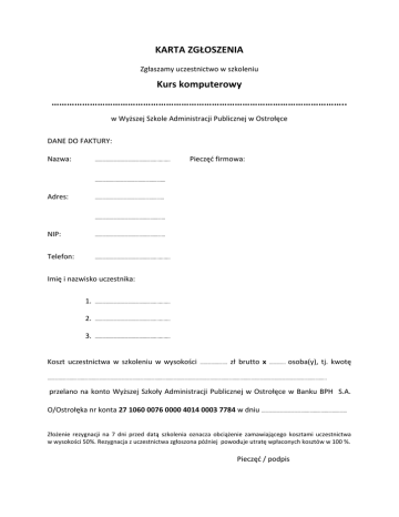 KARTA ZGŁOSZENIA Zgłaszamy uczestnictwo w szkoleniu Kurs komputerowy …………………………………………………………………………………………………….. w Wyższej Szkole Administracji Publicznej w Ostrołęce DANE DO FAKTURY: Nazwa: …………………………………………............ Pieczęć firmowa: ……………..…………………………………. Adres: …………………..…………………………… ………………………………………………… NIP: ………………………………………………… Telefon: …………………………………………............ Imię i nazwisko uczestnika: 1. …………………………………………............ 2. …………………………………………............ 3. …………………………………………............ Koszt uczestnictwa w szkoleniu w wysokości …………………. zł brutto x ……….... osoba(y), tj. kwotę …………………………………………………………………………………………………………………………………………………….………………………………………………... przelano na konto Wyższej Szkoły Administracji Publicznej w Ostrołęce w Banku BPH S.A. O/Ostrołęka nr konta 27 1060 0076 0000 4014 0003 7784 w dniu ………………………..……….………………………… Złożenie rezygnacji na 7 dni przed datą szkolenia oznacza obciążenie zamawiającego kosztami uczestnictwa w wysokości 50%. Rezygnacja z uczestnictwa zgłoszona później powoduje utratę wpłaconych kosztów w 100 %. Pieczęć / podpis