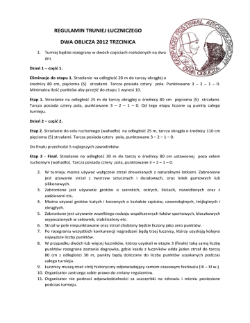 REGULAMIN TRUNIEJ ŁUCZNICZEGO DWA OBLICZA 2012 TRZCINICA 1. Turniej będzie rozegrany w dwóch częściach rozłożonych na dwa dni. Dzień 1 – część 1. Eliminacje do etapu 1. Strzelanie na odległość 20 m do tarczy okrągłej o średnicy 80 cm, pięcioma (5) strzałami. Tarcza posiada cztery pola. Punktowane 3 – 2 – 1 – 0. Minimalna ilość punktów aby przejść do etapu 1 wynosi 10. Etap 1. Strzelanie na odległość 25 m do tarczy okrągłej o średnicy 80 cm pięcioma (5) strzałami. Tarcza posiada cztery pola, punktowane 3 – 2 – 1 – 0. Od tego etapu liczone są punkty całego turnieju. Dzień 2 – część 2. Etap 2. Strzelanie do celu ruchomego (wahadło) na odległość 25 m, tarcza okrągła o średnicy 110 cm pięcioma (5) strzałami. Tarcza posiada cztery pola, punktowane 3 – 2 – 1 – 0. Do finału przechodzi 5 najlepszych zawodników. Etap 3 - Finał. Strzelanie na odległość 30 m do tarczy o średnicy 80 cm ustawionej poza celem ruchomym (wahadło). Tarcza posiada cztery pola, punktowane 3 – 2 – 1 – 0. 2. W turnieju można używać wyłącznie strzał drewnianych z naturalnymi lotkami. Zabronione jest używanie strzał z tworzyw sztucznych i duralowych, oraz lotek gumowych lub silikonowych. 3. Zabronione jest używanie grotów o szerokich, ostrych, liściach, rozwidlonych oraz z zadziorami etc. 4. Można używać grotów kutych i toczonych o kształcie szpiców, czworokątnych, trójkątnych i okrągłych. 5. Zabronione jest używanie wszelkiego rodzaju współczesnych łuków sportowych, bloczkowych wyposażonych w celownik, stabilizatory etc. 6. Strzał w pole niepunktowane oraz strzał chybiony będzie liczony jako zero punktów. 7. Po rozegraniu wszystkich konkurencji nagradzani będą trzej łucznicy, którzy uzyskają kolejno najwyższe liczby punktów. 8. W przypadku dwóch lub więcej łuczników, którzy uzyskali w etapie 3 (finale) taką samą liczbę punktów rozegrana zostanie dogrywka, gdzie każdy z łuczników odda jeden strzał do tarczy 80 cm z odległości 30 m, punkty będą doliczone do liczby punktów uzyskanych podczas całego turnieju. 9. Łucznicy muszą mieć strój historyczny odpowiadający ramom czasowym festiwalu (IX – XI w.). 10. Organizator zastrzega sobie prawo do zmiany regulaminu. 11. Organizator nie podnosi odpowiedzialności za uszczerbki na zdrowiu i mieniu poniesione podczas turnieju.