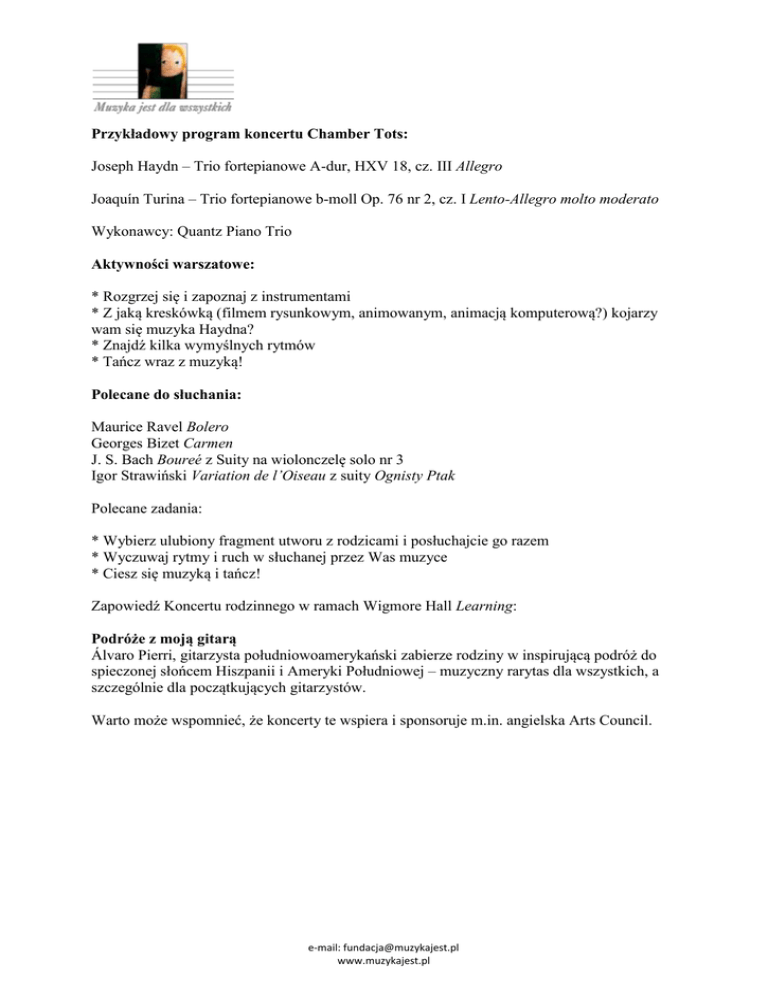 Przykładowy program koncertu Chamber Tots: Joseph Haydn – Trio fortepianowe A-dur, HXV 18, cz. III Allegro Joaquín Turina – Trio fortepianowe b-moll Op. 76 nr 2, cz. I Lento-Allegro molto moderato Wykonawcy: Quantz Piano Trio Aktywności warszatowe: * Rozgrzej się i zapoznaj z instrumentami * Z jaką kreskówką (filmem rysunkowym, animowanym, animacją komputerową?) kojarzy wam się muzyka Haydna? * Znajdź kilka wymyślnych rytmów * Tańcz wraz z muzyką! Polecane do słuchania: Maurice Ravel Bolero Georges Bizet Carmen J. S. Bach Boureé z Suity na wiolonczelę solo nr 3 Igor Strawiński Variation de l’Oiseau z suity Ognisty Ptak Polecane zadania: * Wybierz ulubiony fragment utworu z rodzicami i posłuchajcie go razem * Wyczuwaj rytmy i ruch w słuchanej przez Was muzyce * Ciesz się muzyką i tańcz! Zapowiedź Koncertu rodzinnego w ramach Wigmore Hall Learning: Podróże z moją gitarą Álvaro Pierri, gitarzysta południowoamerykański zabierze rodziny w inspirującą podróż do spieczonej słońcem Hiszpanii i Ameryki Południowej – muzyczny rarytas dla wszystkich, a szczególnie dla początkujących gitarzystów. Warto może wspomnieć, że koncerty te wspiera i sponsoruje m.in. angielska Arts Council. e-mail: [email protected] www.muzykajest.pl