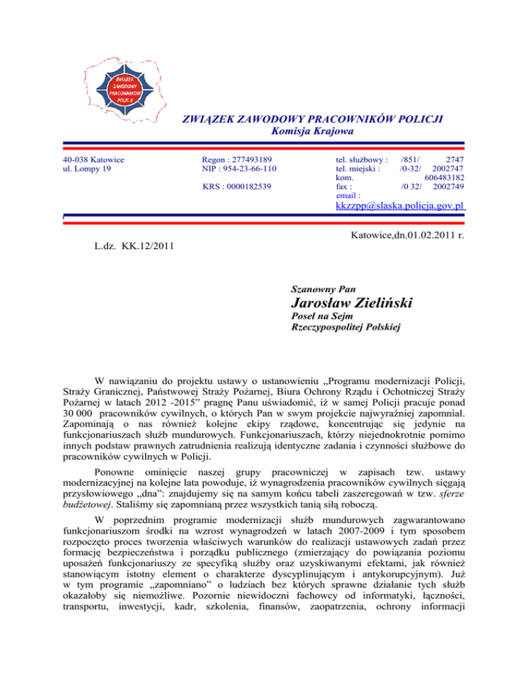ZWIĄZEK ZAWODOWY PRACOWNIKÓW POLICJI Komisja Krajowa ----------------------------------------------------------------------------------------------------------------------------------------------------------------------------------------------------------------------------------------------------------------------------------------------------------------------------------------------------------------------------------------------------------------------------------------------------------------------------------------------------------------------------------------------------------------------------------------------------------------------------------------------------------------------------------------------------------------------------------------------------------------------------------------------------------------------------------------------------------------------------------------------------------------------------------------- 40-038 Katowice ul. Lompy 19 Regon : 277493189 NIP : 954-23-66-110 KRS : 0000182539 tel. służbowy : tel. miejski : kom. fax : email : /851/ /0-32/ 2747 2002747 606483182 /0 32/ 2002749 [email protected] ---------------------------------------------------------------------------------------------------------------------------------------------------------------------------------------------------------------------------------------------------------------------------------------------------------------------------------------------------------------------------------------------------------------------------------------------------------------------------------------------------------------------------------------------------------------------------------------------------------------------------------------------------------------------------------------------------------------------------------------------------------------------------------------------------------------------------------------------------------------------------------------------------------------------------------------- Katowice,dn.01.02.2011 r. L.dz. KK.12/2011 Szanowny Pan Jarosław Zieliński Poseł na Sejm Rzeczypospolitej Polskiej W nawiązaniu do projektu ustawy o ustanowieniu „Programu modernizacji Policji, Straży Granicznej, Państwowej Straży Pożarnej, Biura Ochrony Rządu i Ochotniczej Straży Pożarnej w latach 2012 -2015” pragnę Panu uświadomić, iż w samej Policji pracuje ponad 30 000 pracowników cywilnych, o których Pan w swym projekcie najwyraźniej zapomniał. Zapominają o nas również kolejne ekipy rządowe, koncentrując się jedynie na funkcjonariuszach służb mundurowych. Funkcjonariuszach, którzy niejednokrotnie pomimo innych podstaw prawnych zatrudnienia realizują identyczne zadania i czynności służbowe do pracowników cywilnych w Policji. Ponowne ominięcie naszej grupy pracowniczej w zapisach tzw. ustawy modernizacyjnej na kolejne lata powoduje, iż wynagrodzenia pracowników cywilnych sięgają przysłowiowego „dna”: znajdujemy się na samym końcu tabeli zaszeregowań w tzw. sferze budżetowej. Staliśmy się zapomnianą przez wszystkich tanią siłą roboczą. W poprzednim programie modernizacji służb mundurowych zagwarantowano funkcjonariuszom środki na wzrost wynagrodzeń w latach 2007-2009 i tym sposobem rozpoczęto proces tworzenia właściwych warunków do realizacji ustawowych zadań przez formację bezpieczeństwa i porządku publicznego (zmierzający do powiązania poziomu uposażeń funkcjonariuszy ze specyfiką służby oraz uzyskiwanymi efektami, jak również stanowiącym istotny element o charakterze dyscyplinującym i antykorupcyjnym). Już w tym programie „zapomniano” o ludziach bez których sprawne działanie tych służb okazałoby się niemożliwe. Pozornie niewidoczni fachowcy od informatyki, łączności, transportu, inwestycji, kadr, szkolenia, finansów, zaopatrzenia, ochrony informacji niejawnych i wielu innych - swoją codzienną pracą umożliwiają funkcjonariuszom prawidłowe wykonanie obowiązków i czynności służbowych. Jesteśmy zaniepokojeni lekceważeniem roli logistyki w Policji zwłaszcza w obliczu czekającego nas niebawem wielkiego wyzwania jakim jest m.in. zbliżające się Euro 2012 i olbrzymiej roli Policji w tym przedsięwzięciu. Nie od dzisiaj wiadomo, że sprawna logistyka zapewnia zwycięstwa w wojnach i sprawne funkcjonowanie aparatu państwa. Należy ubolewać, że nikt z decydentów nie chce dostrzec tej jakże ważnej grupy pracowników. Kolejni Ministrowie Spraw Wewnętrznych i Administracji ubolewają nad naszą niedolą, lecz żaden z nich nie podjął jakichkolwiek działań zmierzających do naprawy błędów swoich poprzedników, którzy stale pomijając pracowników Policji z kolejnych nowelizacji ustawodawczych polepszają sytuację finansową funkcjonariuszy - pogłębiają dysproporcje pomiędzy grupami pracowniczymi zatrudnionymi w jednej instytucji budżetowej. Tym samym doprowadzają do łamania przepisów prawa określonych w art. 18 Kodeksu Pracy, kategorycznie zabraniających dyskryminacji pracowników w zatrudnieniu. W imieniu Komisji Krajowej Związku Zawodowego Pracowników Policji, wnoszę do Pana Posła o uwzględnienie pracowników Policji w projekcie ustawy „Program modernizacji Policji, Straży Granicznej, Państwowej Straży Pożarnej, Biura Ochrony Rządu i Ochotniczej Straży Pożarnej w latach 2012 - 2015” a tym samym zagwarantowanie nam należnej podwyżki wynagrodzeń oraz rozpoczęcie tworzenia procesu motywacyjnego systemu uposażeń. Takie działanie choć w niewielkim stopniu przyczyni się do zniwelowania negatywnych następstw braku waloryzacji płac w latach 2010 i 2011, jak również będzie stanowić pierwszy krok w kierunku wydźwignięcia tej grupy pracowniczej z przepaści dzielącej ich wynagrodzenia od wysokości wynagrodzeń pracowników z pozostałych urzędów sfery budżetowej. V-CE PRZEWODNICZĄCY KOMISJI KRAJOWEJ