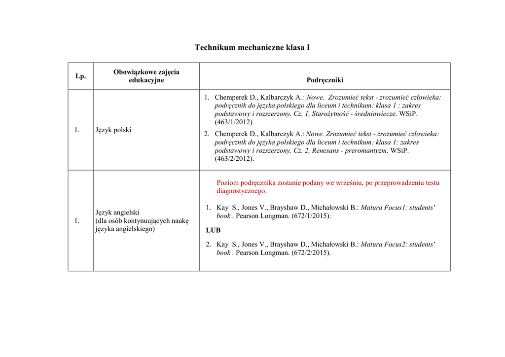 Technikum mechaniczne klasa I Lp. 1. Obowiązkowe zajęcia edukacyjne Język polski Podręczniki 1. Chemperek D., Kalbarczyk A.: Nowe. Zrozumieć tekst - zrozumieć człowieka: podręcznik do języka polskiego dla liceum i technikum: klasa 1 : zakres podstawowy i rozszerzony. Cz. 1, Starożytność - średniowiecze. WSiP. (463/1/2012). 2. Chemperek D., Kalbarczyk A.: Nowe. Zrozumieć tekst - zrozumieć człowieka: podręcznik do języka polskiego dla liceum i technikum: klasa 1: zakres podstawowy i rozszerzony. Cz. 2, Renesans - preromantyzm. WSiP. (463/2/2012). Poziom podręcznika zostanie podany we wrześniu, po przeprowadzeniu testu diagnostycznego. 1. Język angielski (dla osób kontynuujących naukę języka angielskiego) 1. Kay S., Jones V., Brayshaw D., Michałowski B.: Matura Focus1: students' book . Pearson Longman. (672/1/2015). LUB 2. Kay S., Jones V., Brayshaw D., Michałowski B.: Matura Focus2: students' book . Pearson Longman. (672/2/2015). Poziom podręcznika zostanie podany we wrześniu, po przeprowadzeniu testu diagnostycznego. 2. Język niemiecki (dla osób kontynuujących naukę języka niemieckiego) 1. Mróz-Dwornikowska S., Górecka U.: Meine Welttour 1: język niemiecki dla szkół ponadgimnazjalnych. Nowa Era. (753/1/2015). LUB Mróz-Dwornikowska S., Górecka U.: Meine Welttour 2: język niemiecki dla szkół ponadgimnazjalnych. Nowa Era. 1. Migdalska Grażyna, Billard-Woźniak Cécile, Szczucka-Smagowicz Monika: Déjà-vu 1: język francuski dla szkół ponadgimnazjalnych: podręcznik. Wydawnictwo Szkolne PWN (420/1/2012). 3. Język francuski (dla osób kontynuujących naukę języka francuskiego) 4. Wiedza o kulturze 1. Bokiniec M., Forysiewicz B. i In.: Spotkania z kulturą: podręcznik do wiedzy o kulturze dla liceum i technikum. Warszawa 2011. Nowa Era (449/2012). 5. Historia 1. Roszak S., Kłaczkow J.: Poznać przeszłość: wiek XX: podręcznik do historii dla szkół ponadgimnazjalnych: zakres podstawowy. Nowa Era (525/2012). 6. Wiedza o społeczeństwie 1. Janicki A.: W centrum uwagi: wiedza o społeczeństwie: podręcznik dla szkół ponadgimnazjalnych: zakres podstawowy. Nowa Era (505/2012). 7. Podstawy przedsiębiorczości 1. Makieła Z., Rachwał T.: Krok w przedsiębiorczość: podręcznik do podstaw przedsiębiorczości dla szkół ponadgimnazjalnych. Nowa Era (467/2012). 2. Ratuszniak A., Migdalska G., Szczucka-Smagowicz M.: Déjà-vu 1: język francuski dla szkół ponadgimnazjalnych: zeszyt ćwiczeń. Wydawnictwo Szkolne PWN (420/1/2012). 8. Geografia 1. Uliszak R., Wiedermann K.: Oblicza geografii: podręcznik dla szkół ponadgimnazjalnych: zakres podstawowy. Nowa Era (433/2012). 9. Biologia 1. Bonar Emilia, Krzeszowiec-Jeleń Weronika, Czachorowski Stanisław: Biologia na czasie: podręcznik dla szkół ponadgimnazjalnych: zakres podstawowy. Nowa Era (450/2014). 10. Chemia 1. Gulińska H., Kuśmierczyk K.: Chemia po prostu : podręcznik do szkół ponadgimnazjalnych : zakres podstawowy. WSiP (523/2012). 11. Fizyka 1. Kornaś G.: Fizyka : podręcznik dla szkół ponadgimnazjalnych : zakres podstawowy. Odkrywamy na nowo. Operon (621/2012). 12. Matematyka 13. Informatyka 14. Edukacja dla bezpieczeństwa 15. Religia / Etyka 1. Kurczab M., Kurczab E., Świda E.: Matematyka 1: podręcznik do liceów i techników klasa 1: zakres podstawowy. Oficyna Wydawnicza Krzysztof Pazdro (412/1/2012). 1. Nowakowski Z: Informatyka po prostu : podręcznik do szkół ponadgimnazjalnych : zakres podstawowy. WSiP (516/2012). 1. Boniek B., Kruczyński A., Wrycz-Rekowski Ł.:. Edukacja dla bezpieczeństwa: podręcznik dla szkół ponadgimnazjalnych. Seria Ciekawi świata. Operon (409/2012). 1. Szpet j., Jackowiak D.: Moja misja w świecie: podręcznik do nauki religii dla pierwszej klasy szkół ponadgimnazjalnych. Wydawnictwo św. Wojciecha (AZ-41-01/10-PO-1/11). 2. Kołodziński P., Kapiszewski J.: Etyka: zakres podstawowy. Operon (408/2011). 16. Wychowanie do życia w rodzinie 1. Grzelak K., Telega J., Torzewskli J.: Podstawy konstrukcji maszyn. WSiP. 17. Podstawy konstrukcji maszyn 2. Rutkowski a.: Części maszyn. WSiP (07/2007). 18. Podstawy sterowania i regulacji maszyn 1. Jabłoński W. Płoszajski G.: Elektrotechnika z automatyką.. WSiP. 19. Technologia obróbki skrawaniem 1. Figurski J.: Wykonywanie elementów maszyn, urządzeń i narzędzi metodą obróbki maszynowej. WSiP. 2. Legutko S.: Obsługa maszyn i urządzeń. WSiP (4/2013). 20. Konstrukcje maszyn 1. Lewandowski T.: Rysunek techniczny dla mechaników. WSiP. 2. Lewandowski T.: Zbiór zadań z rysunku technicznego dla mechaników. WSiP. TECHNIKUM MECHANICZNE Klasa II Lp. Obowiązkowe zajęcia edukacyjne 1. Język polski 2. Język angielski 2. Język niemiecki Podręczniki 1. Chemperek D., Kalbarczyk A.: Nowe. Zrozumieć tekst - zrozumieć człowieka: podręcznik do języka polskiego dla liceum i technikum: klasa 1: zakres podstawowy i rozszerzony. Cz. 2, Renesans - preromantyzm. WSiP. ( 463/2/2012). 2. Kalbarczyk A., Trześniowski D., Chemperek D.: Nowe. Zrozumieć tekst zrozumieć człowieka: podręcznik do języka polskiego dla liceum i technikum: klasa 2: zakres podstawowy i rozszerzony. Cz. 1, Wiek XIX. WSiP. (463/3/2012). 1. Kay S., Jones V., Brayshaw D., Michałowski B.: Matura Focus Kolejna część po klasie pierwszej 2. Mróz-Dwornikowska S., Górecka U.: Meine Welttour Kolejna część po klasie pierwszej 1. Migdalska Grażyna, Billard-Woźniak Cécile, Szczucka-Smagowicz Monika: Déjà-vu 1: język francuski dla szkół ponadgimnazjalnych: podręcznik. Wydawnictwo Szkolne PWN (420/1/2012). 3. Język francuski 2. Ratuszniak A., Migdalska G., Szczucka-Smagowicz M.: Déjà-vu 1: język francuski dla szkół ponadgimnazjalnych: zeszyt ćwiczeń. Wydawnictwo Szkolne PWN (420/1/2012). 3. Migdalska Grażyna, Billard-Woźniak Cécile, Szczucka-Smagowicz Monika: Déjà-vu 2: język francuski dla szkół ponadgimnazjalnych: podręcznik. . Wydawnictwo Szkolne PWN (420/2/2012). 4. Ratuszniak A., Migdals