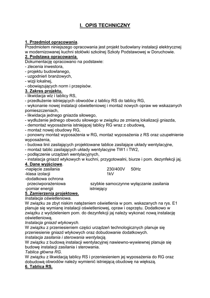 I. OPIS TECHNICZNY 1. Przedmiot opracowania. Przedmiotem niniejszego opracowania jest projekt budowlany instalacji elektrycznej w modernizowanej kuchni stołówki szkolnej Szkoły Podstawowej w Doruchowie. 2. Podstawa opracowania. Dokumentację opracowano na podstawie: - zlecenia inwestora, - projektu budowlanego, - uzgodnień branŜowych, - wizji lokalnej, - obowiązujących norm i przepisów. 3. Zakres projektu. - likwidacja wlz i tablicy RS, - przedłuŜenie istniejących obwodów z tablicy RS do tablicy RG, - wykonanie nowej instalacji oświetleniowej i montaŜ nowych opraw we wskazanych pomieszczeniach, - likwidacja jednego gniazda siłowego, - wydłuŜenie jednego obwodu siłowego w związku ze zmianą lokalizacji gniazda, - demontaŜ wyposaŜenia istniejącej tablicy RG wraz z obudową, - montaŜ nowej obudowy RG, - ponowny montaŜ wyposaŜenia w RG, montaŜ wyposaŜenia z RS oraz uzupełnienie wyposaŜenia, - budowa linii zasilających projektowane tablice zasilające układy wentylacyjne, - montaŜ tablic zasilających układy wentylacyjne TW1 i TW2, - podłączenie urządzeń wentylacyjnych, - instalacja gniazd wtykowych w kuchni, przygotowalni, biurze i pom. dezynfekcji jaj. 4. Dane wyjściowe. -napięcie zasilania 230/400V 50Hz -klasa izolacji 1kV -dodatkowa ochrona przeciwporaŜeniowa szybkie samoczynne wyłączanie zasilania -pomiar energii istniejący 5. Zamierzenia projektowe. Instalacja oświetleniowa. W związku ze zbyt niskim natęŜeniem oświetlenia w pom. wskazanych na rys. E1 planuje się wymianę instalacji oświetleniowej, opraw i osprzętu. Dodatkowo w związku z wydzieleniem pom. do dezynfekcji jaj naleŜy wykonać nową instalację oświetleniową. Instalacja gniazd wtykowych. W związku z przeniesieniem części urządzeń technologicznych planuje się przeniesienie gniazd wtykowych oraz dobudowanie dodatkowych. Instalacja zasilania i sterowania wentylacją. W związku z budową instalacji wentylacyjnej nawiewno-wywiewnej planuje się budowę instalacji zasilania i sterowania. Tablica główna RG. W związku z likwidacją tablicy RS i przeniesieniem jej wyposaŜenia do RG oraz dobudową obwodów naleŜy wymienić istniejącą obudowę na większą. 6. Tablica RS. Obudowę tablicy RS wraz z wyposaŜeniem zdemontować. Ponad projektowanymi drzwiami wykonać 5 puszek p/t i od nich wydłuŜyć istniejące obwody do RG przewodami odpowiedniego typu. 7. Tablica RG. Obudowę tablicy RG (4 obudowy 2x12 wnękowe) wraz z wyposaŜeniem zdemontować. Po powiększeniu wnęki zamontować obudowę 6x24 wnekową. W nowej obudowie zamontować istniejące wyposaŜenie RG, dalej wyposaŜenie z tablicy RS oraz projektowane. Schemat RG pokazano na rys. E5. 8. Instalacje oświetlenia i gniazd wtykowych. W pomieszczeniu przygotowalni, kuchni, zmywalni, ekspedycji oraz biurze i pom. dezynfekcji wykonać nową instalację oświetleniową przewodami YDYpŜo 3x1,5,750V. Przewody układać pod tynkiem. Stosować typowy osprzęt hermetyczny o stopniu ochrony min. IP44. Przełączniki montować na wysokości 1,3m.Ilość opraw oświetleniowych i ich rozmieszczenie dobrano za pomocą programu DIALUX. Załączanie oświetlenia zaprojektowano za pośrednictwem łączników pojedynczych i świecznikowych. Dwie oprawy zamontować na ścianie pod okapem i załączać osobnym wyłącznikiem. Szczegóły dotyczące rozmieszczenia gniazd i przyłączy przedstawiono na rys. E1. Obwody gniazd wtykowych wykonać przewodami typu YDYpŜo 3x2,5,750V. Przewody układać pod tynkiem. Projektowane gniazda słuŜą do zasilania urządzeń przenośnych w ciągach przygotowawczych. Stosować gniazda hermetyczne z wyjątkiem pomieszczenia biurowego. Szczegóły dotyczące rozmieszczenia gniazd przedstawiono na rys. E2. 9. Gniazda siłowe. Lokalizacja istniejących gniazd siłowych pozostaje bez zmian z wyjątkiem zestawu 3 gniazd. Z wymienionego zestawu jedno pozostaje bez zmian, drugie podlega likwidacji, natomiast trzecie po zdemontowaniu naleŜy przenieść pod okap obok istniejącego do zasilania patelni. 10. Zasilanie i sterowanie wentylacją. Do zasilania i sterowania 2 układów wentylacyjnych nawiewno-wywiewnych z nagrzewnicami przewidziano 2 tablice TW1 i TW2. Tablice naleŜy zasilić dwoma liniami z tablicy RG i umieścić poniŜej kanałów wentylacyjnych. Schematy tablic pokazano na rys. E3 i E4. Załączanie przewidziano za pomocą hermetycznych łączników w zestawach ŁR1 i ŁR2. Łaczniki umieścić przy drzwiach zgodnie z planem na rys. E2. Automatyka sterowania ma za zadanie zgodnie z wytycznymi zblokować pracę układu nawiew-wywiew oraz zapewnić współpracę z nagrzewnicami. WyposaŜenie tablic stanowią: - wyłączniki róŜnicowoprądowe, - wyłączniki nadprądowe, - wyłączniki silnikowe, - styczniki, - lampki kontrolne. Dodatkowe wentylatory w przygotowalni i ekspedycji zasilić z najbliŜszej puszki oświetleniowej i sterować za pomocą osobnego łącznika hermetycznego. Wszystkie urządzenia wentylacyjne znajdują się w zakresie dostawy wykonawcy instalacji wentylacyjnej. Przed wykonaniem instalacji zasilającej i sterującej wentylacją wykonawca winien zapoznać się z dokumentacją branŜową. 11. Uziemienie urządzeń wyposaŜenia kuchni. Wszystkie urządzenia elektryczne staranie przyłączyć do przewodu ochronnego PE. Dodatkowo w kuchni na wysokości 0,3m nad posadzką zamontować magistralę uziemiającą w postaci płaskownika Fe/Zn 30x4 pomalowanego w ukośne pasy Ŝółto-zielone. Do magistrali za pomocą przewodu LYŜo 4 przyłączyć wszystkie metalowe obudowy urządzeń wyposaŜenia, duŜe metalowe masy, kanały wentylacyjne. Magistralę przyłączyć do szyny PE w RG za pomocą przewodu LgY 6 układanym w rurze karbowanej p/t. 12. Ochrona przeciwprzepięciowa instalacji. W RG zamontować ponownie ochronnik klasy II. 13. Ochrona przeciwporaŜeniowa. Ochrona przeciwporaŜeniowa realizowana jest przez: - wzmocnioną izolację roboczą (750V), - stosowanie przewodu 