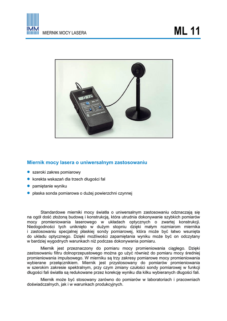 MIERNIK MOCY LASERA ML 11 Miernik mocy lasera o uniwersalnym zastosowaniu • • • • szeroki zakres pomiarowy korekta wskazań dla trzech długości fal pamiętanie wyniku płaska sonda pomiarowa o dużej powierzchni czynnej Standardowe mierniki mocy światła o uniwersalnym zastosowaniu odznaczają się na ogół dość złożoną budową i konstrukcją, która utrudnia dokonywanie szybkich pomiarów mocy promieniowania laserowego w układach optycznych o zwartej konstrukcji. Niedogodności tych uniknięto w dużym stopniu dzięki małym rozmiarom miernika i zastosowaniu specjalnej płaskiej sondy pomiarowej, która może być łatwo wsunięta do układu optycznego. Dzięki możliwości zapamiętania wyniku może być on odczytany w bardziej wygodnych warunkach niż podczas dokonywania pomiaru. Miernik jest przeznaczony do pomiaru mocy promieniowania ciągłego. Dzięki zastosowaniu filtru dolnoprzepustowego można go użyć również do pomiaru mocy średniej promieniowania impulsowego. W mierniku są trzy zakresy pomiarowe mocy promieniowania wybierane przełącznikiem. Miernik jest przystosowany do pomiarów promieniowania w szerokim zakresie spektralnym, przy czym zmiany czułości sondy pomiarowej w funkcji długości fali światła są redukowane przez korekcję wyniku dla kilku wybieranych długości fali. Miernik może być stosowany zarówno do pomiarów w laboratoriach i pracowniach doświadczalnych, jak i w warunkach produkcyjnych. Zastosowanie • • • • pomiary mocy wyjściowej laserów pomiary napromieniowania pomiar mocy światła w układach optycznych badania urządzeń laserowych Podstawowe dane techniczne Zakresy pomiaru mocy promieniowania ciągłego 0,2 mW, 2 mW, 20 mW Średnica wejściowej wiązki laserowej maks. 10 mm Całkowity zakres długości fal światła 450 - 1050 nm Długości fali światła z korekcją wskazań 633 nm, 670 nm, 810 nm (inne - opcja) Rodzaj fotodetektora krzemowy Wyświetlanie wyniku LCD 3 1/2 cyfry Zakres temperatury pracy Wymiary gabarytowe sondy Długość przewodu sondy Wymiary gabarytowe obudowy Masa miernika (bez sondy) Zasilanie 10 - 35 oC grubość 14 mm, szerokość 44 mm 1m szer.80 mm, wys. 30 mm, dł. 150 mm ok. 300 g bateria 9 V lub zasilacz zewnętrzny INSTYTUT MASZYN MATEMATYCZNYCH 02-078 Warszawa, ul. Krzywickiego 34, tel. (22) 621 75 17, fax. (22) 629 92 70 e-mail: [email protected], http://www.imm.org.pl