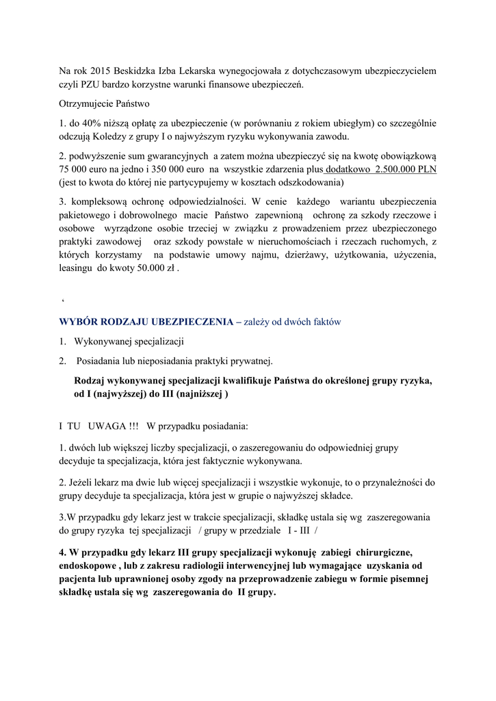 Na rok 2015 Beskidzka Izba Lekarska wynegocjowała z dotychczasowym ubezpieczycielem czyli PZU bardzo korzystne warunki finansowe ubezpieczeń. Otrzymujecie Państwo 1. do 40% niższą opłatę za ubezpieczenie (w porównaniu z rokiem ubiegłym) co szczególnie odczują Koledzy z grupy I o najwyższym ryzyku wykonywania zawodu. 2. podwyższenie sum gwarancyjnych a zatem można ubezpieczyć się na kwotę obowiązkową 75 000 euro na jedno i 350 000 euro na wszystkie zdarzenia plus dodatkowo 2.500.000 PLN (jest to kwota do której nie partycypujemy w kosztach odszkodowania) 3. kompleksową ochronę odpowiedzialności. W cenie każdego wariantu ubezpieczenia pakietowego i dobrowolnego macie Państwo zapewnioną ochronę za szkody rzeczowe i osobowe wyrządzone osobie trzeciej w związku z prowadzeniem przez ubezpieczonego praktyki zawodowej oraz szkody powstałe w nieruchomościach i rzeczach ruchomych, z których korzystamy na podstawie umowy najmu, dzierżawy, użytkowania, użyczenia, leasingu do kwoty 50.000 zł . ‘ WYBÓR RODZAJU UBEZPIECZENIA – zależy od dwóch faktów 1. Wykonywanej specjalizacji 2. Posiadania lub nieposiadania praktyki prywatnej. Rodzaj wykonywanej specjalizacji kwalifikuje Państwa do określonej grupy ryzyka, od I (najwyższej) do III (najniższej ) I TU UWAGA !!! W przypadku posiadania: 1. dwóch lub większej liczby specjalizacji, o zaszeregowaniu do odpowiedniej grupy decyduje ta specjalizacja, która jest faktycznie wykonywana. 2. Jeżeli lekarz ma dwie lub więcej specjalizacji i wszystkie wykonuje, to o przynależności do grupy decyduje ta specjalizacja, która jest w grupie o najwyższej składce. 3.W przypadku gdy lekarz jest w trakcie specjalizacji, składkę ustala się wg zaszeregowania do grupy ryzyka tej specjalizacji / grupy w przedziale I - III / 4. W przypadku gdy lekarz III grupy specjalizacji wykonuję zabiegi chirurgiczne, endoskopowe , lub z zakresu radiologii interwencyjnej lub wymagające uzyskania od pacjenta lub uprawnionej osoby zgody na przeprowadzenie zabiegu w formie pisemnej składkę ustala się wg zaszeregowania do II grupy. Wykaz przynależności do grup ryzyk GRUPA RYZYKA Wykaz Specjalizacji anestezjologia i intensywna terapia (31 02) chirurgia dziecięca (31 06) chirurgia klatki piersiowej (31 07) chirurgia ogólna (31 09) chirurgia szczękowo-twarzowa (31 12) kardiochirurgia (31 27) neurochirurgia (31 41) ortopedia i traumatologia narządu ruchu (31 47) położnictwo i ginekologia ( 31 51) I urologia (31 62) chirurgia naczyniowa (31 08) chirurgia onkologiczna (31 10) chirurgia plastyczna (31 11) ginekologia onkologiczna (31 64) urologia dziecięca (31 68) chirurgia stomatologiczna (32 01) medycyna ratunkowa (31 33) neonatologia (31 40) w trakcie specjalizacji wyszczególnionych powyżej medycyna sportowa (31 36) ortodoncja (32 04) periodontologia (32 05) protetyka stomatologiczna (32 06) II radioterapia onkologiczna (31 55) stomatologia dziecięca (32 07) stomatologia zachowawcza z endodoncją (32 08) w trakcie specjalizacji wyszczególnionych powyżej inna specjalizacja lekarska, nie wymieniona w grupie I i II III w trakcie innej specjalizacji lekarskiej brak specjalizacji RODZAJE UBEZPIECZEŃ I. UBEZPIECZENIA TYLKO DLA PRAKTYKĘ PRYWATNĄ OSÓB POSIADAJĄCYCH UBEZPIECZENIE PAKIETOWE składa się z dwóch elementów ubezpieczenia obowiązkowego i ubezpieczenia dobrowolnego. Lekarz i lekarze dentyści posiadający praktykę prywatną (mają zarejestrowaną działalność w Izbie Lekarskiej) są zobowiązani przez Rozporządzenie Ministra Finansów bezwzględnie wykupić ubezpieczenie obowiązkowe na kwotę 75.000 euro na jedno zdarzenie i 350.000 euro na wszystkie zdarzenia, ale…. rekomendujemy podniesienie sumy gwarancyjnej o wartość ubezpieczenia dobrowolnego w tzw. PAKIECIE UBEZPIECZENIA, gwarantuje on wysoki poziom ochrony ubezpieczeniowej. W cenie każdego wariantu ubezpieczenia pakietowego jest: 1. Obowiązkowe ubezpieczenie odpowiedzialności cywilnej za szkody będące następstwem udzielania świadczeń zdrowotnych zgodnie z rozporządzeniem MF z dnia 22 grudnia 2011r 2. Dobrowolne dodatkowe ubezpieczenie OC a w tym: estetyka, czyli szkody powstałe wskutek stosowanej w celach estetycznych chirurgii plastycznej lub zabiegów kosmetycznych; rozszerzenie o odszkodowania za szkody powstałe poza granicami kraju (np. zagraniczne staże i pierwsza pomoc udzielona obywatelowi polskiemu za granicą) oraz szkody powstałe podczas wyjazdów interwencyjnych z pomocą medyczną dla obywateli RP); ubezpieczenie dobrowolne w pakiecie w ramach prowadzonej praktyki lekarskiej jest nadwyżką ponad limit sumy ubezpieczenia obowiązkowego; odszkodowanie za szkody rzeczowe i osobowe wyrządzone osobie trzeciej w związku z udzielaniem świadczeń zdrowotnych przez lekarza w tym w ramach prowadzonej praktyki zawodowej; odszkodowanie za szkody powstałe w nieruchomościach i rzeczach ruchomych, z których korzystamy na podstawie umowy najmu, dzierżawy, użytkowania, użyczenia, leasingu do kwoty 50.000 zł możliwością podwyższenia kwoty do 500.000zł.; odszkodowanie za szkody powstałe w związku z posiadanym mieniem służącym do prowadzenia praktyki do kwoty 50.000 zł możliwością podwyższenia kwoty do 200.000zł.; 3. Usługa asysty prawnej w zakresie związanym z wykonywaniem zawodu lekarza, polegająca na: - udzielaniu telefonicznie lub udzielaniu w formie elektronicznej konsultacji prawnych, - przesyłaniu w formie elektronicznej wzorów umów i wzorów pism należących do powszechnego obrotu prawnego, - przesyłaniu w formie elektronicznej tekstów obowiązujących lub archiwalnych (obowiązujących na dany dzień) aktów prawnych prawa polskiego, - informacje o obowiązujących procedurach sądowych i kosztach prowadzenia sporów prawnych oraz dochodzenia lub ochrony swoich praw, - przesłanie danych teleadresowych instytucji (sąd, prokuratura, kancelarie prawne). Tabela nr 1 zawiera składki dla praktyk lekars
