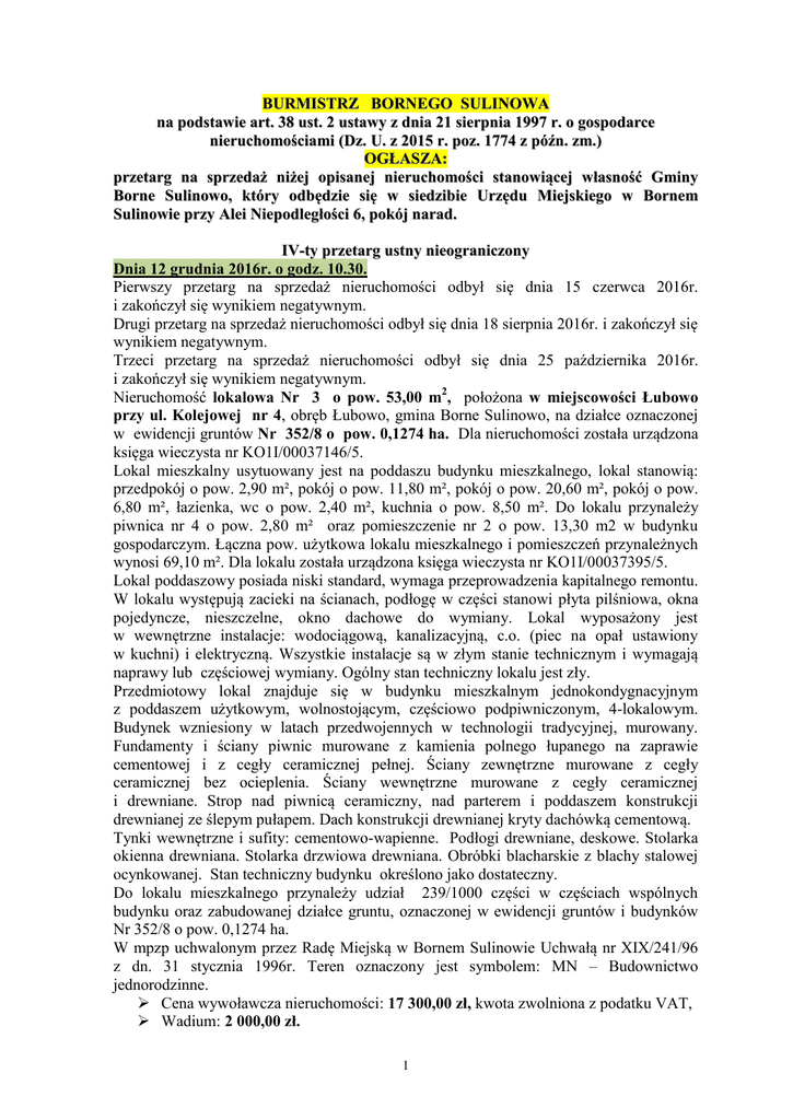 BURMISTRZ BORNEGO SULINOWA na podstawie art. 38 ust. 2 ustawy z dnia 21 sierpnia 1997 r. o gospodarce nieruchomościami (Dz. U. z 2015 r. poz. 1774 z późn. zm.) OGŁASZA: przetarg na sprzedaż niżej opisanej nieruchomości stanowiącej własność Gminy Borne Sulinowo, który odbędzie się w siedzibie Urzędu Miejskiego w Bornem Sulinowie przy Alei Niepodległości 6, pokój narad. IV-ty przetarg ustny nieograniczony Dnia 12 grudnia 2016r. o godz. 10.30. Pierwszy przetarg na sprzedaż nieruchomości odbył się dnia 15 czerwca 2016r. i zakończył się wynikiem negatywnym. Drugi przetarg na sprzedaż nieruchomości odbył się dnia 18 sierpnia 2016r. i zakończył się wynikiem negatywnym. Trzeci przetarg na sprzedaż nieruchomości odbył się dnia 25 października 2016r. i zakończył się wynikiem negatywnym. Nieruchomość lokalowa Nr 3 o pow. 53,00 m2, położona w miejscowości Łubowo przy ul. Kolejowej nr 4, obręb Łubowo, gmina Borne Sulinowo, na działce oznaczonej w ewidencji gruntów Nr 352/8 o pow. 0,1274 ha. Dla nieruchomości została urządzona księga wieczysta nr KO1I/00037146/5. Lokal mieszkalny usytuowany jest na poddaszu budynku mieszkalnego, lokal stanowią: przedpokój o pow. 2,90 m², pokój o pow. 11,80 m², pokój o pow. 20,60 m², pokój o pow. 6,80 m², łazienka, wc o pow. 2,40 m², kuchnia o pow. 8,50 m². Do lokalu przynależy piwnica nr 4 o pow. 2,80 m² oraz pomieszczenie nr 2 o pow. 13,30 m2 w budynku gospodarczym. Łączna pow. użytkowa lokalu mieszkalnego i pomieszczeń przynależnych wynosi 69,10 m². Dla lokalu została urządzona księga wieczysta nr KO1I/00037395/5. Lokal poddaszowy posiada niski standard, wymaga przeprowadzenia kapitalnego remontu. W lokalu występują zacieki na ścianach, podłogę w części stanowi płyta pilśniowa, okna pojedyncze, nieszczelne, okno dachowe do wymiany. Lokal wyposażony jest w wewnętrzne instalacje: wodociągową, kanalizacyjną, c.o. (piec na opał ustawiony w kuchni) i elektryczną. Wszystkie instalacje są w złym stanie technicznym i wymagają naprawy lub częściowej wymiany. Ogólny stan techniczny lokalu jest zły. Przedmiotowy lokal znajduje się w budynku mieszkalnym jednokondygnacyjnym z poddaszem użytkowym, wolnostojącym, częściowo podpiwniczonym, 4-lokalowym. Budynek wzniesiony w latach przedwojennych w technologii tradycyjnej, murowany. Fundamenty i ściany piwnic murowane z kamienia polnego łupanego na zaprawie cementowej i z cegły ceramicznej pełnej. Ściany zewnętrzne murowane z cegły ceramicznej bez ocieplenia. Ściany wewnętrzne murowane z cegły ceramicznej i drewniane. Strop nad piwnicą ceramiczny, nad parterem i poddaszem konstrukcji drewnianej ze ślepym pułapem. Dach konstrukcji drewnianej kryty dachówką cementową. Tynki wewnętrzne i sufity: cementowo-wapienne. Podłogi drewniane, deskowe. Stolarka okienna drewniana. Stolarka drzwiowa drewniana. Obróbki blacharskie z blachy stalowej ocynkowanej. Stan techniczny budynku określono jako dostateczny. Do lokalu mieszkalnego przynależy udział 239/1000 części w częściach wspólnych budynku oraz zabudowanej działce gruntu, oznaczonej w ewidencji gruntów i budynków Nr 352/8 o pow. 0,1274 ha. W mpzp uchwalonym przez Radę Miejską w Bornem Sulinowie Uchwałą nr XIX/241/96 z dn. 31 stycznia 1996r. Teren oznaczony jest symbolem: MN – Budownictwo jednorodzinne. Cena wywoławcza nieruchomości: 17 300,00 zł, kwota zwolniona z podatku VAT, Wadium: 2 000,00 zł. 1 Wyżej wymieniona nieruchomość wolna jest od obciążeń i brak jest zobowiązań, których byłaby przedmiotem. Warunki przetargu: Warunkiem uczestnictwa w przetargu jest wpłata wadium w pieniądzu na rachunek Urzędu Miejskiego: Pomorski Bank Spółdzielczy o/w Bornem Sulinowie nr 76 8581 1056 0300 2004 2000 0015 do dnia 08 grudnia 2016r., aby Komisja Przetargowa mogła trzy dni przed dniem otwarcia przetargu stwierdzić, że środki znajdują się na koncie urzędu. Za datę wniesienia wadium uważa się datę wpływu środków pieniężnych na rachunek Urzędu Miejskiego w Bornem Sulinowie. Osoby fizyczne zobowiązane są do przedstawienia komisji przetargowej dokument stwierdzający ich tożsamość, a osoby prawne pełnomocnictwo uprawniające do wzięcia udziału w przetargu. Przystępujący do przetargu zobowiązani są do przedłożenia Komisji Przetargowej oryginałów dowodów wpłaty wadium (na dowodzie wpłaty winny znajdować się imiona i nazwiska wszystkich osób nabywających nieruchomość oraz określenie numeru działki i obrębu ewidencyjnego). W przypadku niemożności uczestnictwa w przetargu przez osobę ubiegającą się o nabycie nieruchomości, osoba ją reprezentująca winna przedłożyć Komisji Przetargowej stosowne pisemne Pełnomocnictwo do reprezentacji. W razie nie przystąpienia nabywcy do zawarcia aktu notarialnego, wpłacone wadium przepada na rzecz sprzedawcy. Wpłacone wadium zostanie zaliczone nabywcy na poczet ceny osiągniętej w przetargu, pozostałym uczestnikom przetargu wadium zostanie zwrócone. Warunkiem nabycia jest wpłata ceny osiągniętej w przetargu w całości przed zawarciem aktu notarialnego. Nabywca nieruchomości ponosi wszystkie koszty związane z nabyciem nieruchomości. Zastrzega się prawo odwołania przetargu w przypadku zaistnienia uzasadnionych przyczyn. Szczegółowe informacje na temat w/w nieruchomości można uzyskać w siedzibie tut. Urzędu w pokoju 9, 10 bądź tel. 94 37-34-151 lub 94 37-34-145 oraz na stronie internetowej pod adresem: www.bornesulinowo.pl Wywieszono na tablicy ogłoszeń w siedzibie tyt. urzędu oraz opublikowano na stronie internetowej i BIP od dnia 10.11.2016r. 2
