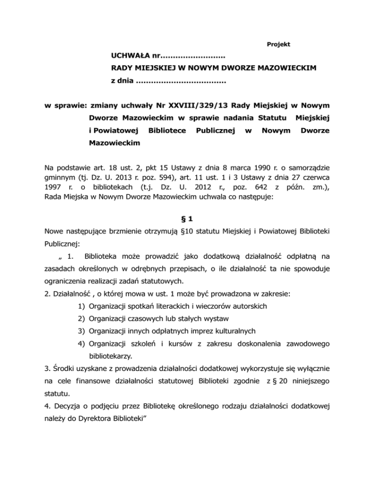 Projekt UCHWAŁA nr…………………….. RADY MIEJSKIEJ W NOWYM DWORZE MAZOWIECKIM z dnia ……………………………… w sprawie: zmiany uchwały Nr XXVIII/329/13 Rady Miejskiej w Nowym Dworze Mazowieckim w sprawie nadania Statutu i Powiatowej Bibliotece Publicznej w Nowym Miejskiej Dworze Mazowieckim Na podstawie art. 18 ust. 2, pkt 15 Ustawy z dnia 8 marca 1990 r. o samorządzie gminnym (tj. Dz. U. 2013 r. poz. 594), art. 11 ust. 1 i 3 Ustawy z dnia 27 czerwca 1997 r. o bibliotekach (t.j. Dz. U. 2012 r., poz. 642 z późn. zm.), Rada Miejska w Nowym Dworze Mazowieckim uchwala co następuje: §1 Nowe następujące brzmienie otrzymują §10 statutu Miejskiej i Powiatowej Biblioteki Publicznej: „ 1. Biblioteka może prowadzić jako dodatkową działalność odpłatną na zasadach określonych w odrębnych przepisach, o ile działalność ta nie spowoduje ograniczenia realizacji zadań statutowych. 2. Działalność , o której mowa w ust. 1 może być prowadzona w zakresie: 1) Organizacji spotkań literackich i wieczorów autorskich 2) Organizacji czasowych lub stałych wystaw 3) Organizacji innych odpłatnych imprez kulturalnych 4) Organizacji szkoleń i kursów z zakresu doskonalenia zawodowego bibliotekarzy. 3. Środki uzyskane z prowadzenia działalności dodatkowej wykorzystuje się wyłącznie na cele finansowe działalności statutowej Biblioteki zgodnie z § 20 niniejszego statutu. 4. Decyzja o podjęciu przez Bibliotekę określonego rodzaju działalności dodatkowej należy do Dyrektora Biblioteki” §2 Wykonanie uchwały powierza się Burmistrzowi Miasta Nowy Dwór Mazowiecki. §3 Uchwała wchodzi w życie po upływie 14 dni od dnia ogłoszenia w Dzienniku Urzędowym Województwa Mazowieckiego. Załącznik STATUT MIEJSKIEJ I POWIATOWEJ BIBLIOTEKI PUBLICZNEJ W NOWYM DWORZE MAZOWIECKIM I. POSTANOWIENIA OGÓLNE §1 Miejska i Powiatowa Biblioteka Publiczna w Nowym Dworze Mazowieckim, zwana dalej „Biblioteką”, działa na podstawie porozumienia zawartego dnia 07 stycznia 2013 roku pomiędzy Zarządem Powiatu Nowodworskiego i Burmistrzem Miasta Nowy Dwór Mazowiecki, w sprawie powierzenia Miejskiej Bibliotece Publicznej w Nowym Dworze Mazowieckim zadań powiatowej biblioteki publicznej. §2 Prawną podstawą funkcjonowania Miejskiej i Powiatowej Biblioteki Publicznej w Nowym Dworze Mazowieckim jest: 1. Ustawa z dnia 27 czerwca 1997 roku o bibliotekach (t.j. Dz. U. 2012, poz. 642 z późn. zm.). 2. Ustawa z dnia 25 października 1991 roku o organizowaniu i prowadzeniu działalności kulturalnej (t.j. Dz. U. 2012, poz. 406). 3. Niniejszy statut. §3 1. 2. Biblioteka jest instytucją kultury działającą w obrębie krajowej sieci bibliotecznej, wpisaną do rejestru instytucji kultury prowadzonego przez Urząd Miasta w Nowym Dworze Mazowieckim. Biblioteka posiada osobowość prawną. §4 Siedzibą Biblioteki jest miasto Nowy Dwór Mazowiecki a terenem jej działalności jest Gmina Miasto Nowy Dwór Mazowiecki oraz powiat nowodworski w województwie mazowieckim. §5 Bezpośredni nadzór nad Biblioteką sprawuje Burmistrz Miasta Nowy Dwór Mazowiecki, a w części dotyczącej realizacji zadań powiatowej biblioteki publicznej – Zarząd Powiatu Nowodworskiego. Nadzór merytoryczny nad Biblioteką sprawuje Wojewódzka Biblioteka Publiczna w Warszawie. §6 Nazwa skrócona Biblioteki brzmi: MiPBP w Nowym Dworze Maz. 1 §7 Biblioteka używa pieczęci podłużnej i okrągłej, zawierających nazwę Biblioteki w pełnym brzmieniu. II. CELE I ZADANIA BIBLIOTEKI §8 Biblioteka jest główną publiczną biblioteką miasta i powiatu. Zapewnia obsługę biblioteczną mieszkańców miasta – siedziby powiatu. Służy rozwijaniu i zaspokajaniu potrzeb czytelniczych i informacyjnych mieszkańców powiatu, upowszechnianiu wiedzy i nauki, rozwojowi kultury, dba o sprawne funkcjonowanie sieci bibliotecznej i systemu informacyjnego na terenie miasta i powiatu. §9 Do podstawowych zadań Biblioteki należy: 1. Gromadzenie i opracowywanie materiałów bibliotecznych służących rozwijaniu czytelnictwa oraz zaspokajaniu potrzeb informacyjnych, edukacyjnych i samokształceniowych. 2. Pełnienie funkcji ośrodka informacji biblioteczno-bibliograficznej, opracowywanie i publikowanie powiatowej bibliografii regionalnej, a także innych materiałów informacyjnych, zwłaszcza dokumentujących dorobek kulturalny, naukowy i gospodarczy regionu. 3. Udostępnianie zbiorów na miejscu, wypożyczanie na zewnątrz, prowadzenie wymiany międzybibliotecznej. 4. Organizowanie czytelnictwa i udostępnianie materiałów bibliotecznych ludziom chorym i niepełnosprawnym. 5. Tworzenie i udostępnianie własnych katalogowych baz danych, bibliograficznych i faktograficznych. 6. Koordynacja gromadzenia i udostępniania piśmiennictwa specjalistycznego na terenie powiatu. 7. Udzielanie pomocy metodycznej, organizowanie szkoleń i doskonalenia zawodowego, wymiana doświadczeń bibliotekarskich oraz sprawowanie nadzoru merytorycznego nad prawidłowym realizowaniem zadań statutowych przez biblioteki publiczne na terenie powiatu. 8. Organizacja form pracy z czytelnikiem służących popularyzowaniu sztuki, nauki oraz upowszechnianiu dorobku kulturalnego miasta i powiatu. 2 9. Współdziałanie z bibliotekami innych sieci, instytucjami i organizacjami w zakresie rozwijania czytelnictwa i zaspokajania potrzeb oświatowych i kulturalnych społeczności miasta i powiatu. § 10 Biblioteka może podejmować inne zadania dla zaspokajania potrzeb mieszkańców powiatu. III. ORGANY BIBLIOTEKI I JEJ ORGANIZACJA § 11 Na czele Biblioteki stoi dyrektor, który kieruje jej działalnością, reprezentuje Bibliotekę na zewnątrz i jest za nią odpowiedzialny. Dyrektora powołuje i odwołuje Burmistrz Miasta po zasięgnięciu opinii związków i stowarzyszeń zawodowych działających w Bibliotece, a także Wojewódzkiej Biblioteki Publicznej w Warszawie. W uzasadnionych przypadkach tworzy się stanowisko zastępcy dyrektora. 