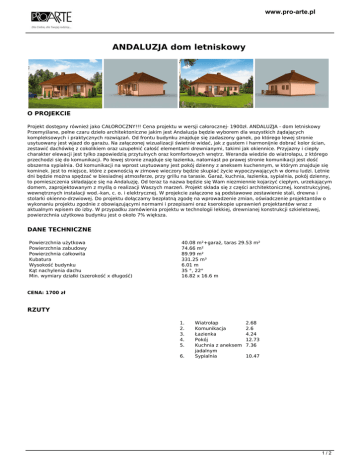www.pro-arte.pl ANDALUZJA dom letniskowy O PROJEKCIE Projekt dostępny również jako CAŁOROCZNY!!! Cena projektu w wersji całorocznej- 1900zł. ANDALUZJA - dom letniskowy Przemyślane, pełne czaru dzieło architektoniczne jakim jest Andaluzja będzie wyborem dla wszystkich żądających kompleksowych i praktycznych rozwiązań. Od frontu budynku znajduje się zadaszony ganek, po którego lewej stronie usytuowany jest wjazd do garażu. Na załączonej wizualizacji świetnie widać, jak z gustem i harmonijnie dobrać kolor ścian, zestawić dachówkę z cokolikiem oraz uzupełnić całość elementami drewnianymi, takimi jak okiennice. Przyjazny i ciepły charakter elewacji jest tylko zapowiedzią przytulnych oraz komfortowych wnętrz. Weranda wiedzie do wiatrołapu, z którego przechodzi się do komunikacji. Po lewej stronie znajduje się łazienka, natomiast po prawej stronie komunikacji jest dość obszerna sypialnia. Od komunikacji na wprost usytuowany jest pokój dzienny z aneksem kuchennym, w którym znajduje się kominek. Jest to miejsce, które z pewnością w zimowe wieczory będzie skupiać życie wypoczywających w domu ludzi. Letnie dni będzie można spędzać w biesiadnej atmosferze, przy grillu na tarasie. Garaż, kuchnia, łazienka, sypialnia, pokój dzienny, to pomieszczenia składające się na Andaluzję. Od teraz ta nazwa będzie się Wam niezmiennie kojarzyć ciepłym, urzekającym domem, zaprojektowanym z myślą o realizacji Waszych marzeń. Projekt składa się z części architektonicznej, konstrukcyjnej, wewnętrznych instalacji wod.-kan, c. o. i elektrycznej. W projekcie załączone są podstawowe zestawienie stali, drewna i stolarki okienno-drzwiowej. Do projektu dołączamy bezpłatną zgodę na wprowadzenie zmian, oświadczenie projektantów o wykonaniu projektu zgodnie z obowiązującymi normami i przepisami oraz kserokopie uprawnień projektantów wraz z aktualnym wpisem do izby. W przypadku zamówienia projektu w technologii lekkiej, drewnianej konstrukcji szkieletowej, powierzchnia użytkowa budynku jest o około 7% większa. DANE TECHNICZNE Powierzchnia użytkowa Powierzchnia zabudowy Powierzchnia całkowita Kubatura Wysokość budynku Kąt nachylenia dachu Min. wymiary działki (szerokość x długość) 40.08 m²+garaż, taras 29.53 m² 74.66 m² 89.99 m² 331.25 m³ 6.01 m 35 °, 22° 16.82 x 16.6 m CENA: 1700 zł RZUTY 1. 2. 3. 4. 5. 6. Wiatrołap Komunikacja Łazienka Pokój Kuchnia z aneksem jadalnym Sypialnia 2.68 2.6 4.24 12.73 7.36 10.47 1/2 www.pro-arte.pl tel. (32) 43-50-829, 502 575 920, [email protected], www.pro-arte.pl 2/2 Powered by TCPDF (www.tcpdf.org)