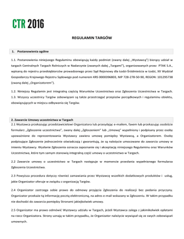 REGULAMIN TARGÓW 1. Postanowienia ogólne 1.1. Postanowienia niniejszego Regulaminu obowiązują każdy podmiot (zwany dalej „Wystawcą”) biorący udział w targach Centralnych Targach Rolniczych w Nadarzynie (zwanych dalej „Targami”), organizowanych przez PTAK S.A., wpisaną do rejestru przedsiębiorców prowadzonego przez Sąd Rejonowy dla Łodzi-Śródmieścia w Łodzi, XX Wydział Gospodarczy Krajowego Rejestru Sądowego pod numerem KRS 0000396803, NIP 728-278-50-90, REGON: 101295738 (zwaną dalej „Organizatorem”). 1.2. Niniejszy Regulamin jest integralną częścią Warunków Uczestnictwa oraz Zgłoszenia Uczestnictwa w Targach. 1.3. Wszyscy uczestnicy Targów zobowiązani są także przestrzegać przepisów porządkowych i regulaminu obiektu, obowiązujących w miejscu odbywania się Targów. 2. Zawarcie Umowy uczestnictwa w Targach 2.1 Wystawca przekazując przedstawicielowi Organizatora lub przesyłając e-mailem, faxem lub przekazując osobiście formularz „Zgłoszenie uczestnictwa”, zwany dalej „Zgłoszeniem” lub „Umową” wypełniony i podpisany przez osoby upoważnione do reprezentowania Wystawcy zawiera umowę pomiędzy Wystawcą, a Organizatorem. Osoby podpisujące Zgłoszenie jednocześnie oświadczają i gwarantują, że są należycie umocowane do zawarcia umowy w imieniu Wystawcy. Wysłanie Zgłoszenia oznacza zapoznanie się i akceptację niniejszego Regulaminu oraz Warunków Uczestnictwa, które tym samym stanowią integralną część umowy o uczestnictwo w Targach. 2.2 Zawarcie umowy o uczestnictwo w Targach następuje w momencie przesłania wypełnionego formularza Zgłoszenia Uczestnictwa. 2.3 Powyższa procedura dotyczy również zamawiania przez Wystawcę wszelkich dodatkowych produktów i usług, jakie Organizator oferuje w związku z organizacją Targów. 2.4 Organizator zastrzega sobie prawo do odmowy przyjęcia Zgłoszenia do realizacji bez podania przyczyny. Organizator przekaże tą informację pocztą elektroniczną, na adres e-mail wskazany w Zgłoszeniu. W takim przypadku nie dochodzi do zawarcia pomiędzy Stronami jakiejkolwiek umowy. 2.5 Organizator ma prawo odmówić Wystawcy udziału w Targach, jeżeli Wystawca zalega z jakimikolwiek opłatami na rzecz Organizatora. Strony uznają w takim przypadku, że Organizator należycie wywiązał się ze swych zobowiązań umownych. 3. Płatności 3. 3.1. Ceny powierzchni wystawienniczej i innych usług związanych z udziałem Wystawcy w Targach wskazane są w dokumencie Warunki Uczestnictwa oraz w załącznikach. Wystawca zobowiązuje się jednocześnie do terminowej zapłaty Organizatorowi wynagrodzenia za te usługi we wskazanej tam wysokości. 3.2. Terminy i sposób płatności wynagrodzenia określa dokument Warunki Uczestnictwa. 3.2. Terminy i sposób płatności wynagrodzenia określa dokument Warunki Uczestnictwa. 4. Najem powierzchni wystawienniczej 4.1. Wystawca dokonuje wyboru powierzchni wystawienniczej w Zgłoszeniu. 4.2. Organizator przydziela powierzchnię wystawienniczą uwzględniając życzenia Wystawcy, w miarę posiadanych możliwości i warunków organizacyjno-technicznych. 4.3. Organizator ma prawo do zmiany lokalizacji powierzchni wystawienniczej, co nie stanowi zmiany umowy o uczestnictwo w Targach i nie rodzi po stronie Wystawcy jakichkolwiek roszczeń względem Organizatora. O zmianie lokalizacji powierzchni wystawienniczej Wystawcy, Organizatorpoinformuje pocztą elektroniczną na adres e-mail wskazany przez Wystawcęw Zgłoszeniu. 4.4. Organizator ma prawo do zmiany numeracji powierzchni wystawienniczej, co nie stanowi zmiany umowy o uczestnictwo w Targach i nie skutkuje powstaniem roszczeń względem Organizatora. O zmianie numeracji powierzchni wystawienniczej Wystawcy, Organizator poinformuje pocztą elektroniczną na adres e-mail wskazany przez Wystawcę w Zgłoszeniu. 5. Podnajemcy 5.1. Wystawca ma prawo do udostępnienia całości lub części powierzchni wystawienniczej innemu podmiotowi (Inny Podmiot) jedynie za uprzednią, pisemną zgodą Organizatora. 5.2. Wystawca ponosi pełną odpowiedzialność za działania i zaniechania Innych Podmiotów, jak za działania i zaniechania własne. 5.3. Na powierzchni, o której mowa w pkt. 5.1 Inny Podmiot może prezentować tylko produkty zgodne z ideą Targów 5.4. W przypadku, naruszenia pkt. 5.3 Organizator zastrzega sobie nałożenie kary umownej w wysokości 25% opłaty wniesionej za udział w Targach. 6. Reklama i Ekspozycja 6.1. Wystawca ma prawo eksponować i reklamować swoje produkty (towary i/lub usługi) wyłącznie na przydzielonej powierzchni wystawienniczej i to pod warunkiem, że jego eksponaty nie zasłonią sąsiednich ekspozycji oraz nie zakłócą normalnego toku pracy innych Wystawców. Wystawca nie ma prawa używania Strona 2 z 6 6.2. 6.3. 6.4. 6.5. urządzeń nagłaśniających, dodatkowego oświetlenia itp., które mogą zakłócić normalny tok pracy innych Wystawców. Umieszczanie reklam Wystawcy poza obrębem wykupionego stoiska za dodatkową opłatą jest możliwe tylko po uzgodnieniu tego z Organizatorem i otrzymaniu od niego pisemnej zgody. Proponowane formy reklamy zawarte są w katalogu informacyjnym Organizatora. W zależności od rodzaju zamówionych produktów reklamowych, Wystawca i Podnajemca zobowiązani są do przekazania Organizatorowi swoich danych kontaktowych, oraz plików elektronicznych z grafiką, logotypami, znakami towarowymi i innymi materiałami podlegającymi publikacji przez Organizatora w związku z organizacją lub promocją Targów, w ciągu dwóch tygodni od zgłoszenia uczestnictwa, pod rygorem zwolnienia Organizatora z obowiązku ich publikacji z zachowaniem prawa do wynagrodzenia za ich publikację. Organizator może odmówić publikacji materiałów przekazanych mu przez Wystawcę w celu ich opublikowania w związku z organizacją Targów, jeżeli uzna, że materiały te naruszają słuszny interes Organizatora lub innych uczestników Targów, prawa o