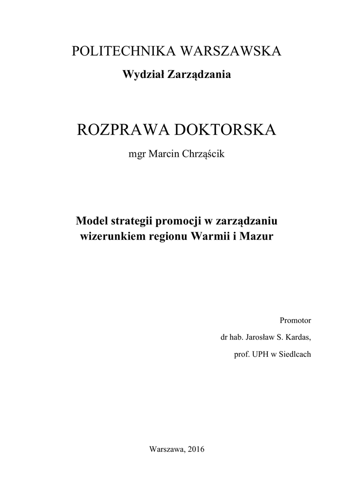 POLITECHNIKA WARSZAWSKA Wydział Zarządzania ROZPRAWA DOKTORSKA mgr Marcin Chrząścik Model strategii promocji w zarządzaniu wizerunkiem regionu Warmii i Mazur Promotor dr hab. Jarosław S. Kardas, prof. UPH w Siedlcach Warszawa, 2016 Streszczenie W pracy doktorskiej sformułowano nowy problem badawczy, podejmując problematykę czynników wzrostu skuteczności stosowanej strategii promocji przez jednostki terytorialne wchodzące w skład regionu Warmii i Mazur. Proces badawczy został ukierunkowany na poszukiwanie strategicznych czynników skuteczności stosowanej strategii promocji w procesie zarządzania wizerunkiem regionu, to znaczy najistotniejszych czynników wewnętrznych i zewnętrznych wpływających na skuteczność strategii promocji regionu, które nie mogą być stworzone lub odtworzone w krótkim okresie. Za główny cel rozprawy przyjęto opracowanie modelu strategii promocji w zarządzaniu wizerunkiem regionu Warmii i Mazur. Osiągnięcie celu głównego i założonych celów szczegółowych stało się możliwe dzięki przeprowadzeniu studiów literaturowych oraz własnych badań empirycznych: jakościowych i ilościowych. Na potrzeby realizowanych założeń badawczych opracowano model konceptualny, będący podstawą modelu badawczego. Model ten przedstawia zależności między potencjalnymi czynnikami strategicznymi a skutecznością stosowanej strategii promocji wdrażanej w regionie Warmii i Mazur, przy uwzględnieniu istnienia zmiennych o znaczeniu regulującym założone relacje przyczynowo-skutkowe. W kontekście określonego problemu badawczego oraz przyjętych celów, postawiono następujące hipotezy badawcze: H1. Możliwe jest określenie relacji przyczynowo-skutkowych i siły związku między strategicznymi determinantami a skutecznością strategii promocji, przy wykorzystaniu modelowania równań strukturalnych (SEM – Structural EquationModeling). H2. Stosowane instrumenty promocji wykorzystywane w strategii mogą znacznie wpływać na lojalność, satysfakcję i zaufanie adresatów działań wizerunkowych w stosunku do regionu. Przeprowadzone badania i analizy statystyczne pozwoliły na weryfikację hipotez i pokazały, że przyjęta w pracy metoda badawcza stanowi użyteczne narzędzie w badaniach procesów zarządzania wizerunkiem regionu przy wykorzystaniu opracowanej strategii promocji. Novum rozprawy stanowi sformułowany, w wyniku własnych badań empirycznych, autorski model strategii promocji w zarządzaniu wizerunkiem regionu, uwzględniający także zmienne o znaczeniu regulującym omawiane zależności. Rozprawa, mająca charakter teoretyczno-empiryczny, składa się z sześciu rozdziałów, podzielonych umownie na dwie części. Część pierwsza, teoretyczna, obejmująca cztery kolejne rozdziały, powstała w wyniku szerokich studiów literaturowych, na podstawie których opracowano model konceptualny i sformułowano hipotezy badawcze. Druga część, zawarta w rozdziałach piątym i szóstym, poświęcona jest badawczej i wyników własnych badań empirycznych. prezentacji koncepcji W podsumowaniu rozprawy dokonano syntezy rezultatów przeprowadzonych własnych badań empirycznych, przedstawiono rekomendacje dla teorii i praktyki zarządzania oraz praktyki gospodarczej. Wskazano także kierunki dalszych badań naukowych, inspirowane pracą doktorską. Słowa kluczowe: marketing terytorialny, strategia promocji, wizerunek regionu, strategiczne czynniki skuteczności promocji, analiza czynnikowa, modelowanie równań strukturalnych Abstract In this doctoral dissertation a new research problem was formulated. It takes the issue of growth factors effectiveness of promotion strategies used by the territorial units included in the Warmia and Mazury region. In this doctoral dissertation a new research problem was formulated. It concerns the growth of effectiveness in promotion strategies used by the territorial units of the Warmia and Mazury region. The research focuses on seeking and analysing strategic factors of effectiveness in managing the image of the region, addressing the most important factors of promotion strategies which cannot be created or recreated in a short period of time. The main purpose of the dissertation was to create the model promotion strategy in managing the image of Warmia and Mazury. In order to achieve the main purpose as well as minor objectives, empirical qualitative and quantitative research was conducted and the literature studies of the subject matter was applied. In accordance to the assumptions of implemented research a conceptual model was adopted, which created the basis for the research model. This model presents the relationship between potential strategic factors and the effectiveness of applied promotion strategies implemented in the Warmia and Mazury region, taking into account the variables that regulate the assumed cause-effect relationships. According to the defined research problem and the adopted objectives, the following research hypotheses were formulated: H1: It is possible to determine the cause-effect relationships and the strength of the relationship between the strategic factors and the effectiveness of the promotion strategy, using structural equation modeling (SEM). H2: Promotion instruments applied in the strategy may significantly affect the loyalty, satisfaction and trust of the recipients of image operations in the region. The conducted research and statistical analysis allowed for the verification of the hypotheses and showed that the research method adopted in the dissertation constitutes a useful tool for the study of the processes in region’s image management by means of developed promotion strategy. The novelty of this dissertation lies in the creation of new and original model of promotion strategy in managing the image of the region, which was based on results of own empirical research and which takes into account the variables regulating the discussed relationships. The dis