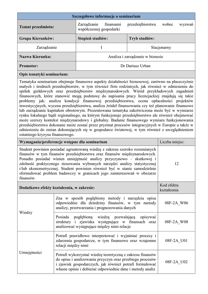 Szczegółowe informacje o seminarium Temat przedmiotu: Zarządzanie finansami współczesnej gospodarki Grupa Kierunków: Stopień studiów: Zarządzanie przedsiębiorstwa wobec wyzwań Tryb studiów: I Stacjonarny Analiza i zarządzanie w biznesie Nazwa Kierunku: Dr Dariusz Urban Promotor: Opis tematyki seminarium: Tematyka seminarium obejmuje finansowe aspekty działalności biznesowej, zarówno na płaszczyźnie małych i średnich przedsiębiorstw, w tym również firm rodzinnych, jak również w odniesieniu do spółek giełdowych oraz przedsiębiorstw międzynarodowych. Wśród przykładowych zagadnień finansowych, które stanowić mogą podstawę do napisania pracy licencjackiej znajdują się takie problemy jak: analiza kondycji finansowej przedsiębiorstwa, ocena opłacalności projektów inwestycyjnych, wycena przedsiębiorstwa, analiza źródeł finansowania czy też planowanie finansowe lub zarządzanie kapitałem obrotowym. Prezentowana tematyka zakotwiczona może być w wymiarze rynku lokalnego bądź regionalnego, na którym funkcjonuje przedsiębiorstwo ale również obejmować może szerszy kontekst międzynarodowy i globalny. Badanie finansowego wymiaru funkcjonowania przedsiębiorstwa dokonane może zostać przez pryzmat procesów integracyjnych w Europie a także w odniesieniu do zmian dokonujących się w gospodarce światowej, w tym również z uwzględnieniem ostatniego kryzysu finansowego. Wymagania/preferencje wstępne dla seminarium Student powinien posiadać ugruntowaną wiedzę z zakresu szeroko rozumianych finansów w tym finansów przedsiębiorstwa oraz finansów międzynarodowych. Ponadto posiadać winien umiejętność analizy przyczynowo – skutkowej i zdolność praktycznego stosowania wybranych narzędzi analizy statystycznej i/lub ekonometrycznej. Student powinien również być w stanie samodzielnie sformułować problem badawczy w granicach jego zainteresowań w obszarze finansów. Dodatkowe efekty kształcenia, w zakresie: Liczba miejsc: 12 Kod efektu kształcenia Zna w sposób pogłębiony metody i narzędzia opisu odpowiednie dla dziedziny finansów, w tym metody analizy, przetwarzania i prognozowania danych 08F-2A_W06 Posiada pogłębioną wiedzą pozwalającą opisywać struktury i zjawiska występujące w finansach oraz analizować występujące między nimi relacje 08F-2A_W08 Potrafi prawidłowo interpretować i wyjaśniać procesy i zdarzenia gospodarcze, w tym finansowe oraz wzajemne relacji między nimi 08F-2A_U01 Potrafi wykorzystać wiedzę teoretyczną z zakresu finansów do opisu i analizowania przyczyn oraz przebiegu procesów i zjawisk gospodarczych, jak również potrafi formułować własne opinie i dobierać odpowiednie dane i metody analiz 08F-2A_U02 Wiedzy Umiejętności Kompetencji społecznych Rozumie potrzebę uczenia się przez całe życie, potrafi inspirować i organizować proces uczenia się innych osób 08F-2A_K01 Potrafi odpowiednio określić priorytety służące realizacji określonego przez siebie lub innych zadania 08F-2A_K03 Potrafi samodzielnie i krytycznie uzupełniać wiedzę i umiejętności z zakresu finansów, rozszerzone o wymiar interdyscyplinarny 08F-2A_K06 Szczegółowy opis przedmiotu: Treści programowe (tematy/problemy zajęć): L.g. dydaktycznych 1. Omówienie i analiza struktury pracy licencjackiej, zapoznanie z wymogami edytorskimi oraz przedstawienie zasad weryfikacji skali zapożyczeń w programie Plagiat. Ukazanie elementów pracy licencjackiej podlegających ocenie recenzenta w oparciu o aktualny szablon recenzji. 2 2. Prezentacja sposobu prowadzenia dialogu z literaturą w części teoretycznej pracy. Dyskusja na temat potencjalnych tematów prac przez pryzmat problemu badawczego i sposobu jego rozwiązania. Przestawienie wybranych baz danych oraz wyszukiwarek opracowań naukowych. 2 3. Indywidualne konsultacje na temat wyboru tematu pracy. 4 4. Indywidualne konsultacje w obszarze planu pracy. 8 5. Analiza i omawianie kolejnych rozdziałów pracy z wykorzystaniem tutoringu. 43 6. Zapoznanie z wymogami formalnymi związanymi ze złożeniem pracy oraz z przebiegiem egzaminu dyplomowego. 1 Dodatkowa literatura: Obowiązkowa: • Babbie E., Podstawy badań społecznych, Wydawnictwo Naukowe PWN, Warszawa 2013. • Kozłowski R., Praktyczny sposób pisania prac dyplomowych, Oficyna Wolters Kluwer Business, 2009. Zalecana: • Sińska B., Zasady pisania prac dyplomowych, Oficyna Wydawnicza Warszawskiego Uniwersytet Medycznego, Warszawa 2010. • Cempel C., Nowoczesne zagadnienia metodologii i filozofii badań : wybrane zagadnienia dla studiów magisterskich, podyplomowych i doktoranckich: poradnik, Instytut Technologii Eksploatacji, Poznań 2003. • Szkutnik Z., Metodyka pisania pracy dyplomowej, Wydawnictwo Poznańskie, Poznań 2005 • Urban S., Ładoński W., Jak napisać dobrą pracę magisterską, Akademia Ekonomiczna im. Oskara Langego, Wrocław 2006. Sposób obliczania oceny semestralnej / końcowej z przedmiotu (algorytm): Warunkiem zaliczenia semestru 5 jest przedstawienie w terminie: tematu pracy (ocena 3) oraz planu pracy (ocena 4) i pierwszego rozdziału pracy (ocena 5).Warunkiem zaliczenia semestru 6 jest w złożenie do dziekanatu całości pracy. Ocena końcowa z seminarium będzie tożsama z oceną pracy wystawioną przez promotora.