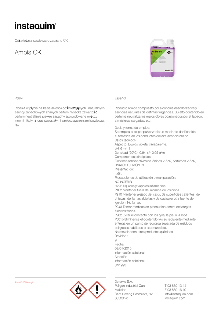 Odś wieżaczpowietrzaozapachuCK AmbisCK Polski Español Produktwpłynienabaziealkoholiodś wieżającychinaturalnych esencjizapachowychznanychperfum.Wysokazawartoś ć perfumneutralizujeprzykrezapachyspowodowanemiędzy innyminikotynąorazpozostałymizanieczyszczeniamipowietrza, itp. Productolíquidocompuestoporalcoholesdesodorizadosy esenciasnaturalesdedistintasfragancias.Sualtocontenidoen perfumeneutralizalosmalosoloresocasionadosporeltabaco, atmósferascargadas,etc. Atención!/Warning! Dosisyformadeempleo: Seempleapuroporpulverizaciónomediantedosificación automáticaenlosconductosdelaireacondicionado. Datostécnicos: Aspecto:Líquidovioletatransparente. pH:6+/-1 Densidad(20ºC):0.94+/-0.02g/ml Componentesprincipales: Contienetensioactivosnoiónicos<5%,perfumes<5%, LINALOOL,LIMONENE. Presentación: 4x5l. Precaucionesdeutilizaciónomanipulación: NOINGERIR H226Líquidosyvaporesinflamables. P102Mantenerfueradelalcancedelosniños. P210Manteneralejadodelcalor,desuperficiescalientes,de chispas,dellamasabiertasydecualquierotrafuentede ignición.Nofumar. P243Tomarmedidasdeprecaucióncontradescargas electrostáticas. P262Evitarelcontactoconlosojos,lapielolaropa. P501bElimínenseelcontenidoy/osurecipientemediante entregaenunpuntoderecogidaseparadaderesiduos peligrososhabilitadoensumunicipio. Nomezclarconotrosproductosquímicos. Revisión:: 9 Fecha:: 08/01/2015 Informaciónadicional: Atención Informaciónadicional: UN1993 DetervicS.A. PolígonIndustrialCan Malloles SantLlorençDesmunts,32 08500Vic T938891344 F938891640 [email protected] instaquim.com Barcelona