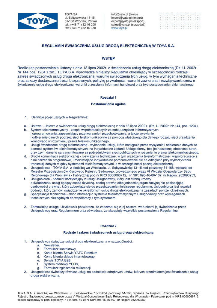 REGULAMIN ŚWIADCZENIA USŁUG DROGĄ ELEKTRONICZNĄ W TOYA S.A. WSTĘP Realizując postanowienia Ustawy z dnia 18 lipca 2002r. o świadczeniu usług drogą elektroniczną (Dz. U. 2002r. Nr 144 poz. 1204 z zm.) TOYA S.A. wprowadza niniejszy Regulamin określający w szczególności rodzaje i zakres świadczonych usług droga elektroniczną, warunki świadczenia tych usług, w tym wymagania techniczne oraz zakazy dostarczania treści bezprawnych, politykę prywatności, warunki zawierania i rozwiązywania umów o świadczenie usług droga elektroniczną, warunki przesyłania informacji handlowej oraz tryb postępowania reklamacyjnego. Rozdział 1 Postanowienia ogólne 1. Definicje pojęć użytych w Regulaminie: a. b. Ustawa - Ustawa o świadczeniu usług drogą elektroniczną z dnia 18 lipca 2002 r. (Dz. U. 2002r. Nr 144, poz. 1204), System teleinformatyczny - zespół współpracujących ze sobą urządzeń informatycznych i oprogramowania, zapewniający przetwarzanie i przechowywanie, a także wysyłanie i odbieranie danych poprzez sieci telekomunikacyjne za pomocą właściwego dla danego rodzaju sieci urządzenia końcowego w rozumieniu prawa telekomunikacyjnego, Usługi świadczone drogą elektroniczną - wykonanie usługi, które następuje przez wysyłanie i odbieranie danych za pomocą systemów teleinformatycznych, na indywidualne żądanie Usługobiorcy, bez jednoczesnej obecności stron, przy czym dane te są transmitowane za pośrednictwem sieci publicznych w rozumieniu prawa telekomunikacyjnego, Środki komunikacji elektronicznej - rozwiązania techniczne, w tym urządzenia teleinformatyczne i współpracujące z nimi narzędzia programowe, umożliwiające indywidualne porozumiewanie się na odległość przy wykorzystaniu transmisji danych między systemami teleinformatycznymi, a w szczególności pocztę elektroniczną, Usługodawca - TOYA S.A. z siedzibą we Wrocławiu, ul. Sołtysowickiej 13-15,kod pocztowy 51-168, wpisana do Rejestru Przedsiębiorców Krajowego Rejestru Sądowego, prowadzonego przez VI Wydział Gospodarczy Sądu Rejonowego dla Wrocławia - Fabrycznej pod nr KRS 0000066712, nr NIP: 895-16-86-107; nr Regon: 932093253, Usługobiorca - podmiot korzystający z usług Usługodawcy, który jest stroną umowy o świadczeniu usług będący osobą fizyczną, osobą prawną albo jednostką organizacyjną nie posiadającą osobowości prawnej, który zobowiąże się do przestrzegania niniejszego regulaminu. Usługobiorcą jest również podmiot, który zamówi świadczenie określonych usług drogą elektroniczną na zasadach poniżej określonych. Specyfikacja techniczna - zbiór informacji o systemie teleinformatycznym Usługodawcy oraz wymaganiach technicznych niezbędnych do współpracy z tym systemem. c. d. e. f. g. 2. Zamawiając usługę, Użytkownik potwierdza, że zapoznał się z jej opisem, warunkami jej świadczenia przez Usługodawcę oraz Regulaminem oraz oświadcza, że akceptuje wszystkie postanowienia Regulaminu. Rozdział 2 Rodzaje i zakres świadczonych usług drogą elektroniczną 1. 2. Usługodawca świadczy usługi drogą elektroniczną, a w szczególności: a. Newsletter, b. Formularz kontaktowy, c. Konto klienta Serwis YATO Premium d. Konto klienta sklepu internetowego, e. Serwis TOYA B2B, f. System ofertowy YEOS, g. Formularz zgłoszenia reklamacji Usługodawca świadczy również usługi na podstawie odrębnych umów, których przedmiotem jest świadczenie usług drogą elektroniczną. TOYA S.A. z siedzibą we Wrocławiu, ul. Sołtysowickiej 13-15,kod pocztowy 51-168, wpisana do Rejestru Przedsiębiorców Krajowego Rejestru Sądowego, prowadzonego przez VI Wydział Gospodarczy Sądu Rejonowego dla Wrocławia - Fabrycznej pod nr KRS 0000066712, kapitał zakładowy w pełni opłacony: 7 814 694, 40 zł; nr NIP: 895-16-86-107; nr Regon: 932093253. Rozdział 3 Warunki świadczenia usług drogą elektroniczną. 1. Usługodawca świadczy usługi na rzecz Usługobiorcy w zakresie i na warunkach określonych w niniejszym regulaminie lub indywidualnej ofercie, jeśli taka została złożona i przyjęta przez Usługobiorcę. 2. 3. Usługobiorca zobowiązuje się do przestrzegania niniejszego regulaminu. Usługobiorca zobowiązany jest do przestrzegania zakazu nadużywania środków komunikacji elektronicznej oraz nie dostarczania przez lub do systemów teleinformatycznych Usługodawcy następujących treści: a. Powodujących zachwianie pracy lub przeciążenie systemów teleinformatycznych Usługodawcy lub innych podmiotów biorących bezpośredni lub pośredni udział w świadczeniu usług drogą elektroniczną, b. Naruszają dobra osób trzecich, ogólnie przyjęte normy społeczne lub są niezgodne z powszechnie obowiązującymi przepisami prawa. Użytkownik ma prawo oczekiwać dostępu do pełnej funkcjonalności Pakietu w każdym czasie, za wyjątkiem czasu potrzebnego na modernizację, aktualizację, konserwację lub innych zdarzeń losowych. Usługodawca zobowiązuje się do przeprowadzania prac serwisowych w porach jak najmniej uciążliwych dla Użytkowników. O każdej planowanej przerwie w dostępie do świadczonych usług Usługodawca poinformuje Użytkownika z odpowiednim wyprzedzeniem za pośrednictwem strony www. Usługodawca zapewnia Usługobiorcom tajemnicę komunikacji zwaną "tajemnicą telekomunikacyjną", która obejmuje informacje przekazywane w publicznej sieci Internet, dane dotyczące i wprowadzone przez Usługobiorców tylko w obrębie systemu teleinformatycznego Usługodawcy i tylko w przypadku, w którym informacje objęte "tajemnicą telekomunikacyjną" nie są jawne z zasady lub ich ujawnienie nie jest niezbędne dla prawidłowego świadczenia usługi, której dotyczą. Informacje objęte "tajemnicą telekomunikacyjną" mogą zostać ujawnione jedynie w przypadkach określonych umową lub w przepisach prawa. Informacje objęte "tajemnicą telekomunikacyjną" mogą być przetwarzane przez Usługodawcę tylko wówczas,