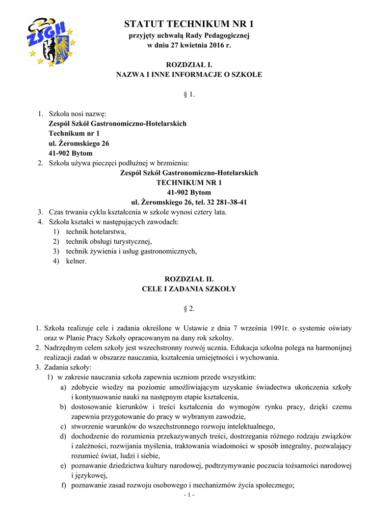 STATUT TECHNIKUM NR 1 przyjęty uchwałą Rady Pedagogicznej w dniu 27 kwietnia 2016 r. ROZDZIAŁ I. NAZWA I INNE INFORMACJE O SZKOLE § 1. 1. Szkoła nosi nazwę: Zespół Szkół Gastronomiczno-Hotelarskich Technikum nr 1 ul. Żeromskiego 26 41-902 Bytom 2. Szkoła używa pieczęci podłużnej w brzmieniu: Zespół Szkół Gastronomiczno-Hotelarskich TECHNIKUM NR 1 41-902 Bytom ul. Żeromskiego 26, tel. 32 281-38-41 3. Czas trwania cyklu kształcenia w szkole wynosi cztery lata. 4. Szkoła kształci w następujących zawodach: 1) technik hotelarstwa, 2) technik obsługi turystycznej, 3) technik żywienia i usług gastronomicznych, 4) kelner. ROZDZIAŁ II. CELE I ZADANIA SZKOŁY § 2. 1. Szkoła realizuje cele i zadania określone w Ustawie z dnia 7 września 1991r. o systemie oświaty oraz w Planie Pracy Szkoły opracowanym na dany rok szkolny. 2. Nadrzędnym celem szkoły jest wszechstronny rozwój ucznia. Edukacja szkolna polega na harmonijnej realizacji zadań w obszarze nauczania, kształcenia umiejętności i wychowania. 3. Zadania szkoły: 1) w zakresie nauczania szkoła zapewnia uczniom przede wszystkim: a) zdobycie wiedzy na poziomie umożliwiającym uzyskanie świadectwa ukończenia szkoły i kontynuowanie nauki na następnym etapie kształcenia, b) dostosowanie kierunków i treści kształcenia do wymogów rynku pracy, dzięki czemu zapewnia przygotowanie do pracy w wybranym zawodzie, c) stworzenie warunków do wszechstronnego rozwoju intelektualnego, d) dochodzenie do rozumienia przekazywanych treści, dostrzegania różnego rodzaju związków i zależności, rozwijania myślenia, traktowania wiadomości w sposób integralny, pozwalający rozumieć świat, ludzi i siebie, e) poznawanie dziedzictwa kultury narodowej, podtrzymywanie poczucia tożsamości narodowej i językowej, f) poznawanie zasad rozwoju osobowego i mechanizmów życia społecznego; -1- 2) w zakresie umiejętności szkoła uczy: a) planowania, organizowania, oceniania procesu własnego uczenia się, b) skutecznego porozumiewania się, którego podstawą jest dialog, konstruktywna wymiana myśli, c) efektywnego współdziałania w zespole, funkcjonującym na zasadach współpracy, d) kreatywnej postawy wobec problemów oraz ich rozwiązywania w twórczy sposób, e) korzystania z informacji z różnych źródeł, f) umiejętności wykorzystywania wiedzy w praktycznym działaniu; 3) szkoła w swej pracy wychowawczej zmierza do tego, aby uczniowie: a) znajdowali w szkole warunki do wszechstronnego rozwoju osobowości, b) stawali się samodzielni w dążeniu do dobra w jego wymiarze indywidualnym i społecznym, godząc umiejętnie dobro własne z dobrem innych, odpowiedzialność za siebie i za innych, wolność własną z wolnością innych, c) mieli świadomość użyteczności edukacji szkolnej, d) dążyli poprzez rzetelną pracę do osiągnięcia wartości ważnych w otaczającym ich świecie, e) uczyli się szacunku dla dobra wspólnego jako podstawy życia społecznego oraz przygotowywali się do życia w rodzinie, w społeczności lokalnej i w państwie w duchu przekazu dziedzictwa kulturowego regionu i kształtowania postaw patriotycznych, f) przygotowywali się do rozpoznawania i hierarchizowania wartości moralnych, umożliwiających dokonywanie właściwych wyborów, g) kształtowali w sobie postawę dialogu, tolerancji, otwartości na racje innych. § 3. 1. Nauczyciele sprawują opiekę nad uczniami w czasie zajęć edukacyjnych obowiązkowych i nadobowiązkowych, zajęć pozalekcyjnych oraz na wszystkich przerwach międzylekcyjnych. 2. Przy wyjściu z uczniami poza teren szkoły obowiązują odrębne przepisy dotyczące sprawowania opieki. 3. Nauczyciele i wychowawcy zobowiązani są również do podejmowania innych działań zleconych przez Dyrektora w ramach indywidualnego zakresu czynności oraz do doraźnego podejmowania działań z własnej inicjatywy, jeżeli wymaga tego sprawowanie opieki i bezpieczeństwo uczniów. 4. W celu zapewnienia bezpiecznych warunków nauki, wychowania i opieki budynki szkolne przy ul. Żeromskiego 26 i ul. Chrobrego 13 oraz teren szkolny objęto systemem monitoringu wizyjnego (kamery CCTV). 5. Nauczyciele, wychowawcy i pedagog podczas posiedzeń Rady Pedagogicznej analizują postępy uczniów w nauce w celu wyeliminowania trudności w osiąganiu dobrych wyników. W przypadku występowania niepowodzeń szkolnych uczniowi organizuje się pomoc. 6. Uczniom, którym z przyczyn rozwojowych, rodzinnych lub losowych potrzebna jest pomoc i wsparcie, w tym również pomoc materialna, szkoła - w ramach posiadanych na ten cel środków - zapewnia taką pomoc przez: 1) działalność pedagoga i psychologa szkolnego, 2) wywiad środowiskowy, 3) doraźną pomoc materialną, 4) stypendia lub zapomogi losowe. -2- § 4. 1. Szkoła umożliwia uczniom podtrzymywanie poczucia tożsamości narodowej, etnicznej, językowej, światopoglądowej i religijnej w procesie dydaktycznym między innymi przez organizowanie lekcji religii lub etyki. 2. Szkoła sprzyja rozwijaniu zainteresowań uczniów przez organizowanie zajęć dodatkowych, kół zainteresowań, różnych zajęć pozalekcyjnych i form aktywności. 3. Dodatkowe zajęcia edukacyjne Dyrektor może wprowadzić do szkolnego planu nauczania po zasięgnięciu opinii Rady Pedagogicznej i Rady Rodziców. 4. W szkole funkcjonują przedmiotowe, sportowe i inne koła zainteresowań, stosownie do posiadanych środków finansowych oraz zainteresowań młodzieży. 5. Nauczyciele organizują dla młodzieży różne formy aktywności na terenie szkoły i poza nią, między innymi: 1) konkursy i turnieje, 2) imprezy szkolne, 3) imprezy sportowe, 4) wyjścia do kina, teatru, muzeum itd., 5) wyjścia do instytucji i urzędów w mieście i poza nim, 6) wyjścia do hoteli i zakładów gastronomicznych. 6. Wszystkie wyżej wymienione działania podejmowane przez nauczycieli muszą być zgłaszane Dyrektorowi i muszą odbywać się na zasadach określon