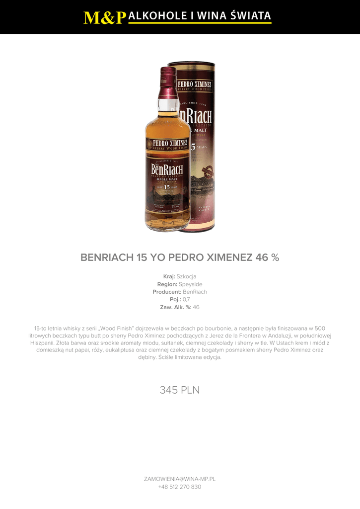 BENRIACH 15 YO PEDRO XIMENEZ 46 % Kraj: Szkocja Region: Speyside Producent: BenRiach Poj.: 0,7 Zaw. Alk. %: 46 15-to letnia whisky z serii „Wood Finish” dojrzewała w beczkach po bourbonie, a następnie była finiszowana w 500 litrowych beczkach typu butt po sherry Pedro Ximinez pochodzących z Jerez de la Frontera w Andaluzji, w południowej Hiszpanii. Złota barwa oraz słodkie aromaty miodu, sułtanek, ciemnej czekolady i sherry w tle. W Ustach krem i miód z domieszką nut papai, róży, eukaliptusa oraz ciemnej czekolady z bogatym posmakiem sherry Pedro Ximinez oraz dębiny. Ściśle limitowana edycja. 345 PLN [email protected] +48 512 270 830
