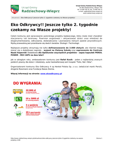 Urząd Gminy Radziechowy-Wieprz 34-381 Radziechowy, Wieprz 700 tel. 33 867 66 10, fax. 33 867 66 13 e-mail: [email protected] www.radziechowy-wieprz.pl Aktualności › Eko Odkrywcy!! Jeszcze tylko 2. tygodnie czekamy na Wasze projekty! Eko Odkrywcy!! Jeszcze tylko 2. tygodnie czekamy na Wasze projekty! Celem konkursu jest opracowanie autorskiego projektu badawczego, który może mieć charakter stacjonarny lub terenowy. Powinien angażować i aktywizować dzieci oraz młodzież do eksperymentowania, odkrywania, doświadczania i poznawania różnych zjawisk przyrodniczych. Myślą przewodnią jest przenikanie się dwóch światów: Ekologii i Technologii. Najlepsze projekty otrzymają nie tylko dofinansowanie do 3.000 złotych, ale również mogą starać się o dodatkowe nagrody - wyjazd na Zieloną Szkołę oraz zaproszenie do Centrum Nauki Kopernik! Dodatkowo dla Opiekunów zwycięskich projektów - zapas kapsułek PERSIL POWER - MIX CAPS na dwa lata!! Jak w ubiegłym roku, ambasadorem konkursu jest Rafał Kosik - jeden z najbardziej znanych polskich pisarzy dla dzieci i młodzieży, autor bestsellerowej serii książek "Felix, Net i Nika". Organizatorami konkursu Eko Odkrywcy 4 są Henkel Polska Sp. z o.o. (właściciel marki Persil), drogerie Rossmann oraz Fundacja Nasza Ziemia. Więcej informacji na stronie: www.ekoodkrywcy.pl http://www.radziechowy-wieprz.pl/aktualnosci/eko-odkrywcy-jeszcze-tylko-2-tygodnie-czekamy-na-waszeprojekty,1199 Strona 1 Urząd Gminy Radziechowy-Wieprz 34-381 Radziechowy, Wieprz 700 tel. 33 867 66 10, fax. 33 867 66 13 e-mail: [email protected] www.radziechowy-wieprz.pl Aktualności › Eko Odkrywcy!! Jeszcze tylko 2. tygodnie czekamy na Wasze projekty! http://www.radziechowy-wieprz.pl/aktualnosci/eko-odkrywcy-jeszcze-tylko-2-tygodnie-czekamy-na-waszeprojekty,1199 Strona 2