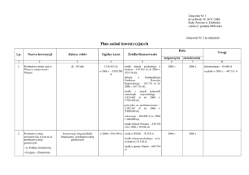Załącznik Nr 2 do uchwały Nr 26/V/ 2006 Rady Powiatu w Kłobucku z dnia 21 grudnia 2006 roku Załącznik Nr 2 do objaśnień Plan zadań inwestycyjnych Data Lp. Nazwa inwestycji Zakres robót Ogólny koszt Źródła finansowania 1 2 3 4 5 dł. 195 mb 5.541.051 zł, rozpoczęcia 1. Przebudowa mostu nad rz. Wartą w miejscowości Wąsosz środki własne pochodzące z kredytu – 185.136 zł (w 2006 r. w 2006 r. - 5.029.280 185.136 zł), zł dotacja z Europejskiego Funduszu Rozwoju Regionalnego – 267.753 zł (w 2006 r. 267.753 zł), Uwagi zakończenia 6 7 2005 r. 2006 r. pożyczka na prefinansowanie – 2.302.367 zł (w 2006 r. 2.080.980 zł), subwencja – 680.000 zł (w 2006 r. 680.000 zł), środki własne Powiatu - 270.330 zł (w 2006 r. 29.946 zł) Przebudowa dróg powiatowych, w tym m.in. przebudowa dróg gruntowych - m. Podłęże Szlacheckie, - Krzepice - Zbrojewsko konserwacja dróg (nakładki bitumiczne), przebudowa dróg gruntowych w 2006 r. 956.399 zł środki z FOGR – 75.225 zł, środki własne pochodzące m.in. z kredytu 211.410 zł, środki z gminy Popów – 669.764 zł dokumentacja – 14.640 zł wydatki w 2005 r. – 497.131 zł środki z innych jednostek samorządu terytorialnego – 1.835.465 zł (w 2006 r. 1.785.465 zł), 2. 8 2006 r. 2006 r. 1 3. 2 Zakup gruntu pod drogę powiatową 3 4 zakup gruntów od właścicieli 45.017 zł 5 dochody własne powiatu 6 7 2003 r. 2007 r. w 2006 r. -9.100 zł 8 w 2003 r. wypłacono za wykup gruntów – 6.315 zł w 2004r. wypłacono za wykup gruntów 19.322 zł Zawady-Władysławów w 2005r. wypłacono za zakup gruntów 5.005 zł 4. Zakup 2 zestawów komputerowych dla biura PZD w Kłobucku zakup zestawów komputerowych 7.000 zł dochody własne powiatu 2006 r. 2006 r. 5. Zakup sprzętu komputerowego dla St. Pow. sprzęt komputerowy 4.280 zł dotacja z FOGR 2006 r. 2006 r. 6. Dofinansowanie przebudowy parkingu przy budynku Komendy Powiatowej Policji przebudowa parkingu (m.in. wyłożenie kostką brukową) 10.000 zł dochody własne Powiatu 7. Zakup sprzętu medycznego 2006 r. 2006 r. 8. Termomodernizacja budynków szpitali rejonowych 2005 r. 2007 r. 9. Razem: doposażenie szpitali i gabinetów medycznych wykonanie projektu 1.000.000 zł środki własne pochodzące z kredytu – 1.000.000 zł ogólny koszt środki własne pochodzące z inwestycji będzie kredytu – 102.000 zł znany po wykonaniu kosztorysu w 2006 r. 102.000 zł w 2005 r. wydatkowano 14.640 zł na audyt energetyczny szpitali 7.665.747 zł w tym: 7.118.059 zł – w 2006 r. 2