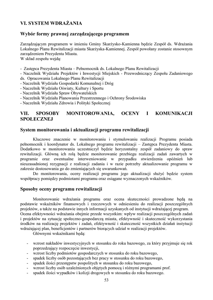 VI. SYSTEM WDRAŻANIA Wybór formy prawnej zarządzającego programem Zarządzającym programem w imieniu Gminy Skarżysko-Kamienna będzie Zespół ds. Wdrażania Lokalnego Planu Rewitalizacji miasta Skarżyska-Kamiennej. Zespół powołany zostanie stosownym zarządzeniem Prezydenta Miasta. W skład zespołu wejdą: - Zastępca Prezydenta Miasta – Pełnomocnik ds. Lokalnego Planu Rewitalizacji - Naczelnik Wydziału Projektów i Inwestycji Miejskich - Przewodniczący Zespołu Zadaniowego ds. Opracowania Lokalnego Planu Rewitalizacji - Naczelnik Wydziału Gospodarki Komunalnej i Dróg - Naczelnik Wydziału Oświaty, Kultury i Sportu - Naczelnik Wydziału Spraw Obywatelskich - Naczelnik Wydziału Planowania Przestrzennego i Ochrony Środowiska - Naczelnik Wydziału Zdrowia i Polityki Społecznej VII. SPOSOBY SPOŁECZNEJ MONITOROWANIA, OCENY I KOMUNIKACJI System monitorowania i aktualizacji programu rewitalizacji Kluczowe znaczenie w monitorowaniu i stymulowaniu realizacji Programu posiada pełnomocnik i koordynator ds. Lokalnego programu rewitalizacji – Zastępca Prezydenta Miasta. Dodatkowo w monitorowaniu uczestniczył będzie horyzontalny zespół zadaniowy do spraw rewitalizacji. Główną ich rolą będzie monitorowanie przebiegu realizacji zadań zawartych w programie oraz ewentualne interweniowanie w przypadku stwierdzenia opóźnień lub nieuzasadnionej rezygnacji z realizacji zadania i w razie potrzeby aktualizowanie programu w zakresie dostosowania go do zmieniających się uwarunkowań. Do monitorowania, oceny realizacji programu jego aktualizacji służyć będzie system współpracy pomiędzy podmiotami programu oraz osiągane wyznaczonych wskaźników. Sposoby oceny programu rewitalizacji Monitorowanie wdrażania programu oraz ocena skuteczności prowadzone będą na podstawie wskaźników finansowych i rzeczowych w odniesieniu do realizacji poszczególnych projektów, a także na podstawie innych informacji uzyskanych od instytucji wdrażającej program. Ocena efektywności wdrażania obejmie przede wszystkim: wpływ realizacji poszczególnych zadań i projektów na sytuację społeczno-gospodarczą miasta, efektywność i skuteczność wykorzystania środków na realizację projektów i zadań, efektywność i skuteczność wszystkich działań instytucji wdrażającej plan, beneficjentów i partnerów biorących udział w realizacji projektów. Głównymi wskaźnikami będą: - wzrost nakładów inwestycyjnych w stosunku do roku bazowego, za który przyjmuje się rok poprzedzający rozpoczęcie inwestycji, wzrost liczby podmiotów gospodarczych w stosunku do roku bazowego, spadek liczby osób pozostających bez pracy w stosunku do roku bazowego, spadek ilości przestępstw pospolitych w stosunku do roku bazowego, wzrost liczby osób uzależnionych objętych pomocą i różnymi programami prof. spadek ilości wypadków i kolizji drogowych w stosunku do roku bazowego. 53 System monitorowania i kontroli będzie skierowany na : - analizę postępów w realizacji programu - kontrolę terminów wykonania poszczególnych zadań. Sposoby inicjowania współpracy pomiędzy sektorem publicznym, prywatnym i organizacjami pozarządowymi Inicjowanie współpracy pomiędzy sektorem publicznym, prywatnym i organizacjami pozarządowymi stanowi kontynuację pracy nad Lokalnym Programem Rewitalizacji, gdzie władze gminy zaprosiły do współpracy wszystkie aktywne jednostki życia społeczno-gospodarczego z terenu gminy. Cykliczne spotkania i przedstawienie propozycji współudziału i współfinansowania istotnych projektów oraz zakładanie partnerstw publiczno-prywatnych, mogących aplikować o środki z innych źródeł daje dodatkowe możliwości zrealizowania ambitnych zamierzeń miasta Skarżyska-Kamiennej. Public Relations Lokalnego Programu Rewitalizacji Promocję działań realizowanych w ramach Lokalnego Programu Rewitalizacji i założeń samego programu będzie prowadzić Urząd Miasta Skarżyska-Kamiennej zgodnie z zasadami informowania i promocji projektów współfinansowanych z Funduszy Strukturalnych. Wszelkie materiały promocyjne będą określać cele realizacji poszczególnych zadań w ramach programu, planowane wskaźniki osiągnięć oraz źródła finansowania projektów. Celem działań związanych z promocją programu jest dotarcie do jak najszerszej grupy beneficjentów działań podejmowanych w ramach programu a także instytucji mogących być partnerami w realizacji inwestycji. Grupami tymi są: - beneficjenci projektów/ mieszkańcy gminy, - środowisko przedsiębiorców - organizacje pozarządowe - partnerzy społeczni W ramach promocji Lokalnego Programu Rewitalizacji podejmowane będą w szczególności takie działania jak: - umieszczenie na stronie internetowej Urzędu Miasta Skarżyska-Kamiennej, - organizacja spotkań z potencjalnymi partnerami społeczno-gospodarczymi, - umieszczenie bilbordów (tablic reklamowych) w miejscach realizacji inwestycji infrastrukturalnych, informujących o zakresie realizowanych projektów, - umieszczenie stałej tablicy pamiątkowej w miejscach powszechnie dostępnych, celem pozostawienia trwałej informacji o wsparciu inwestycji ze środków unijnych, publikacje w prasie, informacje w radiu i telewizji. 54