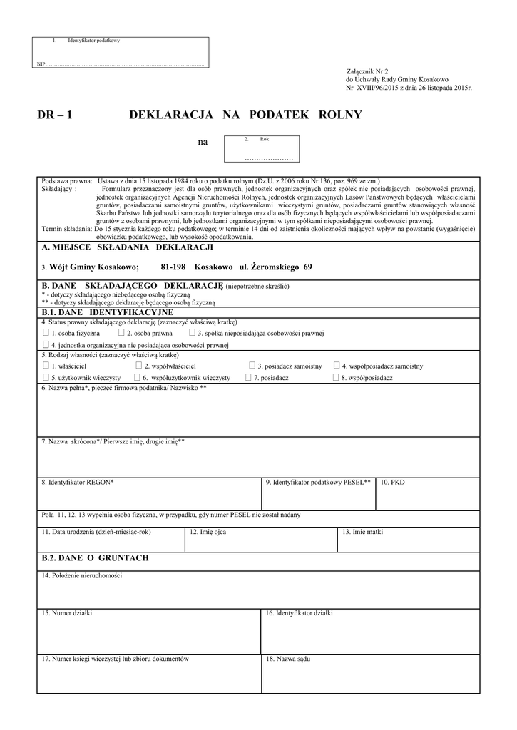 1. Identyfikator podatkowy NIP……………………………………………………………………………….. Załącznik Nr 2 do Uchwały Rady Gminy Kosakowo Nr XVIII/96/2015 z dnia 26 listopada 2015r. DR – 1 DEKLARACJA NA PODATEK ROLNY na 2. Rok ………………… Podstawa prawna: Ustawa z dnia 15 listopada 1984 roku o podatku rolnym (Dz.U. z 2006 roku Nr 136, poz. 969 ze zm.) Składający : Formularz przeznaczony jest dla osób prawnych, jednostek organizacyjnych oraz spółek nie posiadających osobowości prawnej, jednostek organizacyjnych Agencji Nieruchomości Rolnych, jednostek organizacyjnych Lasów Państwowych będących właścicielami gruntów, posiadaczami samoistnymi gruntów, użytkownikami wieczystymi gruntów, posiadaczami gruntów stanowiących własność Skarbu Państwa lub jednostki samorządu terytorialnego oraz dla osób fizycznych będących współwłaścicielami lub współposiadaczami gruntów z osobami prawnymi, lub jednostkami organizacyjnymi w tym spółkami nieposiadającymi osobowości prawnej. Termin składania: Do 15 stycznia każdego roku podatkowego; w terminie 14 dni od zaistnienia okoliczności mających wpływ na powstanie (wygaśnięcie) obowiązku podatkowego, lub wysokość opodatkowania. A. MIEJSCE SKŁADANIA DEKLARACJI 3. Wójt Gminy Kosakowo; B. DANE 81-198 Kosakowo ul. Żeromskiego 69 SKŁADAJĄCEGO DEKLARACJĘ (niepotrzebne skreślić) * - dotyczy składającego niebędącego osobą fizyczną ** - dotyczy składającego deklarację będącego osobą fizyczną B.1. DANE IDENTYFIKACYJNE 4. Status prawny składającego deklarację (zaznaczyć właściwą kratkę) 1. osoba fizyczna 3. spółka nieposiadająca osobowości prawnej 2. osoba prawna 4. jednostka organizacyjna nie posiadająca osobowości prawnej 5. Rodzaj własności (zaznaczyć właściwą kratkę) 1. właściciel 2. współwłaściciel 5. użytkownik wieczysty 6. współużytkownik wieczysty 6. Nazwa pełna*, pieczęć firmowa podatnika/ Nazwisko ** 3. posiadacz samoistny 7. posiadacz 4. współposiadacz samoistny 8. współposiadacz 7. Nazwa skrócona*/ Pierwsze imię, drugie imię** 8. Identyfikator REGON* 9. Identyfikator podatkowy PESEL** 10. PKD Pola 11, 12, 13 wypełnia osoba fizyczna, w przypadku, gdy numer PESEL nie został nadany 11. Data urodzenia (dzień-miesiąc-rok) 12. Imię ojca 13. Imię matki B.2. DANE O GRUNTACH 14. Położenie nieruchomości 15. Numer działki 16. Identyfikator działki 17. Numer księgi wieczystej lub zbioru dokumentów 18. Nazwa sądu B.3. ADRES SIEDZIBY* / ADRES ZAMIESZKANIA** 19. Kraj 20. Województwo 21. Powiat 22. Gmina 23. Ulica 24. Numer domu / Numer lokalu 25. Miejscowość 26. Kod pocztowy 27. Poczta C. OBOWIĄZEK ZŁOŻENIA DEKLARACJI 28. Okoliczności powodujące konieczność złożenia deklaracji (zaznaczyć właściwą kratkę) 2. korekta deklaracji rocznej (miesiąc - rok) …………………………… 1. deklaracja roczna D. DANE DOTYCZĄCE PRZEDMIOTÓW OPODATKOWANIA (włącznie ze zwolnionymi) Stawka podatku rolnego: (zgodnie z art. 6 ustawy o podatku rolnym stawka podatku wynosi: dla gospodarstw rolnych – równowartość pieniężną 2,5q żyta dla gruntów niestanowiących gospodarstw rolnych – równowartość pieniężną 5 q żyta) Klasa użytków wynikające z ewidencji gruntów Powierzchnia w hektarach fizycznych (należy podać z dokładnością do czterech miejsc po przecinku) Przelicznik 1 2 3 Powierzchnia w ha przeliczeniowych (kol.2 x kol.3) Stawka podatku z jednego ha przeliczeniowego lub fizycznego zł, gr 4 5 GRUNTY ORNE (R) I II IIIa IIIb IVa IVb V VI SADY (S-R,S-Ł,S-Ps) I II III/IIIa IIIb IV/IVa IVb V VI UŻYTKI ZIELONE (Ps,Ł) I II III IV V VI GRUNTY ROLNE ZABUDOWANE: GRUNTY ORNE (Br-R), ŁĄKI I PASTWISKA (Br-Ł, Br-Ps), I II III IIIa IIIb IVa IV IVb V VI VIz Wymiar podatku rolnego w zł *w przypadku gospodarstw rolnych: kol4 x stawka podatku *w przypadku gruntów niestanowiących gospodarstw rolnych: kol.2. stawka podatku 6 1 2 3 4 5 6 GRUNTY POD STAWAMI (Wsr) a) Zarybionymi łososiem, trocią, głowacicą , palią i pstrągiem I, II, III, IIIa, IIIb, IV, IVa, IVb lub bez klasy V, VI, VIz b) Zarybionymi innymi gatunkami ryb niż w poz. a) I, II, III, IIIa, IIIb, IV,IVa,IVb lub bez klasy V, VI, VIz c) Grunty pod stawami niezarybionymi I, II, III, IIIa, IIIb, IV,IVa,IVb lub bez klasy V, VI, VIz GRUNTY POD ROWAM (W) I, II, III, IIIa, IIIb, IV,IVa,IVb lub bez klasy V, VI, VIz GRUNTY ZADRZEWIONE I ZAKRZEWIONE NA UŻYTKACH ROLNYCH (Lzr-R, Lzr-Ł, Lzr-Ps) UŻYTKI ROLNE DLA KTÓRYCH NIE MOŻNA USTALIĆ PRZELICZNIKA na podstawie art. 4 ust. 5-7 ustawy o podatku rolnym RAZEM E. ULGI W PODATKU ROLNYM 1. Z tytułu nabycia lub objęcia w zagospodarowanie gruntów 2. Inwestycyjne 3. Inne RAZEM F. ŁĄCZNA KWOTA PODATKU Kwota podatku Różnica kwot D-E (należy zaokrąglić do pełnych złotych) – zgodnie z ustawą z dnia 29 sierpnia 1997 r. Ordynacja podatkowa (tekst jednolity Dz.U. z 2015r. poz. 613 z późniejszymi zmianami – art. 63§ 1) zł , G. INFORMACJA O PRZEDMIOTACH ZWOLNIONYCH Rodzaj zwolnienia Powierzchnia gruntu Podstawa prawna zastosowania zwolnienia/ ulgi 1. 2. 3. 4. H. OŚWIADCZENIE I PODPIS PODATNIKA / OSOBY REPREZENTUJĄCEJ PODATNIKA Oświadczam, że podane przeze mnie dane są zgodne z prawdą. 29. Imię i nazwisko osoby wypełniającej deklarację 31. Data wypełnienia deklaracji ( dzień – miesiąc - rok ) 32. Telefon kontaktowy 30. Podpis (pieczęć) podatnika / osoby reprezentującej podatnika I. ADNOTACJE ORGANU PODATKOWEGO 33. Uwagi organu podatkowego 34. Data( dzień – miesiąc - rok ) 35. Podpis przyjmującego deklarację Pouczenie: 1. W przypadku nie wpłacenia określonych ustawowo terminach kwoty należnego podatku lub wpłacenia jej w niepełnej wysokości niniejsza deklaracja stanowi podstawę do wystawienia tytułu wykonawczego, zgodnie z przepisami ustawy z dnia 17 czerwca 1966r. o postępowaniu egzekucyjnym w administracji (Dz.U. z 2014r., poz. 1619 z pó