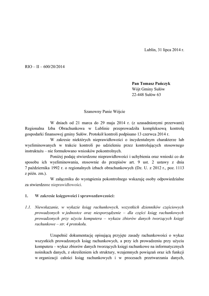 Lublin, 31 lipca 2014 r. RIO – II – 600/20/2014 Pan Tomasz Pańczyk Wójt Gminy Sułów 22-448 Sułów 63 Szanowny Panie Wójcie W dniach od 21 marca do 29 maja 2014 r. (z uzasadnionymi przerwami) Regionalna Izba Obrachunkowa w Lublinie przeprowadziła kompleksową kontrolę gospodarki finansowej gminy Sułów. Protokół kontroli podpisano 13 czerwca 2014 r. W zakresie niektórych nieprawidłowości o incydentalnym charakterze lub wyeliminowanych w trakcie kontroli po udzieleniu przez kontrolujących stosownego instruktażu – nie formułowano wniosków pokontrolnych. Poniżej podaję stwierdzone nieprawidłowości i uchybienia oraz wnioski co do sposobu ich wyeliminowania, stosownie do przepisów art. 9 ust. 2 ustawy z dnia 7 października 1992 r. o regionalnych izbach obrachunkowych (Dz. U. z 2012 r., poz. 1113 z późn. zm.). W załączniku do wystąpienia pokontrolnego wskazuję osoby odpowiedzialne za stwierdzone nieprawidłowości. 1. W zakresie księgowości i sprawozdawczości: 1.1. Niewskazanie, w wykazie ksiąg rachunkowych, wszystkich dzienników częściowych prowadzonych w jednostce oraz niesporządzenie – dla części ksiąg rachunkowych prowadzonych przy użyciu komputera – wykazu zbiorów danych tworzących księgi rachunkowe – str. 4 protokołu. Uzupełnić dokumentację opisującą przyjęte zasady rachunkowości o wykaz wszystkich prowadzonych ksiąg rachunkowych, a przy ich prowadzeniu przy użyciu komputera – wykaz zbiorów danych tworzących księgi rachunkowe na informatycznych nośnikach danych, z określeniem ich struktury, wzajemnych powiązań oraz ich funkcji w organizacji całości ksiąg rachunkowych i w procesach przetwarzania danych, 2 stosownie do przepisów art. 10 ust. 1 pkt 3 lit. b i ust. 2 ustawy z dnia 29 września 1994 r. o rachunkowości (Dz. U. z 2013 r., poz. 330 z późn. zm.). 1.2. Prowadzenie ewidencji analitycznej do konta 221 „Należności z tytułu dochodów budżetowych”, w zakresie dochodów z majątku gminy oraz opłat za korzystanie z zezwoleń na sprzedaż napojów alkoholowych, niezgodnie ze sposobem określonym w dokumentacji opisującej przyjęte zasady prowadzenia rachunkowości (ręcznie zamiast komputerowo) – str. 5 protokołu. Konta ksiąg pomocniczych prowadzić w sposób określony w dokumentacji opisującej przyjęte zasady rachunkowości, przy pomocy programów w niej wskazanych, zgodnie z przepisami art. 10 ust. 1 pkt 3 w związku z przepisami art. 10 ust. 2 ustawy o rachunkowości; rozważyć dostosowanie postanowień przepisów wewnętrznych do faktycznych potrzeb jednostki. 1.3. Niesporządzenie na 31 grudnia 2013 r. zestawień sald kont ksiąg pomocniczych prowadzonych techniką ręczną oraz na dzień inwentaryzacji zestawienia sald inwentaryzowanej grupy aktywów – str. 5, 27 protokołu. Co najmniej na dzień zamknięcia ksiąg rachunkowych sporządzać zestawienia sald wszystkich kont ksiąg pomocniczych, a na dzień inwentaryzacji – zestawienia sald inwentaryzowanej grupy składników aktywów, zgodnie z przepisami art. 18 ust. 2 ustawy o rachunkowości. 1.4. Przypadki nieujęcia w księgach rachunkowych 2013 r. wszystkich kosztów dotyczących tego roku – str. 6 protokołu. W księgach rachunkowych jednostki ujmować wszystkie obciążające ją koszty dotyczące danego roku obrotowego, niezależnie od terminu ich zapłaty, stosownie do przepisów art. 6 ust. 1 ustawy o rachunkowości. 1.5. Niebieżące ewidencjonowanie operacji gospodarczych oraz nieujmowanie na kontach rozrachunkowych wszystkich zobowiązań wynikających z faktur – str. 6, 7, 12, 13 i 71 protokołu. Do ksiąg rachunkowych okresu sprawozdawczego wprowadzać, w postaci zapisu, każde zdarzenie, które nastąpiło w tym okresie sprawozdawczym, zgodnie z przepisami art. 20 ust. 1 ustawy o rachunkowości, w związku z § 18 ust. 2 rozporządzenia Ministra Finansów z dnia 5 lipca 2010 r. w sprawie szczególnych zasad rachunkowości oraz planów kont dla budżetu państwa, budżetów jednostek samorządu terytorialnego, jednostek budżetowych, samorządowych zakładów budżetowych, państwowych funduszy celowych oraz państwowych jednostek budżetowych mających siedzibę poza granicami Rzeczypospolitej Polskiej (Dz. U. z 2013 r., poz. 289), 3 powoływanego go w dalszej części tego wystąpienia jako „rozporządzenie Ministra Finansów z dnia 5 lipca 2010 r.”. W ewidencji księgowej wszystkich etapów rozliczeń poprzedzających płatność wydatków, stosownie do przepisów art. 40 ust. 2 pkt 2 ustawy z dnia 27 sierpnia 2009 r. o finansach publicznych (Dz. U. z 2013 r., poz. 885 z późn. zm.) i zasad funkcjonowania kont rozrachunkowych, określonych w załączniku Nr 3 do cytowanego rozporządzenia. 1.6. Przypadki ewidencjonowania operacji gospodarczych z naruszeniem porządku systematycznego – str. 8, 14, 17, 18, 22, 23 protokołu. Zapisów o zdarzeniach dokonywać na kontach księgi głównej w ujęciu systematycznym, w związku z przepisami art. 15 ust. 1 ustawy o rachunkowości, w szczególności: a) uznanie za wątpliwe odsetek od należności z tytułu dochodów budżetowych ujmować: Wn 761 „Pozostałe koszty operacyjne” (odsetki od należności podatkowych) lub Wn 751 „Koszty finansowe” (odsetki od pozostałych należności) Ma 290 „Odpisy aktualizujące należności”, mając na uwadze przepisy art. 35 b i 35 c ustawy o rachunkowości, zgodnie z którymi wartość należności aktualizuje się przez dokonanie odpisu aktualizującego, uwzględniając stopień prawdopodobieństwa zapłaty tych należności, natomiast zmniejszenie wartości odpisów dokonywane winno być w momencie ustania przyczyny, dla której dokonano odpisu aktualizującego wartość aktywów, b) w księgach rachunkowych Urzędu Gminy ujmować jako przychody dochody budżetu gminy nieujęte w planach finansowych innych jednostek gminy, stosownie do § 7 rozporządzenia Ministra Finansów z dnia 5 lipca 2010 r., c) odprowadzen