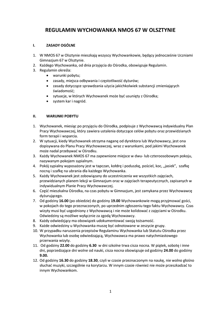 REGULAMIN WYCHOWANKA NMOS 67 W OLSZTYNIE I. ZASADY OGÓLNE 1. W NMOS 67 w Olsztynie mieszkają wszyscy Wychowankowie, będący jednocześnie Uczniami Gimnazjum 67 w Olsztynie. 2. Każdego Wychowanka, od dnia przyjęcia do Ośrodka, obowiązuje Regulamin. 3. Regulamin określa: warunki pobytu; zasady, miejsca odbywania i częstotliwość dyżurów; zasady dotyczące sprawdzania użycia jakichkolwiek substancji zmieniających świadomość; sytuacje, w których Wychowanek może być usunięty z Ośrodka; system kar i nagród. II. WARUNKI POBYTU 1. Wychowanek, miesiąc po przyjęciu do Ośrodka, podpisuje z Wychowawcą indywidualny Plan Pracy Wychowawczej, który zawiera ustalenia dotyczące celów pobytu oraz przewidzianych form terapii i wsparcia. 2. W sytuacji, kiedy Wychowanek otrzyma naganę od dyrektora lub Wychowawcy, jest ona dopisywana do Planu Pracy Wychowawczej, wraz z warunkami, pod jakimi Wychowanek może nadal przebywać w Ośrodku. 3. Każdy Wychowanek NMOS 67 ma zapewnione miejsce w dwu- lub czteroosobowym pokoju, nazywanym pokojem sypialnym. 4. Pokój sypialny wyposażony jest w tapczan, kołdrę i poduszkę, pościel, koc, „jasiek”, szafkę nocną i szafkę na ubrania dla każdego Wychowanka. 5. Każdy Wychowanek jest zobowiązany do uczestniczenia we wszystkich zajęciach, przewidzianych planem lekcji w Gimnazjum oraz w zajęciach terapeutycznych, zapisanych w indywidualnym Planie Pracy Wychowawczej. 6. Część mieszkalna Ośrodka, na czas pobytu w Gimnazjum, jest zamykana przez Wychowawcę dyżurującego. 7. Od godziny 16.00 (po obiedzie) do godziny 19.00 Wychowankowie mogą przyjmować gości, w pokojach do tego przeznaczonych, po uprzednim zgłoszeniu tego faktu Wychowawcy. Czas wizyty musi być uzgodniony z Wychowawcą i nie może kolidować z zajęciami w Ośrodku. Odwiedziny są możliwe wyłącznie za zgodą Wychowawcy. 8. Każdy odwiedzjący ma obowiązek udokumentować swoją tożsamość. 9. Każde odwiedziny u Wychowanka muszę być odnotowane w zeszycie grupy. 10. W przypadku naruszenia przepisów Regulaminu Wychowanka lub Statutu Ośrodka przez Wychowanka lub osobę odwiedzającą, Wychowawca ma prawo natychmiastowego przerwania wizyty. 11. Od godziny 22.00 do godziny 6.30 w dni szkolne trwa cisza nocna. W piątek, sobotę i inne dni, poprzedzające dni wolne od nauki, cisza nocna obowiązuje od godziny 24.00 do godziny 9.00. 12. Od godziny 16.30 do godziny 18.30, czyli w czasie przeznaczonym na naukę, nie wolno głośno słuchać muzyki, szczególnie na korytarzu. W innym czasie również nie może przeszkadzać to innym Wychowankom. 1 13. Pobudka w dni szkolne jest o godzinie 7.00, osoby, mające dyżur w kuchni budzone są o godzinie 6.45. Pobudka w sobotę, niedzielę i dni wolne od nauki jest o godzinie 9.00, osoby mające dyżur w kuchni budzone są o godzinie 8.45. 14. Każdy Wychowanek Ośrodka ma zapewnione całodzienne wyżywienie. Rodzice i inne osoby upoważnione do odwiedzin, mogą przynosić jedzenie Wychowankom, pod warunkiem zgłoszenia tego Wychowawcom, przy czym nie mogą być to produkty szczególnie szkodliwe, takie jak chipsy, „zupki chińskie” czy nadmierna ilość słodyczy. 15. Wychowanek, który korzysta z kuchni poza porami posiłków, zobowiązany jest zostawić tam idealny porządek. 16. Wychowankowie, którzy posiadają telefony komórkowe, przed ciszą nocną oddają je w depozyt do Wychowawcy. Telefon jest zwracany Wychowankowi w porze ustalonej z Wychowawcą, na godzinę dziennie. 17. Wychowankowie, pod nadzorem Wychowawcy, mogą korzystać z pralki. Częstotliwość prania rzeczy osobistych ustalana jest z Wychowawcą, w soboty pierzemy również rzeczy wspólne: pościel, ręczniki do rąk, ścierki kuchenne itp. 18. Wychowankowie, którzy przyjmują jakiekolwiek leki, oddają je Wychowawcom, wraz z zaleceniem przyjmowania, wypisanym przez lekarza lub rodzica/opiekuna. 19. Leki są podawane WYŁĄCZNIE przez Wychowawców, według wskazań. 20. Wychowawcy, bez wskazania lekarza lub pisemnej zgody rodzica/opiekuna, mogą podać WYŁĄCZNIE leki przeciwgorączkowe, przeciwbólowe lub rozkurczające. III. ZASADY, MIEJSCA I CZĘSTOTLIWOŚĆ DYŻURÓW 1. Każdy Wychowanek ma obowiązek codziennie dbać o porządek w swoim pokoju – przed ciszą nocną oraz przed wyjściem do szkoły jest on sprawdzany przez Wychowawcę. Raz w tygodniu, w sobotę od godz. 10.00 cała część mieszkalna Ośrodka jest sprzątana „generalnie”, co obejmuje: zamiatanie i mycie podłogi na korytarzu i schodach, sprzątanie łazienki: czyszczenie pryszniców, czyszczenie toalet, wytarcie półek i parapetów, uzupełnienie zapasu papieru toaletowego i mydła, zmianę ręcznika do rąk, wyniesienie śmieci, zamiecenie i zmycie podłogi. sprzątanie kuchni: umycie i posprzątanie lodówki, uporządkowanie naczyń i garnków, posprzątanie szafek kuchennych, uzupełnienie zapasu płynu do mycia naczyń, zmianę ścierek i gąbek, wyniesienie śmieci, zamiecenie i zmycie podłogi. 2. O porządek w pokojach sypialnych i na grupach dbają ich mieszkańcy. Za sprzątanie części wspólnych, np. schodów, podwórka, odpowiadają dyżurne grupy. 3. Grafik dyżurów obejmuje też codzienne: dyżury w kuchni: przygotowanie śniadania i kolacji, według jadłospisu, dla swojej grupy, sprzątanie po posiłkach w jadalni i w kuchni; 2 dyżury w łazience: wytarcie podłogi, rozwieszenie mokrych mat, pozbieranie i wyrzucenie śmieci; dyżury obiadowe: zebranie brudnych naczyń ze stolików, wytarcie stolików. IV. ZASADY DOTYCZĄCE SPRAWDZANIA UŻYCIA JAKICHKOLWIEK SUBSTANCJI ZMIENIAJĄCYCH ŚWIADOMOŚĆ 1. W razie podejrzenia użycia jakiejkolwiek substancji zmieniającej świadomość (alkoholu, dopalaczy, narkotyków, nieprzepisanych leków), Wychowawca lub dyrektor przeprowadza rozmowę z Wychowankiem. Jest to ostatnia szansa Wychowanka na samodzielne wyjaśnienie sytuacji. 2. W sytuacji, kiedy Wychowanek nie przyznaje się do użycia lub nie chce po