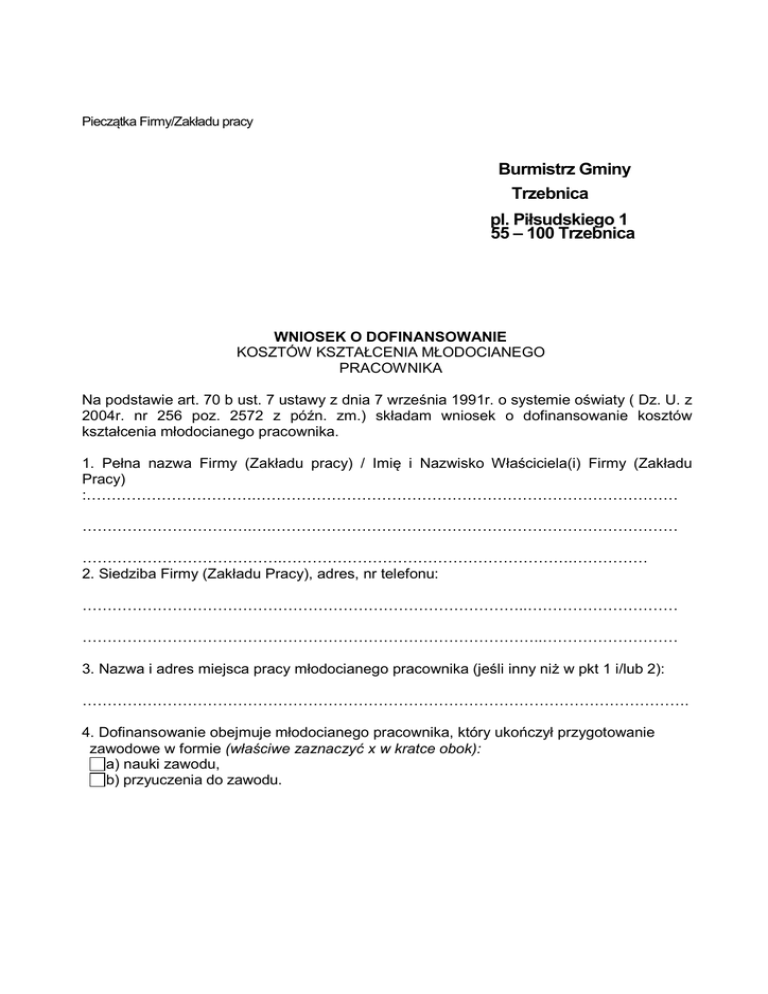 Pieczątka Firmy/Zakładu pracy Burmistrz Gminy Trzebnica pl. Piłsudskiego 1 55 – 100 Trzebnica WNIOSEK O DOFINANSOWANIE KOSZTÓW KSZTAŁCENIA MŁODOCIANEGO PRACOWNIKA Na podstawie art. 70 b ust. 7 ustawy z dnia 7 września 1991r. o systemie oświaty ( Dz. U. z 2004r. nr 256 poz. 2572 z późn. zm.) składam wniosek o dofinansowanie kosztów kształcenia młodocianego pracownika. 1. Pełna nazwa Firmy (Zakładu pracy) / Imię i Nazwisko Właściciela(i) Firmy (Zakładu Pracy) :…………………………….………………………………………………………………………… …………………………….….……………………………………………………………………… ………………………………….………………………………………………….…………… 2. Siedziba Firmy (Zakładu Pracy), adres, nr telefonu: ……………………………………………………………………………..………………………… ………………………………………………………………………………..……………………… 3. Nazwa i adres miejsca pracy młodocianego pracownika (jeśli inny niż w pkt 1 i/lub 2): …………………………………………………………………………………………………………. 4. Dofinansowanie obejmuje młodocianego pracownika, który ukończył przygotowanie zawodowe w formie (właściwe zaznaczyć x w kratce obok): a) nauki zawodu, b) przyuczenia do zawodu. L.p. Imię i nazwisko ucznia Adres zamieszkania Data urodzenia Data rozpoczęcia przygotowania zawodowego Data ukończenia przygotowania zawodowego Liczba miesięcy przygotowania zawodowego Zawód 5. Nr rachunku bankowego, na który należy przesłać przyznane dofinansowanie: 6. Oświadczam, że spełniam niezbędne wymagania do ubiegania się o dofinansowanie kosztów kształcenia określone w art. 70b ust. 1 ustawy o systemie oświaty, tj.: • posiadam kwalifikacje /zatrudniam osobę posiadającą kwalifikacje*/ wymagane do prowadzenie przygotowania zawodowego młodocianych (zgodnie z § 10 rozporządzenia Ministra Edukacji Narodowej i Sportu z dnia 1 lipca 2002r. w sprawie praktycznej nauki zawodu – Dz. U. nr 113poz. 988 z późn. zm.) • młodociany pracownik ukończył naukę zawodu / przyuczenie do wykonywania określonej pracy* i zdał stosowny egzamin, • umowa o pracę w celu przygotowania zawodowego zawarta została ………………………………….. Do wniosku załączam: ………………………………………………………………………………………………………… ………………………………………………………………………………………………………… ………………………………………………………………………………………………………… ………………………………………………………………………………………………………… ………………………………………………………………………………………………………… POUCZENIE Zgodnie z przepisem art. 10 §1 ustawy z dnia 14 czerwca 1960r. Kodeksu Postępowania Administracyjnego (Dz. U. z 2000r. Nr 98, poz. 1071 z późn. zm.) wnioskodawcy przysługuje prawo do uczestnictwa w każdym stadium postępowania, a przed wydaniem decyzji prawo do wypowiedzenia się w sprawie zebranych dowodów i materiałów oraz zgłoszonych żądań. W przypadku nie skorzystania z powyższego wyrażam zgodę na wydanie decyzji ustalającej dofinansowanie wyłącznie w oparciu o powyższe dane zawarte we wniosku. ………………………………………… ………………………………………………………………….. /miejscowość/ data podpis i pieczątka wnioskodawcy właściciela Firmy/Zakładu Pracy Dofinansowaniem objęte jest kształcenie młodocianego pracownika zamieszkałego na terenie Gminy Trzebnica Uwagi: Pracodawca składa wniosek w terminie 3 miesięcy od ukończenia przez młodocianego pracownika nauki zawodu lub przyuczenia go do określonej pracy (od zdania egzaminu). Wniosek składa się dla każdego młodocianego oddzielnie, chyba, że czas trwania umowy, zawód i data egzaminu końcowego są takie same dla kilku uczniów, wówczas można złożyć jeden wspólny wniosek. Wniosek należy składać w Urzędzie Miejskim w Trzebnicy, pl. Piłsudskiego 1 (sekretariat) Do wniosku należy dołączyć kopie (potwierdzone przez pracodawcę za zgodność z oryginałem): 1. dokumentów potwierdzających, że pracodawca lub osoba prowadząca w imieniu pracodawcy albo osoba zatrudniona u pracodawcy posiada kwalifikacje wymagane do prowadzenia przygotowania zawodowego młodocianego wraz z potwierdzeniem zatrudnienia takiej osoby oraz zaświadczenie określające staż pracy instruktora przygotowania zawodowego – jeśli z przepisów to wynika. 2. umowy o pracę zawartej z młodocianym pracownikiem w celu przygotowania zawodowego, 3. dyplomu, świadectwa lub zaświadczenia potwierdzającego, że młodociany pracownik ukończył naukę zawodu lub przyuczenie, 4. świadectwa pracy młodocianego, 5. zaświadczenia o zaliczeniu praktycznej nauki zawodu u poprzedniego pracodawcy (w przypadku przerwania nauki i podjęcia jej u innego pracodawcy), 6. upoważnienia pracodawcy do poświadczenia dokumentów za zgodność z oryginałem, w przypadku gdy poświadczenia dokonuje inna osoba niż pracodawca, 7. pełnomocnictwa, jeżeli wnioskodawca reprezentowany jest przez inną osobę.