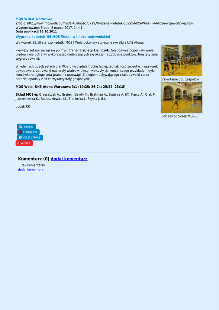 MOS WOLA Warszawa Źródło: http://www.moswola.pl/mos/aktualnosci/3719,Wygrana-kadetek-03995-MOS-Wola-I-w-I-lidze-wojewodzkiej.html Wygenerowano: Środa, 8 marca 2017, 14:41 Data publikacji 26.10.2011 Wygrana kadetek '95 MOS Wola I w I lidze wojewódzkiej We wtorek 25.10 starsze kadetki MOS I Wola pokonały stołeczne rywalki z UKS Atena. Pierwszy set nie zaczął się po myśli trener Elżbiety Lizińczyk. Gospodynie popełniały wiele błędów i nie potrafiły wykorzystać nadarzających się okazji na zdobycie punktów. Niestety seta wygrały rywalki. W kolejnych trzech setach gra MOS-u wyglądała trochę lepiej, jednak ilość zepsutych zagrywek powodowała, że rywalki nabierały wiatru w plecy i walczyły do końca, czego przykładem była koncówka drugiego seta grana na przewagi. Z biegiem upływającego czasu rywalki coraz bardziej opadały z sił co wykorzystały gospodynie. przywitanie obu zespołów MOS Wola- UKS Atena Warszawa 3:1 (19:25; 26:24; 25:22; 25:18) Skład MOS-u: Grzeszczak A., Grajek., Gawlik K., Bratman A., Świercz A. (K), Karcz A., Olak M., Jędrzejewska K., Robaszkiewicz M., Trocińska J., Szyjka J. (L), dodał: RK Blok zawodniczek MOS-u Komentarz (0) dodaj komentarz Brak komentarzy dodaj komentarz