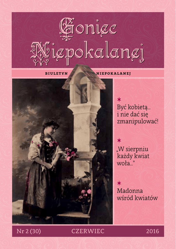 biuletyn niepokalanej ✶ Być kobietą… i nie dać się zmanipulować! ✶ „W sierpniu każdy kwiat woła…” ✶ Madonna wśród kwiatów Nr 2 (30) CZERWIEC 2016 Spis treści Frances Alice Forbes Św. Atanazy. Strażnik wiary Będąc chłopcem, podczas zabawy niechcący… chrzci swoich przyjaciół. Jako diakon bierze udział w obradach Soboru Nicejskiego potępiającego arianizm. Zostaje patriarchą egipskiej Aleksandrii, by wojować z pogaństwem i herezją. Fałszywie oskarżony, broni wiary przed cesarzem. Wygnany... powraca i walczy o prawdę. Napadnięty zbrojnie, ratuje się ucieczką na pustynię. Heretycy palą, torturują i zabijają.Wraca i przeciwstawia się Julianowi Apostacie. Wspierają go papieże, cesarze prześladują. Ostatecznie triumfuje... ratując Kościół powszechny przed upadkiem. 4 | Wstęp Wydawnictwo Diecezjalne Sandomierz, 2012 ss. 176, format 125x195, miękka oprawa Książka do nabycia tedeum.pl ☛ duchowość 8 | Być kobietą… i nie dać się zmanipulować! 13 | Przez uchylone drzwi 16 | „W sierpniu każdy kwiat woła…” wędrówki gońca 18 | Miasto cudownego obrazu kultura Ale to jeszcze nie wszystko. To tylko kilka epizodów życia jednego człowieka… 20 | Madonna wśród kwiatów Poznaj św. Atanazego – Strażnika wiary. 22 | Promień czerwiec – sierpień 2016 3 goniec niepokalanej x. Raivo Kokis fsspx Wstęp Drogie Czytelniczki! Spośród wielu świątyń rzymskich starożytnością i godnością wyróżniają się cztery bazyliki patriarchalne zwane bazylikami większymi, w odróżnieniu od wielu kościołów w różnych krajach, którym decyzją Stolicy Apostolskiej nadano tytuł bazyliki mniejszej. Rzymskie bazyliki większe to: Bazylika św. Piotra, Bazylika św. Jana na Lateranie, Bazylika Matki Boskiej Większej i Bazylika św. Pawła za Murami. Bazylika Matki Boskiej Większej (Santa Maria Maggiore) jest głównym sanktuarium maryjnym Rzymu. Podanie przypisuje wzniesienie tej świątyni papieżowi Liberiuszowi. W czasie jego panowania, w roku 352, bogaty patrycjusz rzymski Jan otrzymał we śnie polecenie budowy kościoła poświęconego Matce Boskiej – w miejscu, w którym spadnie śnieg. Kiedy udał się z tą wiadomością do papieża, dowiedział się, że i on miał identyczny sen. Nazajutrz całe wzgórze eskwilińskie pokryło się świeżym śniegiem, mimo że był to 5 sierpnia i we Włoszech panowały wielkie upały. Udali się więc razem na wzgórze, gdzie papież na śniegu narysował plan kościoła. Natychmiast rozpoczęto budowę. Takie są początki tej świątyni. Do dziś zachował się w Wiecznym Mieście piękny zwyczaj, że 5 sierpnia, w uroczystość Matki Bożej Śnieżnej (podczas 4 Nieszporów, w czasie śpiewania Magnificat) z kopuły nad ołtarzem głównym zrzuca się płatki białych róż, przypominające płatki śniegu. Obecnie istniejąca bazylika na Eskwilinie jest niewiele młodsza, bowiem została zbudowana przez papieża Sykstusa III na pamiątkę ogłoszenia na soborze efeskim w 431 roku dogmatu o Bożym Macierzyństwie Maryi. Świątynia ta była w ciągu wieków wielokrotnie przebudowywana, jednak zachowała w dużej mierze pierwotny kształt typowy dla stylu wczesnochrześcijańskich budowli sakralnych. Stopniowo obrosła ona wieńcem kaplic. Spośród nich wyróżnia się kaplica dobudowana do bazyliki na początku XVII wieku z fundacji papieża Pawła V, zwana od jego imienia paulińską. Znajduje się w niej słynna ikona Matki Boskiej z Dzieciątkiem, zwana Salus Populi Romani, czyli Ocalenie Ludu Rzymskiego; jej inne miano to Matka Boska Śnieżna. Podanie przypisuje autorstwo ikony wstęp świętemu Łukaszowi. Niegdyś obraz był większy i przedstawiał Matkę Boską w całej postaci, siedzącą na tronie. W czasie pożaru w XIII wieku obraz został nadpalony i wtedy obcięto go do obecnej wielkości. Podczas epidemii dżumy w 590 roku papież Grzegorz Wielki niósł go w uroczystej procesji z kościoła Santa Maria Antiqua do bazyliki św. Piotra. Wtedy to, według tradycji, ukazał się anioł chowający miecz do pochwy, co zrozumiano jako znak zakończenia kary Bożej. Po ustąpieniu zarazy papież nazwał Miłosierną Pannę Salus Populi Romani. Matka Boska ma cechy Hodegetrii, czyli Przewodniczki prowadzącej nas do Chrystusa. Taką formę nadano obrazowi po obcięciu spalonego fragmentu i przemalowaniu. Jednak układ rąk Maryi jest inny niż w typowych Hodegetriach i bardziej odpowiada obrazowi Matki Boskiej Tronującej; typowa Hodegetria prawą ręką wskazuje na Dzieciątko, jak na znanym nam obrazie częstochowskim. Twarze Matki i Syna są przedstawione w sposób typowy do ikony, podobnie jak linearnie namalowane szaty – ta cecha jest szczególnie widoczna na okryciu Dzieciątka. Obraz ten, podobnie jak wiele innych obrazów kultowych, był wielokrotnie kopiowany. Jego kopie znajdują się w wielu krajach. Może najwięcej jest ich w Polsce. To zrozumiałe, gdyż wizerunek ten, obok częstochowskiego, przez długie lata był przez synody biskupów polskich polecany jako wzór dla obrazów Matki Boskiej, malowanych dla kościołów. Wzór ten, zdaniem hierarchów, bardziej odpowiadał wymaganiom sztuki sakralnej niż dzieła ówczesnych artystów tworzone w konwencji renesansowej lub barokowej. Są one niestety zbyt świeckie, nie sprzyjają więc kontemplacji i modlitwie. W II połowie XVI stulecia nad chrześcijańską Europą zawisło śmiertelne niebezpieczeństwo tureckie. W tej sytuacji papież Pius V wezwał wszystkich do nieustającej modlitwy różańcowej, powierzając Matce Boskiej opiekę nad Kościołem. Bractwa różańcowe obnosiły w procesjach ulicami Rzymu obraz Matki Bożej Śnieżnej, prosząc Ją o pomoc; Maryja pomogła pokonać Turków pod Lepanto u wybrzeży Grecji 7 października 1571 roku. Po tych wydarzeniach na prośbę znanych czerwiec – sierpień 2016 5 goniec niepokalanej świętych, Karola Boromeusza i ówczesnego generała