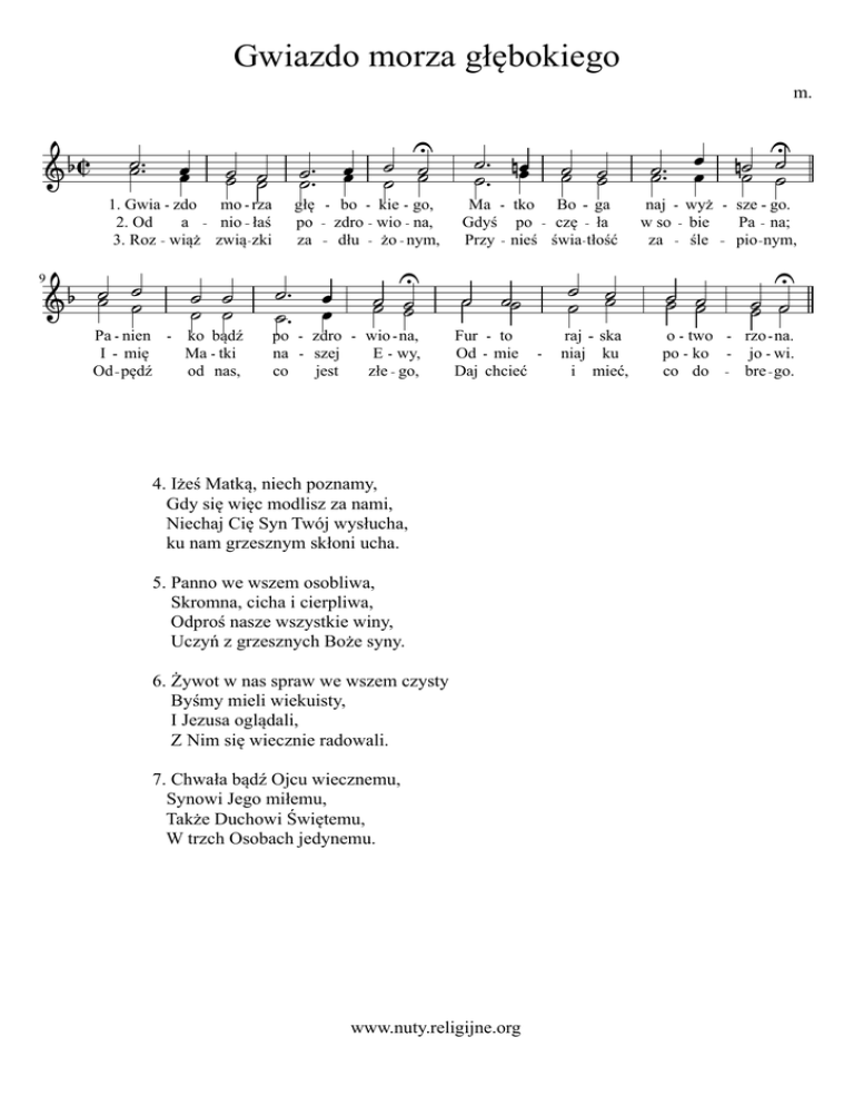 Gwiazdo morza głębokiego m. 1. Gwia zdo mo rza 2. Od a nio łaś 3. Roz wiąż zwią zki 9 Pa nien I mię Od pędź ko bądź Ma tki od nas, głę po za po na co bo kie go, zdro wio na, dłu żo nym, zdro szej jest wio na, E wy, złe go, Ma tko Bo ga Gdyś po czę ła Przy nieś świa tłość Fur to Od mie Daj chcieć 4. Iżeś Matką, niech poznamy, Gdy się więc modlisz za nami, Niechaj Cię Syn Twój wysłucha, ku nam grzesznym skłoni ucha. 5. Panno we wszem osobliwa, Skromna, cicha i cierpliwa, Odproś nasze wszystkie winy, Uczyń z grzesznych Boże syny. 6. Żywot w nas spraw we wszem czysty Byśmy mieli wiekuisty, I Jezusa oglądali, Z Nim się wiecznie radowali. 7. Chwała bądź Ojcu wiecznemu, Synowi Jego miłemu, Także Duchowi Świętemu, W trzch Osobach jedynemu. www.nuty.religijne.org raj ska niaj ku i mieć, naj wyż w so bie za śle sze go. Pa na; pio nym, o two po ko co do rzo na. jo wi. bre go.