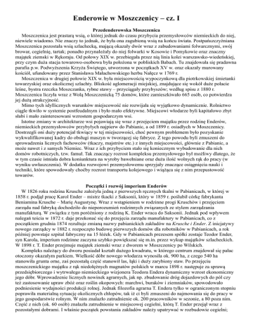 Enderowie w Moszczenicy – cz. I Przedenderowska Moszczenica Moszczenica jest prastarą wsią, o której jednak do czasu przybycia przemysłowców niemieckich do niej, niewiele wiadomo. Nie znaczy to jednak, że była ona zagubioną wsią na końcu świata. Postpańszczyźniana Moszczenica pozostała wsią szlachecką, mającą okazały dwór wraz z zabudowaniami folwarcznymi, swój browar, cegielnię, tartak; ponadto przynależały do niej folwarki w Kosowie i Pomykowie oraz znaczny majątek ziemski w Rękoraju. Od połowy XIX w. przebiegała przez nią linia kolei warszawsko-wiedeńskiej, przy czym duża stacja towarowo-osobowa była położona w pobliskich Babach. Tu znajdowała się pradawna parafia p.w. Podwyższenia Krzyża Świętego, utworzona w początkach XV w. oraz okazały murowany kościół, ufundowany przez Stanisława Małachowskiego herbu Nałęcz w 1769 r. Moszczenica w drugiej połowie XIX w. była miejscowością wypoczynkową dla piotrkowskiej śmietanki towarzyskiej oraz okolicznej szlachty. Bliskość aglomeracji miejskiej, znajdujące się wokół duże połacie leśne, bystra rzeczka Moszczanka, rybne stawy – przyciągały przybyszów; według spisu z 1880 r. Moszczenica liczyła wraz z Wolą Moszczenicką 75 domów, które zamieszkiwało 665 osób, co potwierdza jej dużą atrakcyjność. Mimo tych idyllicznych warunków miejscowość nie rozwijała się wyjątkowo dynamicznie. Rolnictwo ciągle tkwiło w systemie postfeudalnym i było mało efektywne. Miejscowi włodarze byli kapitałowo zbyt słabi i mało zainteresowani wzrostem gospodarczym wsi. Istotne zmiany w architekturze wsi pojawiają się wraz z przejęciem majątku przez rodzinę Enderów, niemieckich przemysłowców przybyłych najpierw do Pabianic, a od 1899 r. osiadłych w Moszczenicy. Dostrzegli oni duży potencjał tkwiący w tej miejscowości, choć pewnym problemem było pozyskanie wykwalifikowanej kadry do obsługi maszyn w tworzącej się fabryce. Z tego powodu byli zmuszeni do sprowadzenia licznych fachowców (tkaczy, majstrów etc.) z innych miejscowości, głównie z Pabianic, a może nawet i z samych Niemiec. Wraz z ich przybyciem stało się koniecznym wybudowanie dla nich domów robotniczych, tzw. famuł. Tak znaczący rozrost kompleksu przemysłowego był możliwy dlatego, że w tym czasie istniała dobra koniunktura na wyroby bawełniane oraz duża ilość wolnych rąk do pracy (w wyniku uwłaszczenia). W dodatku rozwojowi przemysłowemu sprzyjały znaczące osiągnięcia nauki i techniki, które spowodowały choćby rozrost transportu kolejowego i wiążąca się z nim przepustowość towarów. Początki i rozwój imperium Enderów W 1826 roku rodzina Krusche założyła jedną z pierwszych ręcznych tkalni w Pabianicach, w której w 1858 r. podjął pracę Karol Ender – mistrz tkacki z Saksonii, który w 1859 r. poślubił córkę fabrykanta Beniamina Krusche – Marię Augustynę. Wraz z wstąpieniem w rodzinne progi Kruschów i przejęciem zarządu nad fabryką dochodziło do nieporozumień rodzinnych związanych ze stylem zarządzania manufakturą. W związku z tym poróżniony z rodziną K. Ender wraca do Saksonii. Jednak pod wpływem nalegań teścia w 1872 r. daje przekonać się do przejęcia zarządu manufaktury w Pabianicach, co z początkiem grudnia 1874 rezultuje zmianą nazwy pabianickich zakładów na Krusche i Ender. Z inicjatywy nowego zarządcy w 1882 r. rozpoczęto budowę pierwszych domów dla robotników w Pabianicach, a rok później powstaje szpital fabryczny na 15 łóżek. Gdy w Pabianicach prezesem spółki zostaje Teodor Ender, syn Karola, imperium rodzinne zaczyna szybko powiększać się m.in. przez wykup majątków szlacheckich. W 1898 r. T. Ender przejmuje majątek ziemski wraz z dworem w Moszczenicy po Wilskich. Kompleks należący do dworu posiadał kształt dużego kwadratu, w którego centrum znajdował się pałac otoczony okazałym parkiem. Wielkość dóbr nowego włodarza wynosiła ok. 900 ha, z czego 540 ha stanowiła grunta orne, zaś pozostałą część stanowił las, łąki i duży zarybiony staw. Po przejęciu moszczenickiego majątku z rąk niedołężnych magnatów polskich w marcu 1898 r. następuje za sprawą przedsiębiorczego i wytrwałego niemieckiego wizjonera Teodora Endera dynamiczny wzrost ekonomiczny jego dóbr. Wprowadzenie licznych nowinek agrarnych, jak np. zbudowanie dróg dojazdowych do pól czy też zastosowanie upraw zbóż oraz roślin okopowych: marchwi, buraków i ziemniaków, spowodowało podniesienie wydajności produkcji rolnej. Jednak filozofia agrarna T. Endera tylko w ograniczonym stopniu poprawiła materialną sytuację okolicznych chłopów, tak iż ci byli zmuszeni do najmowania się do pracy w jego gospodarstwie rolnym. W nim znalazło zatrudnienie ok. 200 pracowników w sezonie, a 80 poza nim. Część z nich (ok. 60 osób) znalazła zatrudnienie w miejscowej cegielni, którą T. Ender przejął wraz z pozostałymi dobrami. I właśnie początek powstania zakładów należy upatrywać w rozbudowie cegielni; instalując w niej turbinę parową z piecem Hoffmana nastąpiło znaczne zwiększenie produkcji materiału budowlanego, co pozwoliło już na początku 1899 r. na budowę znacznej ilości budynków fabrycznych i gospodarczych, a już w czerwcu 1900 r. została uruchomiona przędzalnia bawełny i tkalnia. Ta produkcja pozwoliła zatrudnić około 650 pracowników. Produkcja bez zakłóceń trwała do czasu I wojny światowej, kiedy nastąpiło zablokowanie dostaw surowca i w związku z tym znaczne ograniczenie produkcji. Nastały trudne czasy dla pracowników, jednak fabrykant nie pozostawił ich samym sobie, tak że mogli oni znośnie przetrwać czas bessy. Dopiero na przełomie 1920/1921 r. zakład znowu ruszył pełną parą. Po śmierci T. Endera (2. VI 1921) fabryka przechodzi na własność dzieci, zmieniając nazwę na Moszczenicką Manufakturę Teodor Ender i Sukcesorzy. Śmierć twórcy mos