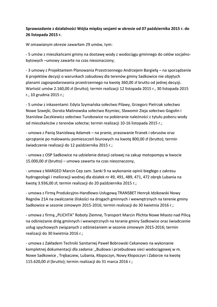 Sprawozdanie z działalności Wójta między sesjami w okresie od 07 października 2015 r. do 26 listopada 2015 r. W omawianym okresie zawarłam 29 umów, tym: - 5 umów z mieszkańcami gminy na dostawę wody z wodociągu gminnego do celów socjalnobytowych –umowy zawarte na czas nieoznaczony; - 3 umowy z Projektantem Planowania Przestrzennego Andrzejem Bargiełą – na sporządzenie 6 projektów decyzji o warunkach zabudowy dla terenów gminy Sadkowice nie objętych planami zagospodarowania przestrzennego na kwotę 360,00 zł brutto od jednej decyzji. Wartość umów 2.160,00 zł (brutto); termin realizacji 12 listopada 2015 r., 30 listopada 2015 r., 10 grudnia 2015 r.; - 5 umów z inkasentami: Edyta Szymańska sołectwo Pilawy, Grzegorz Pietrzak sołectwo Nowe Szwejki, Dorota Malinowska sołectwo Rzymiec, Sławomir Zieja sołectwo Gogolin i Stanisław Żaczkiewicz sołectwo Turobowice na pobieranie należności z tytułu poboru wody od mieszkańców z terenów sołectw; termin realizacji 10-16 listopada 2015 r.; - umowa z Panią Stanisławą Adamek – na pranie, prasowanie firanek i obrusów oraz sprzątanie po malowaniu pomieszczeń biurowych na kwotę 800,00 zł (brutto); termin świadczenie realizacji do 12 października 2015 r.; - umowa z OSP Sadkowice na udzielenie dotacji celowej na zakup motopompy w kwocie 15.000,00 zł (brutto) – umowa zawarta na czas nieoznaczony, - umowa z MARGEO Marcin Cep zam. Sanki 9 na wykonanie opinii biegłego z zakresu hydrogeologii i melioracji wodnej dla działek nr 49, 491, 489, 471, 472 obręb Lubania na kwotę 3.936,00 zł; termin realizacji do 20 października 2015 r.; - umowa z Firmą Produkcyjno-Handlowo-Usługową TRANSBET Henryk Idzikowski Nowy Regnów 21A na zwalczanie śliskości na drogach gminnych i wewnętrznych na terenie gminy Sadkowice w sezonie zimowym 2015-2016; termin realizacji do 30 kwietnia 2016 r.; - umowa z firmą „PLICHTA” Roboty Ziemne, Transport Marcin Plichta Nowe Miasto nad Pilicą na odśnieżanie dróg gminnych i wewnętrznych na teranie gminy Sadkowice oraz świadczenie usług spychowych związanych z odśnieżaniem w sezonie zimowym 2015-2016; termin realizacji do 30 kwietnia 2016 r.; - umowa z Zakładem Techniki Sanitarnej Paweł Bobrowski Cekanowo na wykonanie kompletnej dokumentacji dla zadania: „Budowa i przebudowa sieci wodociągowej w m. Nowe Sadkowice , Trębaczew, Lubania, Kłopoczyn, Nowy Kłopoczyn i Zaborze na kwotę 115.620,00 zł (brutto); termin realizacji do 31 marca 2016 r.; - 2 - umowa z Zarządem Powiatu Rawskiego w Rawie Mazowieckiej na udzielenie pomocy finansowej na realizację zadania inwestycyjnego: „Remont drogi powiatowej Nr 4118E Pukinin –Mogielnica oraz drogi powiatowej Nr 4123E”; termin realizacji – do końca 2016 r.; - umowa z firmą LTC Sp. z o.o. z Wielunia na licencję, obsługę i hosting modułu internetowego FINN 8 SQL moduł użytkowy Kancelaria z Platformą e-usług Publicznych; termin realizacji od 1 października 2015 r. do 30 września 2016 r.; - umowa z Panią Teresą Kajtaniak na przygotowanie lokalu Obwodowej Komisji Wyborczej Nr 3 w Kłopoczynie na wybory do Sejmu i Senatu RP na kwotę 100,00 zł (brutto); termin realizacji do 25 października 2015 r.; - umowa z Panią Aldoną Bors na przygotowanie lokalu Obwodowej Komisji Wyborczej Nr 2 w Lubani na wybory do Sejmu i Senatu RP na kwotę 100,00 zł (brutto); termin realizacji do 25 października 2015 r.; - umowa z Panem Andrzejem Ziółkowskim na prowadzenie zajęć w siłowni w Świetlicy Środowiskowej w Kłopoczynie na kwotę 2.025,00 zł (brutto); termin realizacji od 2 listopada 2015 do 23 grudnia 2015 r.; - umowa z Panem Andrzejem Ziółkowskim na otwieranie, sprzątanie oraz dbanie o sprzęt w siłowni w Kłopoczynie na kwotę 600,00 zł (brutto); termin realizacji od 2 listopada 2015 r. do 23 grudnia 2015 r.; - umowa z Panią Edytą Szymańską na inkaso podatku rolnego, leśnego i od nieruchomości; termin realizacji 10-16 listopada 2015 r.; - umowa z Panią Edytą Szymańską na pobór od mieszkańców sołectwa Pilawy opłat za gospodarowanie odpadami komunalnymi w drodze inkasa za wrzesień i październik 2015 r.; termin realizacji 9-16 listopada 2015 r.; - umowa z Panią Urszulą Pękalak na sprawowanie opieki nad uczniami dowożonymi do Zespołu Szkół w Sadkowicach zgodnie z harmonogramem; termin realizacji 5-13 listopada 2015 r.; - umowa z firmą Usługi Kucharskie SADYBA Lucyna Szcześniak Sadkowice 64 na przygotowanie 75 obiadów z własnych produktów dla gości zaproszonych na uroczystości związane z obchodami 71 Rocznicy Oddziału Leśnego „DZIK” na kwotę 2.835,00 zł (brutto); termin realizacji 29 listopada 2015 r.. W okresie od 7 października 2015 r. do 26 listopada 2015 r. wydałam 10 zarządzeń w następujących sprawach: - 5 zarządzeń w sprawie zmian w budżecie gminy na 2015 rok; - 3 - zarządzenie w sprawie wyznaczenia przedstawicieli w celu ochrony lokali obwodowych komisji wyborczych w czasie przerwy w glosowaniu spowodowanej nadzwyczajnymi wydarzeniami w wyborach do Sejmu i Senatu RP, zarządzonych na dzień 25 października 2015 r.; - zarządzenie w sprawie ustanowienia pełnomocnika do spraw wyborów – urzędnika wyborczego Gminy Sadkowice; - zarządzenie w sprawie powołania Komisji Rekrutacyjnej do przeprowadzenia naboru na stanowisko urzędnicze w Urzędzie Gminy w Sadkowicach; - zarządzenie w sprawie przeprowadzenia konsultacji z organizacjami pozarządowymi i podmiotami wymienionymi w art. 3 ust.3 ustawy z dnia 24 kwietnia 2003 r. o działalności pożytku publicznego i o wolontariacie, projektu rocznego programu współpracy Gminy Sadkowice z organizacjami pozarządowymi i innymi organizacjami prowadzącymi działalność pożytku publicznego w 2016 roku; - zarządzenie w sprawie powołania Komisji Przetargowej oraz wskazania Przewodniczącego i Sekretarza Komisji do przeprowadzenia postępowania o udzielenie zamówienia publicznego pn. „Zakup energii