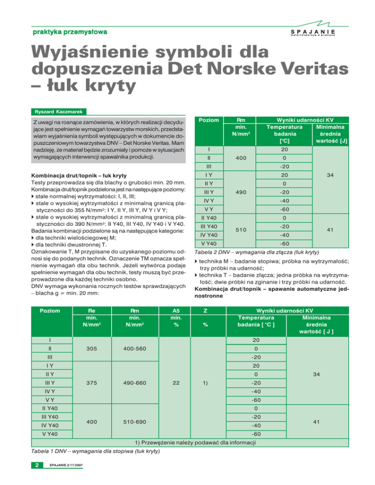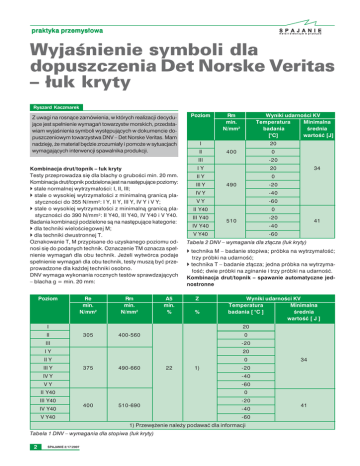 praktyka przemysłowa Wyjaœnienie symboli dla dopuszczenia Det Norske Veritas – ³uk kryty Ryszard Kaczmarek Z uwagi na rosnące zamówienia, w których realizacji decydujące jest spełnienie wymagań towarzystw morskich, przedstawiam wyjaśnienia symboli występujących w dokumencie dopuszczeniowym towarzystwa DNV – Det Norske Veritas. Mam nadzieję, że materiał będzie zrozumiały i pomoże w sytuacjach wymagających interwencji spawalnika produkcji. Poziom III -20 Kombinacja drut/topnik – łuk kryty Testy przeprowadza się dla blachy o grubości min. 20 mm. Kombinacja drut/topnik podzielona jest na następujące poziomy: stale normalnej wytrzymałości: I, II, III; stale o wysokiej wytrzymałości z minimalną granicą plastyczności do 355 N/mm2: I Y, II Y, III Y, IV Y i V Y; stale o wysokiej wytrzymałości z minimalną granicą plastyczności do 390 N/mm2: II Y40, III Y40, IV Y40 i V Y40. Badania kombinacji podzielone są na następujące kategorie: dla techniki wielościegowej M; dla techniki dwustronnej T. Oznakowanie T, M przypisane do uzyskanego poziomu odnosi się do podanych technik. Oznaczenie TM oznacza spełnienie wymagań dla obu technik. Jeżeli wytwórca podaje spełnienie wymagań dla obu technik, testy muszą być przeprowadzone dla każdej techniki osobno. DNV wymaga wykonania rocznych testów sprawdzających – blacha g = min. 20 mm: IY 20 II Y 0 Poziom Re min. N/mm2 Rm min. N/mm2 A5 min. % Wyniki udarności KV Temperatura Minimalna badania średnia [°C] wartość [J] I II III Y 20 400 0 490 -40 VY -60 II Y40 0 III Y40 -20 510 IV Y40 -40 V Y40 -60 technika M – badanie stopiwa; próbka na wytrzymałość; trzy próbki na udarność; technika T – badanie złącza; jedna próbka na wytrzymałość; dwie próbki na zginanie i trzy próbki na udarność. Kombinacja drut/topnik – spawanie automatyczne jednostronne Z % Wyniki udarności KV Temperatura Minimalna badania [ °C ] średnia wartość [ J ] 20 305 400-560 0 -20 IY 20 II Y 0 375 490-660 22 1) -40 VY -60 II Y40 0 III Y40 -20 400 510-690 V Y40 -40 -60 1) Przewężenie należy podawać dla informacji Tabela 1 DNV – wymagania dla stopiwa (łuk kryty) 2 SPAJANIE 2/17/2007 34 -20 IV Y IV Y40 41 Tabela 2 DNV – wymagania dla złącza (łuk kryty) III III Y 34 -20 IV Y I II Rm min. N/mm2 41 praktyka przemysłowa Rozciąganie Poziom Złącze Re min. N/mm2 Udarność Stopiwo Rm min. N/mm2 A5 min. % I II Temperatura badania [°C] 400 305 400 - 560 0 III -20 20 II Y 0 490 375 490 - 660 22 -40 VY -60 II Y40 0 510 400 -20 510 - 690 34 -20 IV Y III Y40 Minimalna średnia wartość [J] 20 IY III Y KV IV Y40 -40 V Y40 -60 41 Tabela 3 DNV – wymagania dla spawania jednostronnego (łuk kryty) Testy przeprowadza się dla blachy o grubości > 20 mm. Poziomy występujące w tej technice spawania są takie same jak wymienione wyżej. Badania należy wykonać dla: spawania jednościegowego; spawania wielościegowego (obejmującego technikę dwustronną T).❚ dr inż. Ryszard Kaczmarek Multimet Sp. z o.o. reklama 1/2 SPAJANIE 2/17/2007 3